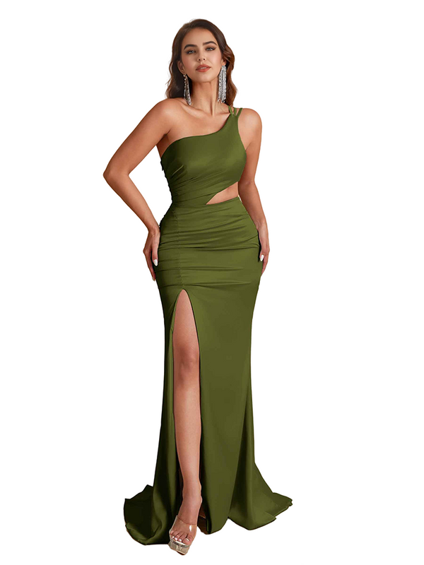 Unique One Shoulder Side Split Mermaid Silky Satin Long Bridesmaid Dresses Online