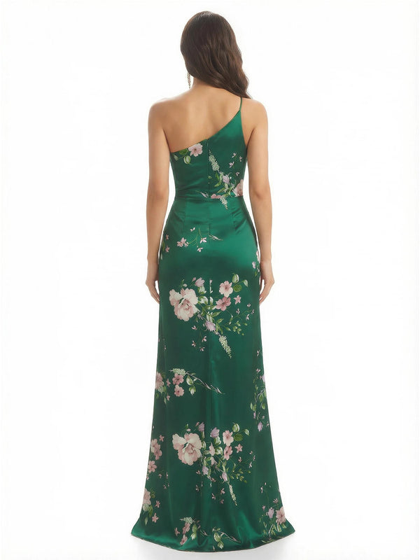 Elegant One Shoulder Mermaid Long Satin Floral Formal Dresses For Women
