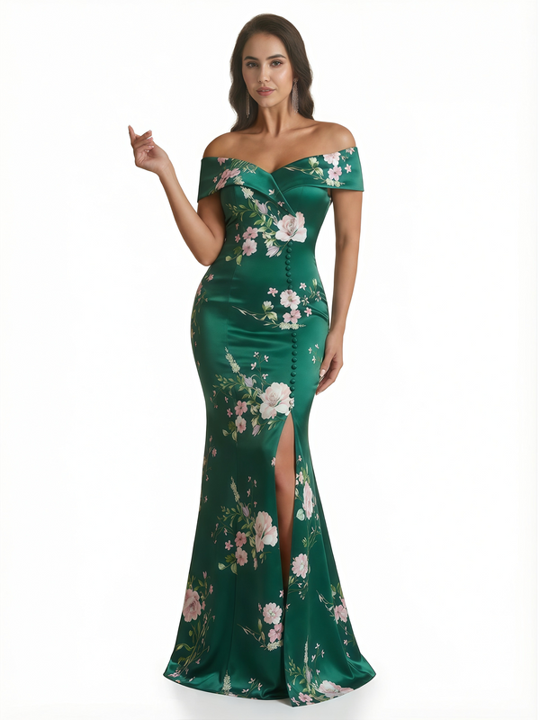 Sexy Off Shoulder Mermaid Long Satin Floral Formal Dresses For Women
