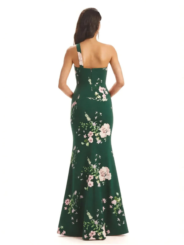 Sexy One Shoulder Side Slit Mermaid Satin Floral Formal Dresses For Women