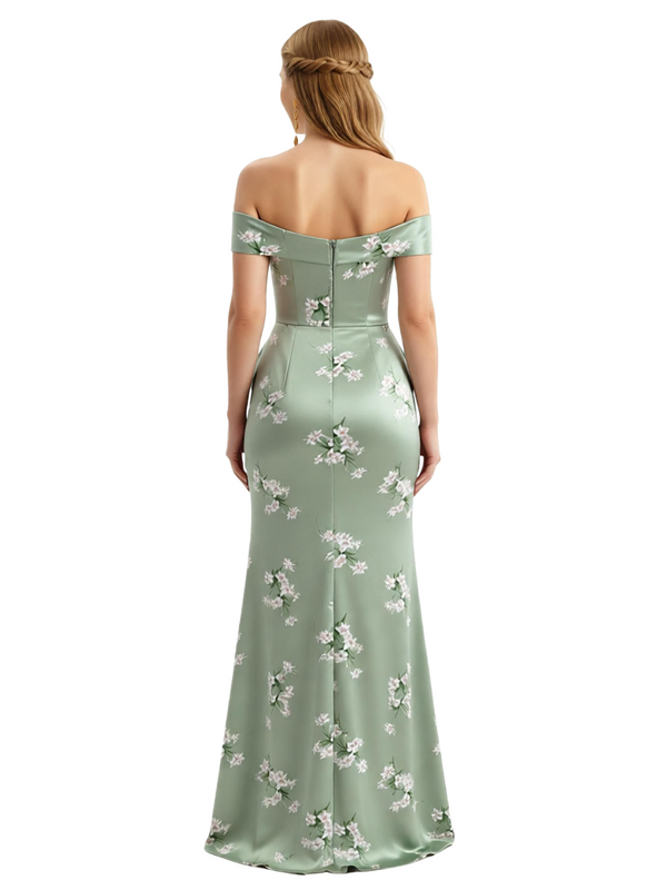 Simple Off Shoulder Side Slit Mermaid Long Satin Floral Formal Evening Dresses For Ladies