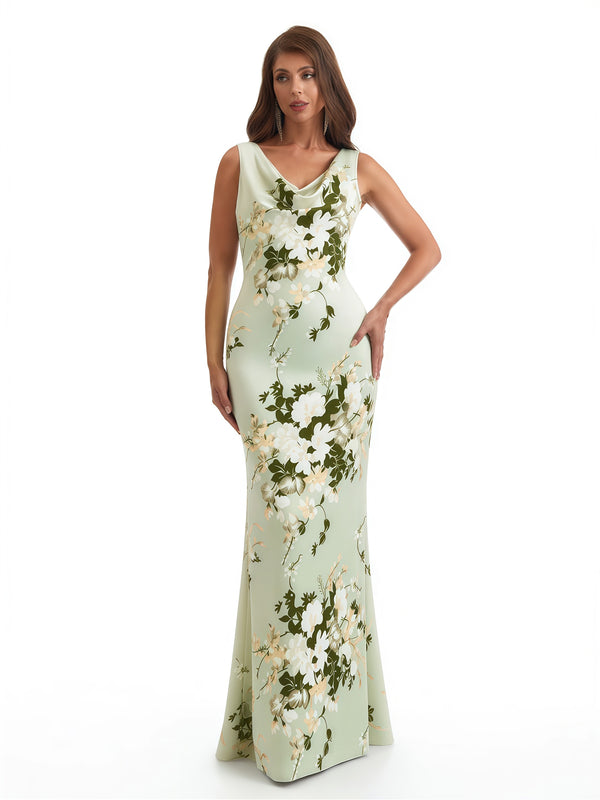 Elegant Spaghetti Straps Cowl Mermaid Long Satin Floral Formal Evening Dresses For Ladies