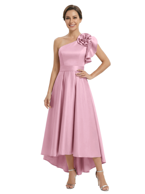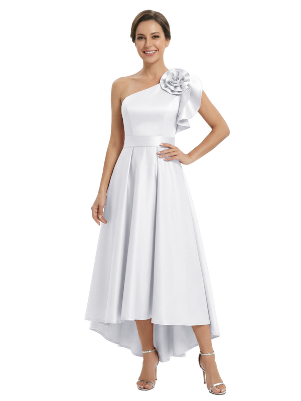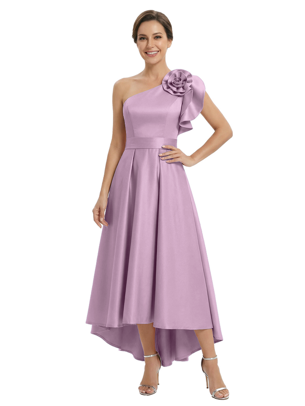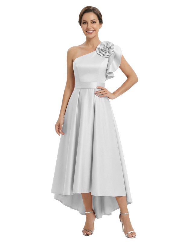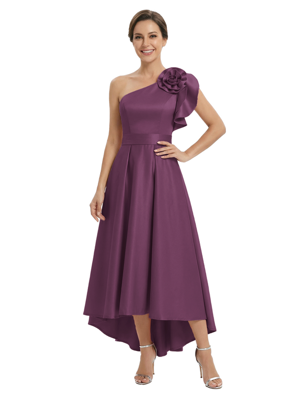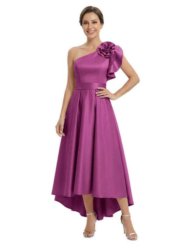 Unique One Shoulder High-Low Satin A-Line Mother Of The Bride Dress Floral Ruffle