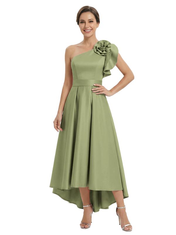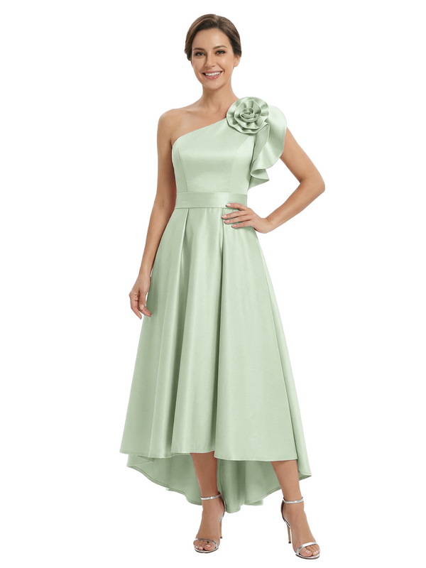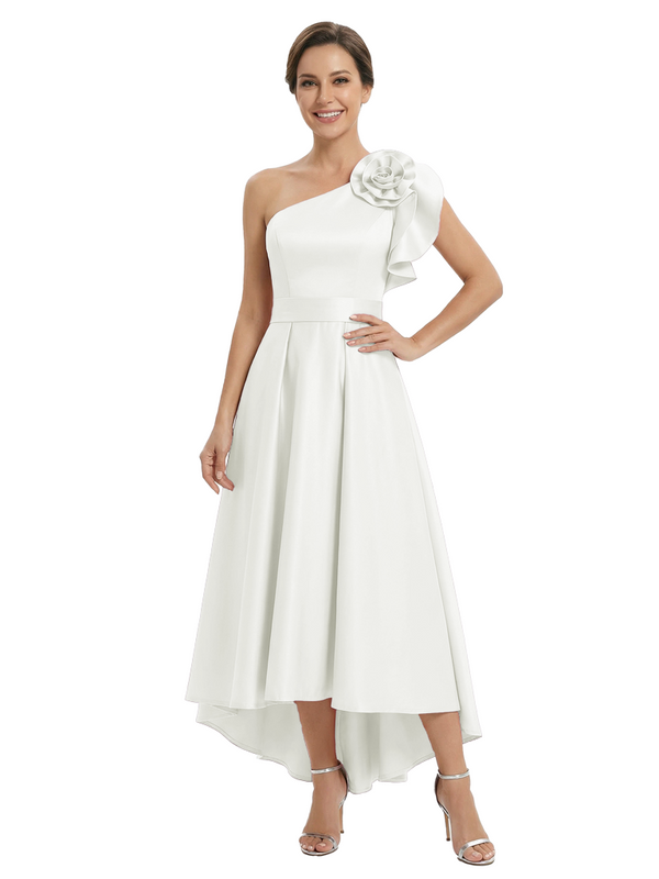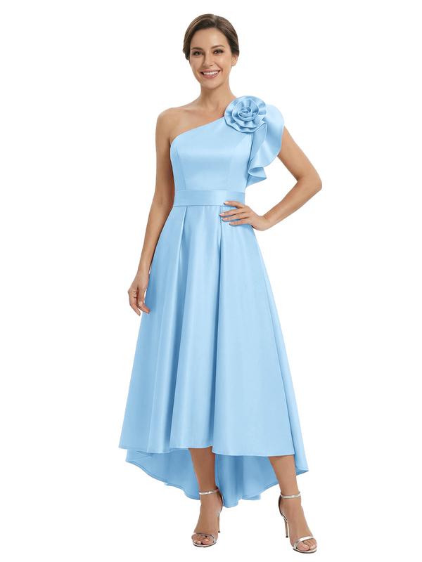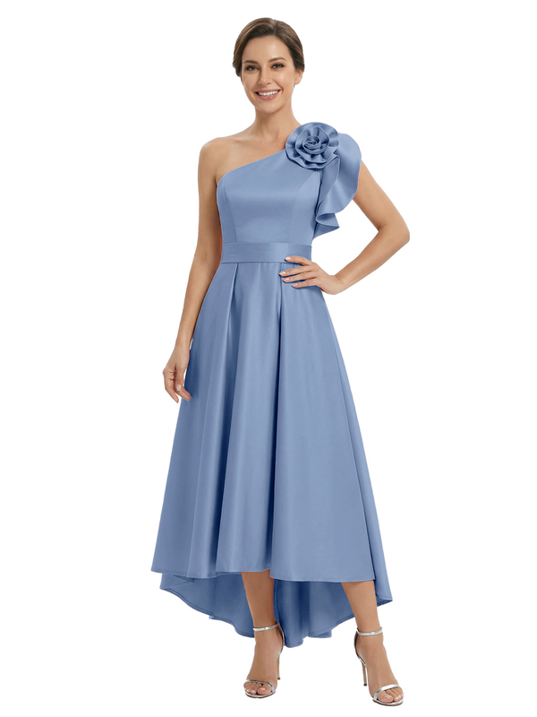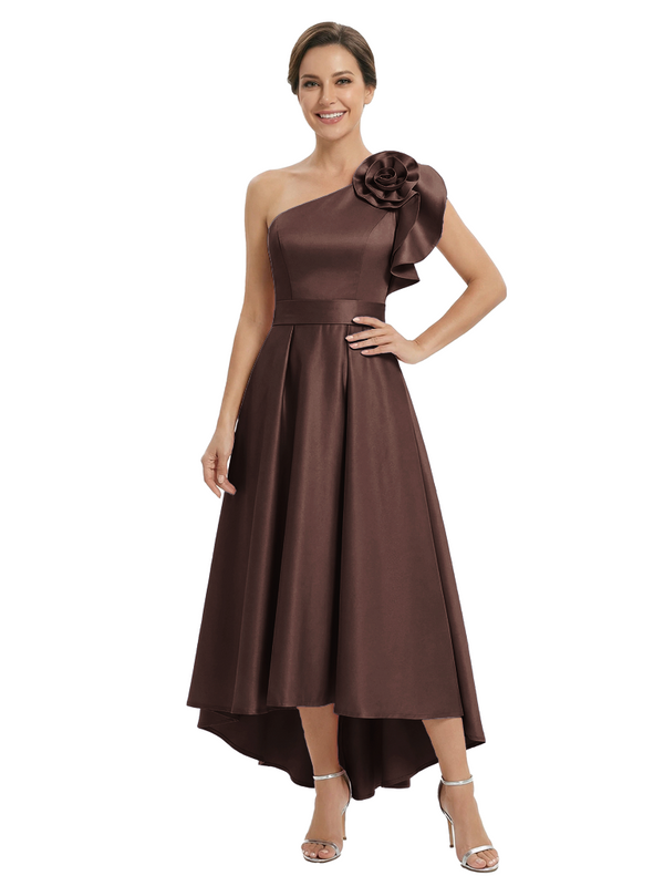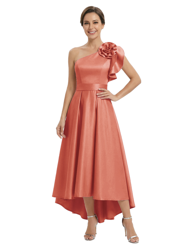 Unique One Shoulder High-Low Satin A-Line Mother Of The Bride Dress Floral Ruffle