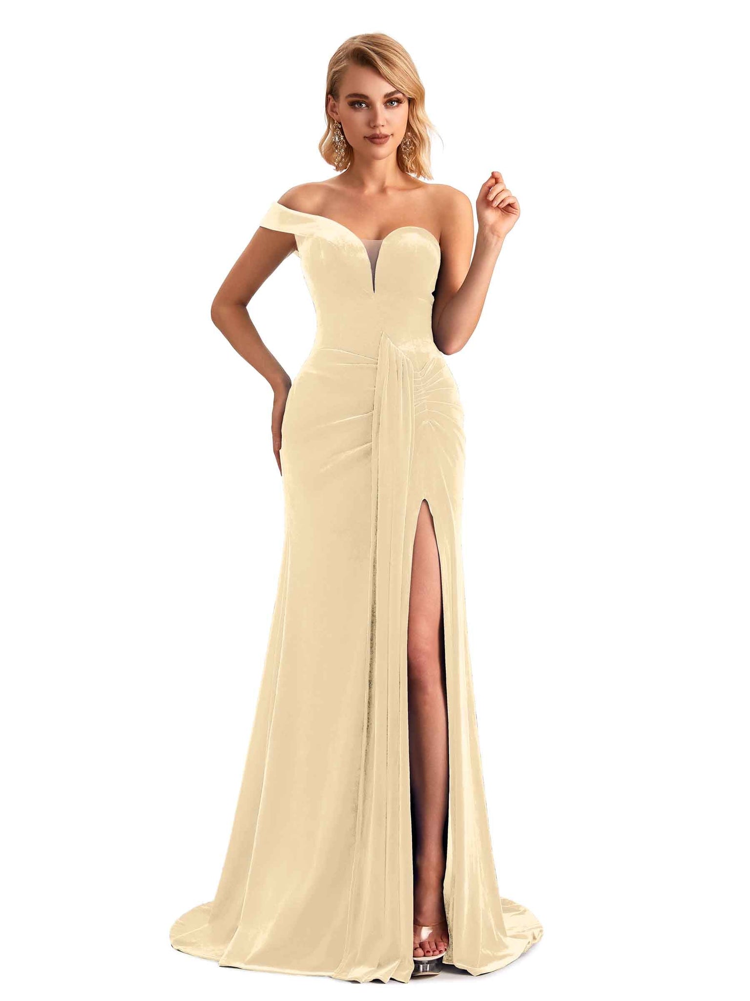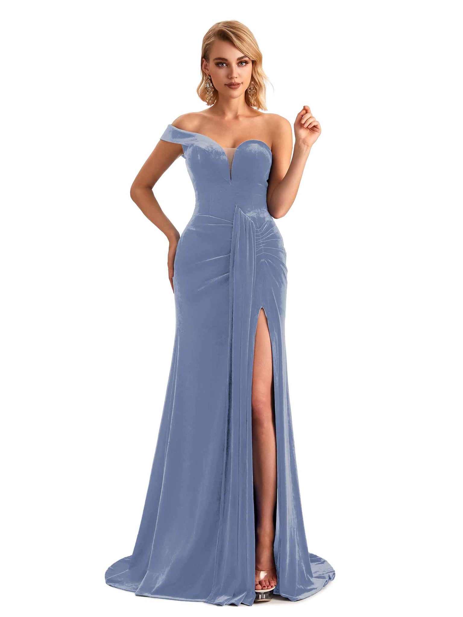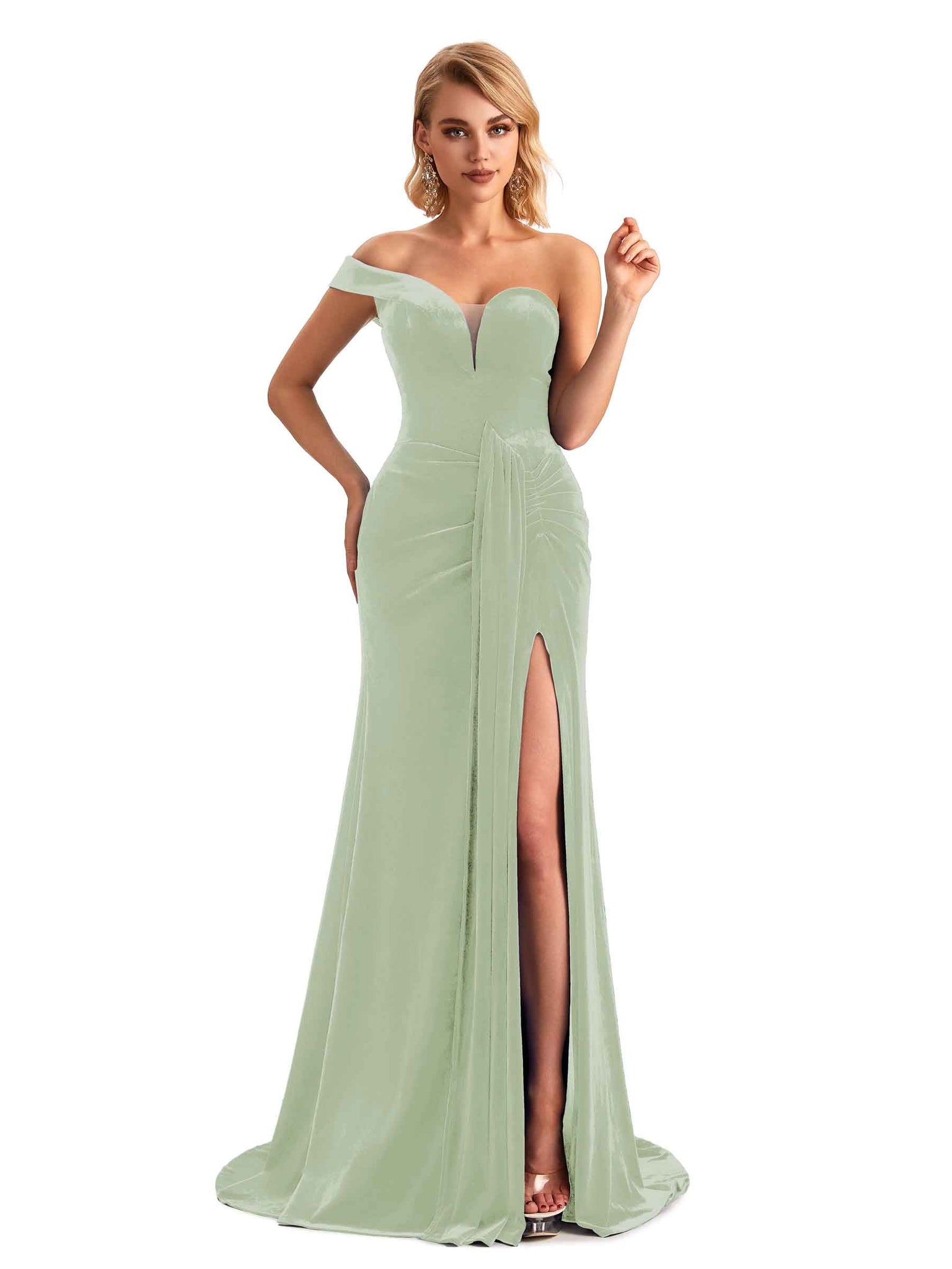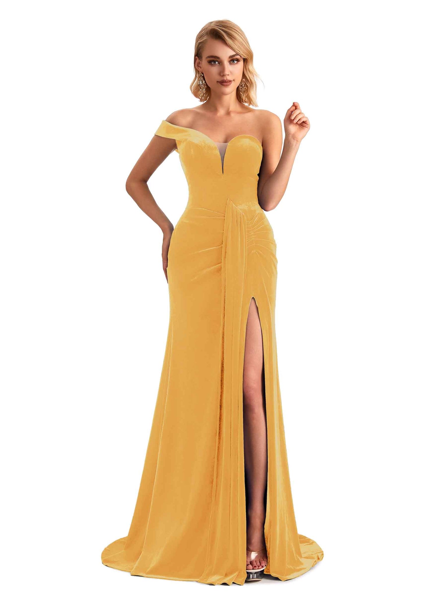 Sexy Side Slit Mermaid One Shoulder Velvet Long Bridesmaid Dresses