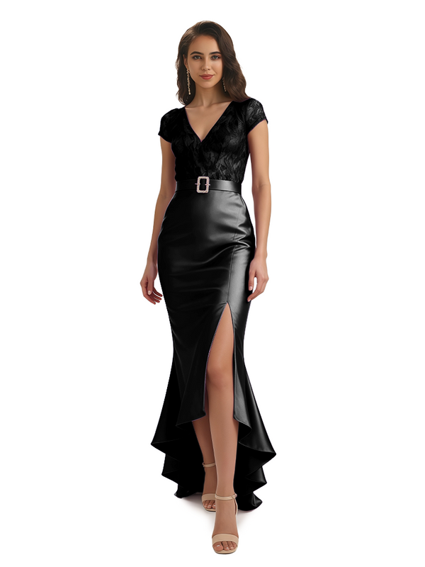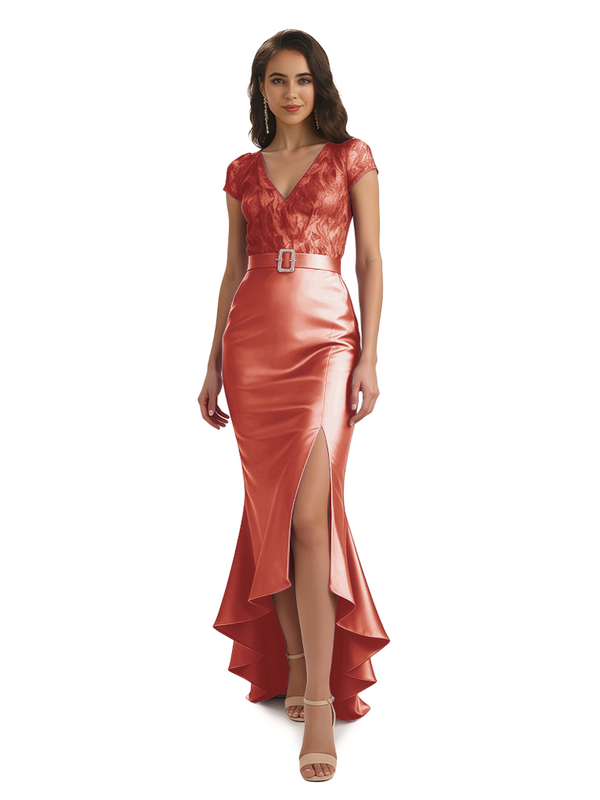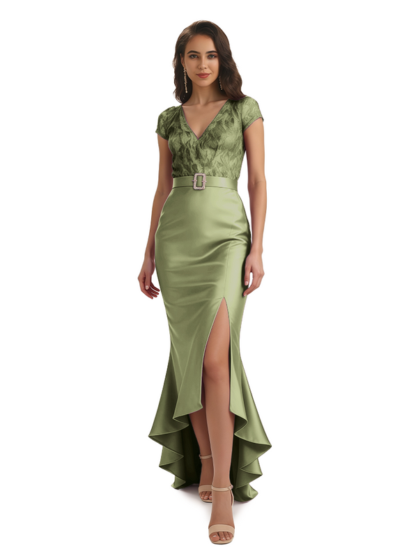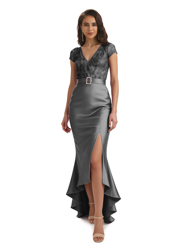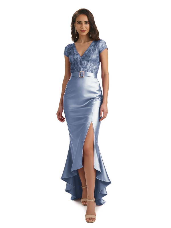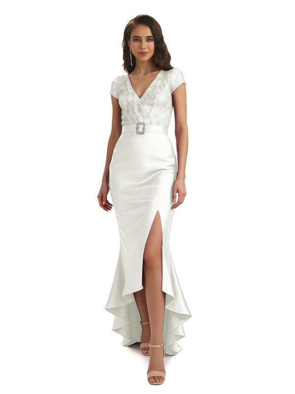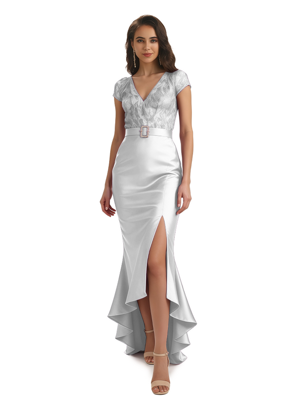 Elegant Short Sleeves Silky Satin Side Slit High-Low Long Formal Evening Dresses For Women