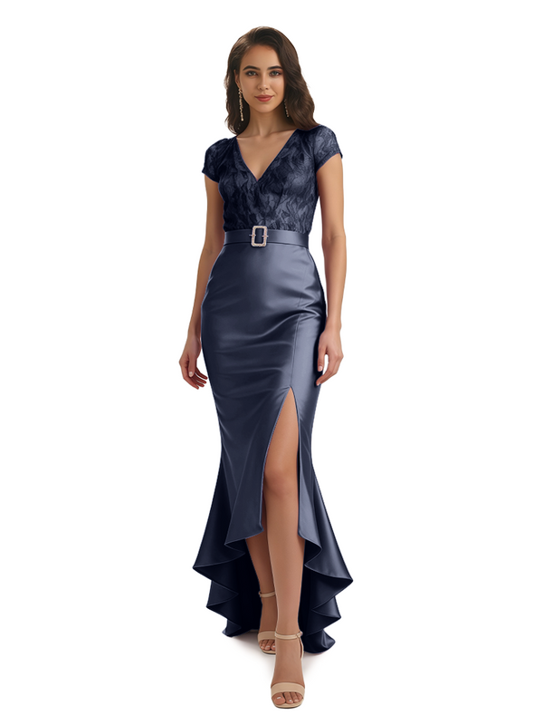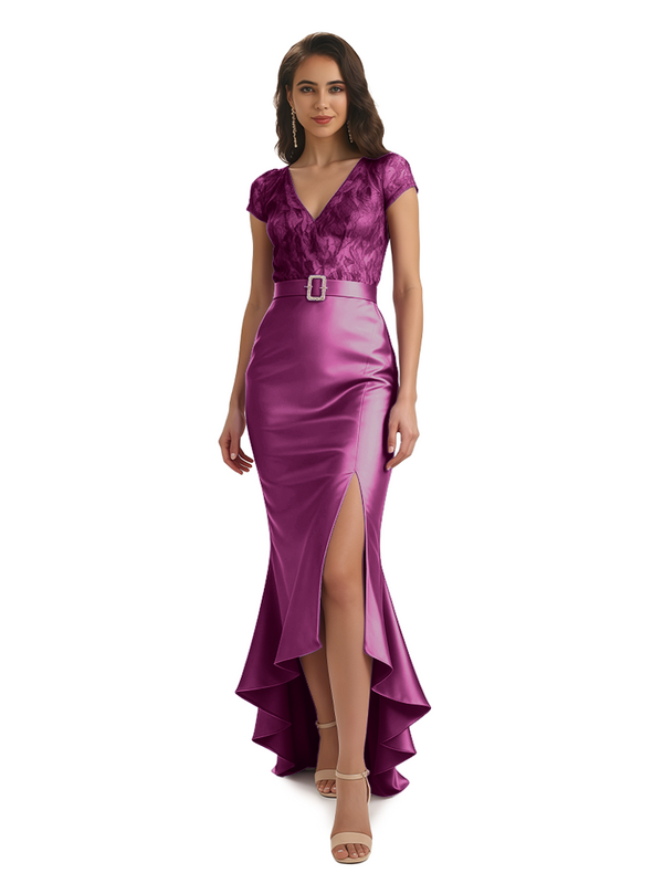 Elegant Short Sleeves Silky Satin Side Slit High-Low Long Formal Evening Dresses For Women $149.99