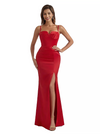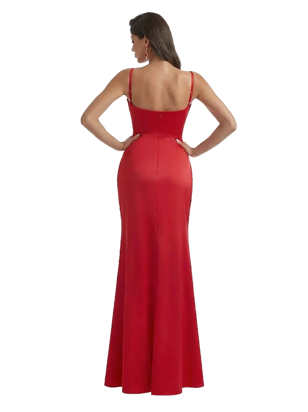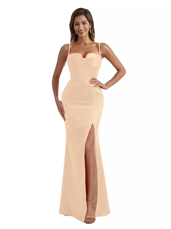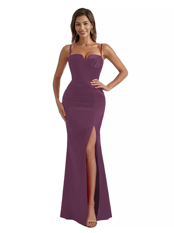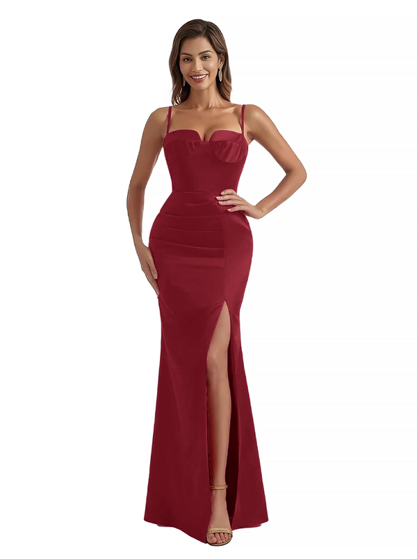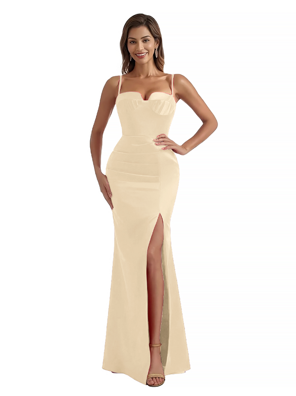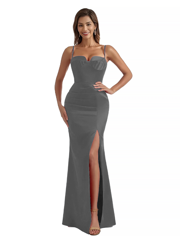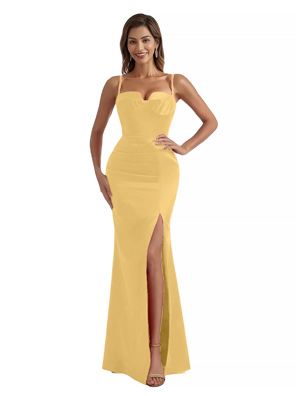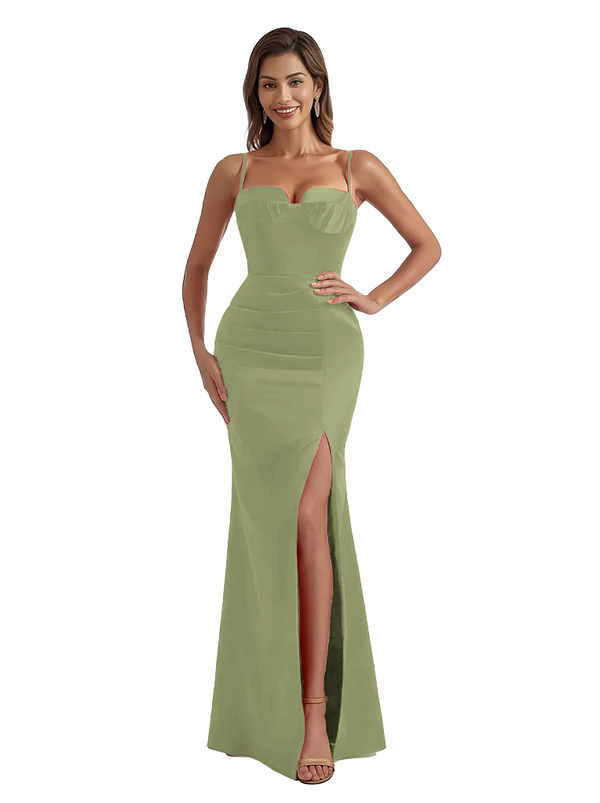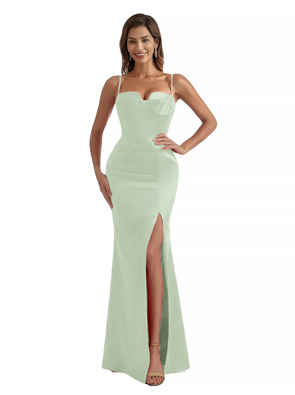 Sexy Spaghetti Straps Silky Satin Mermaid Long Formal Dresses Side Slit