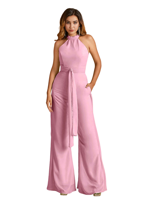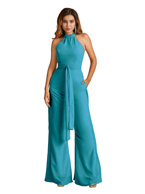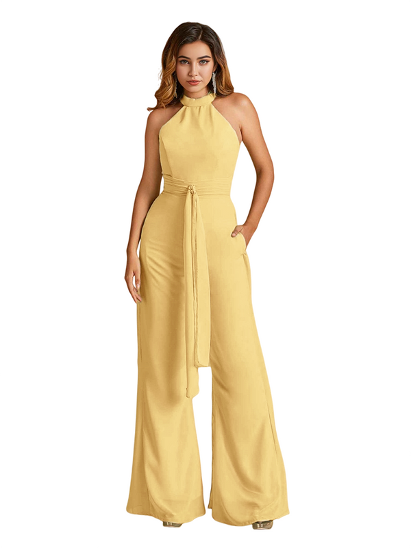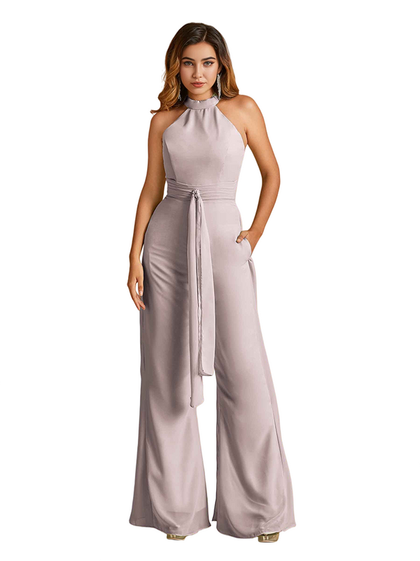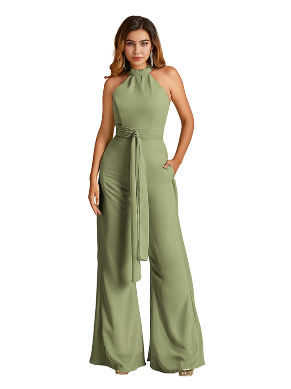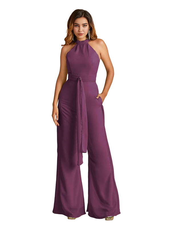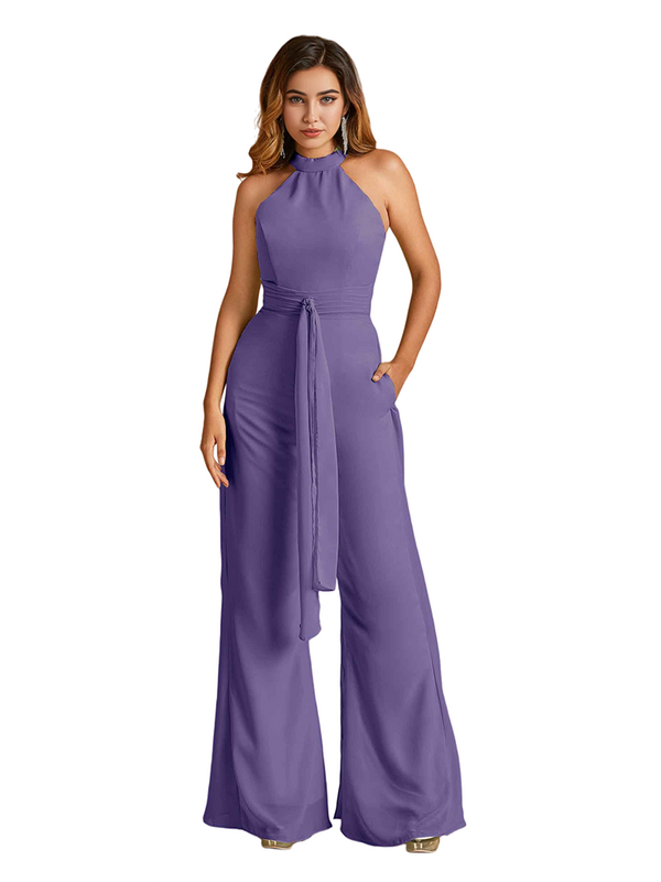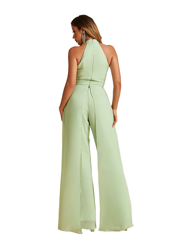 Elegant High Neck Chiffon Long Women's Pantsuit Jumpsuit For Bridesmaids