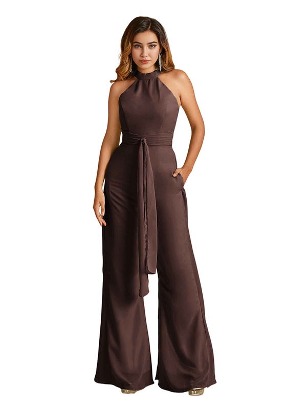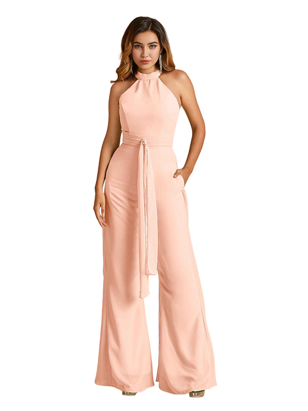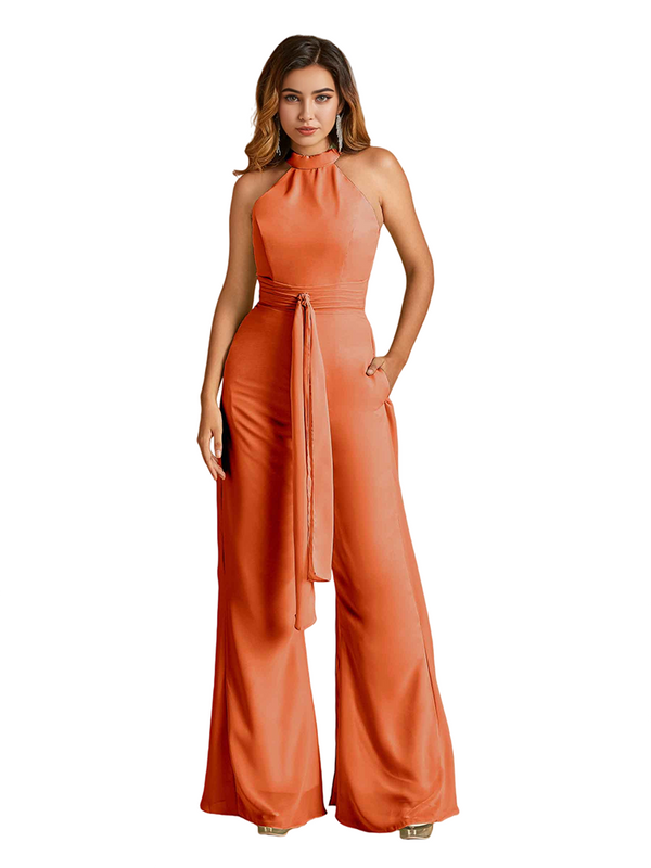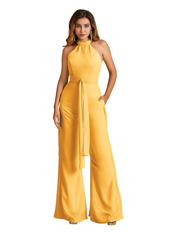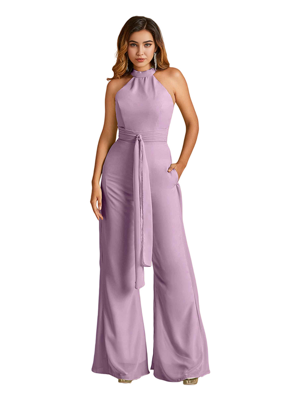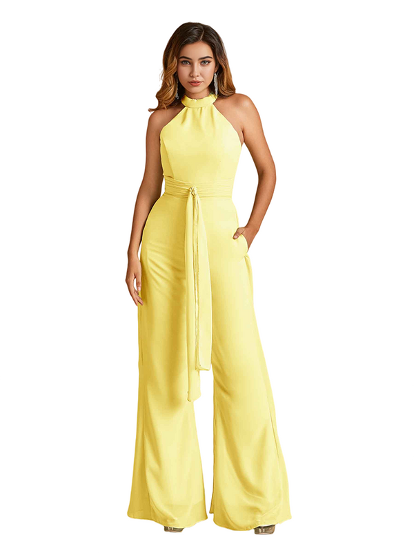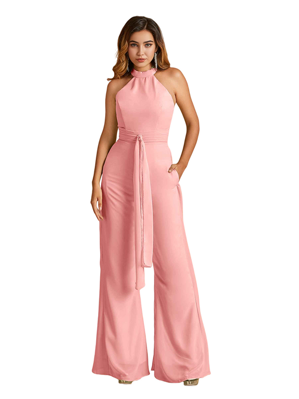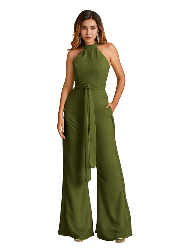 Elegant High Neck Chiffon Long Women's Pantsuit Jumpsuit For Bridesmaids