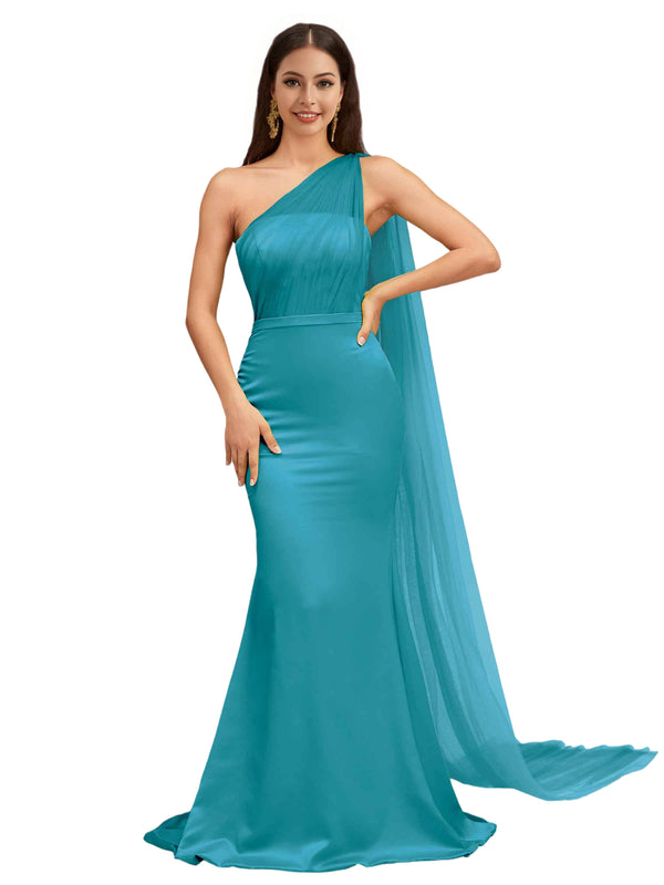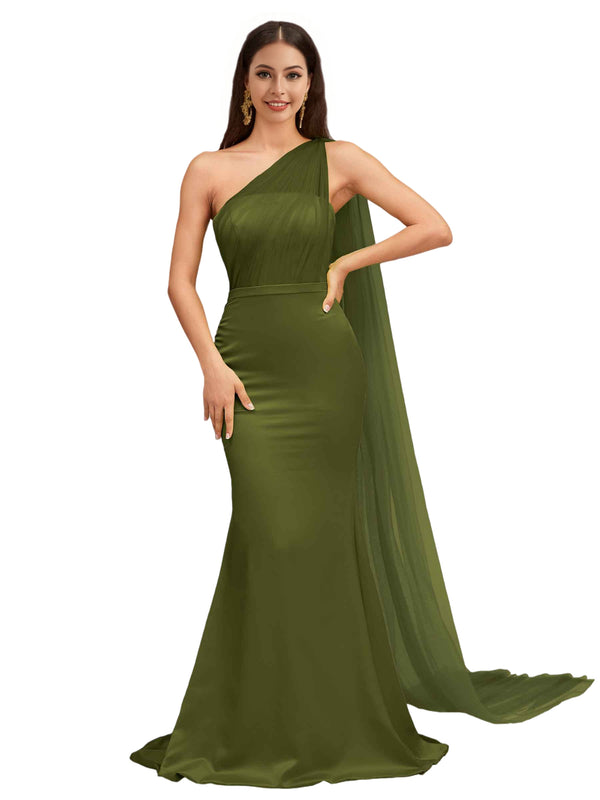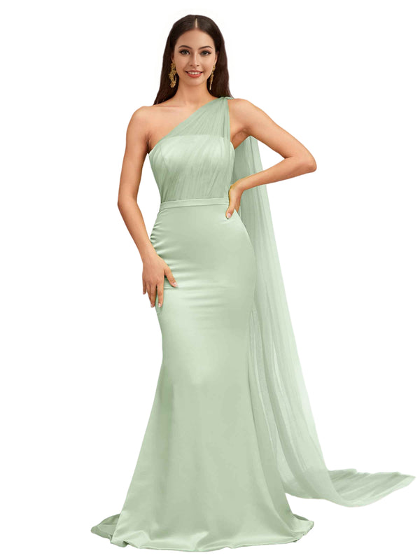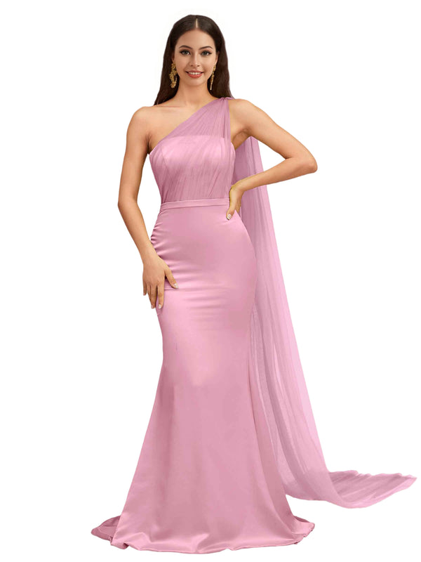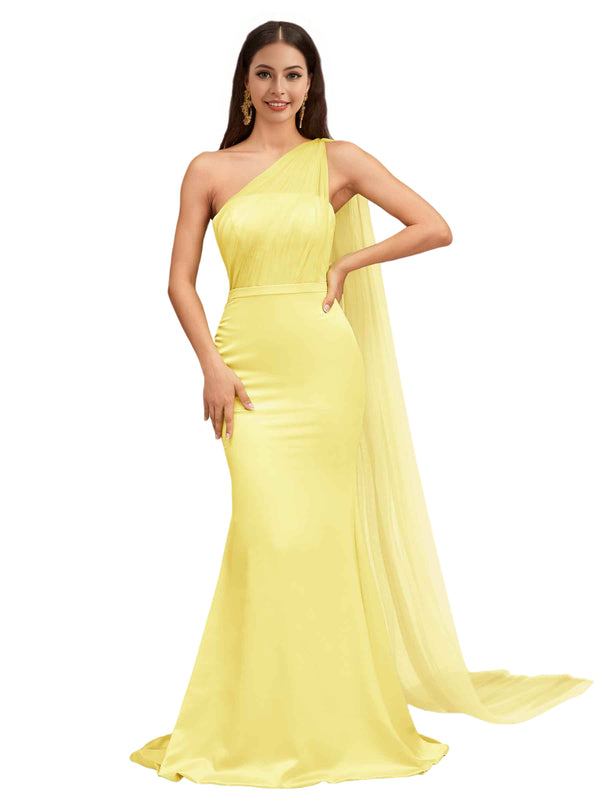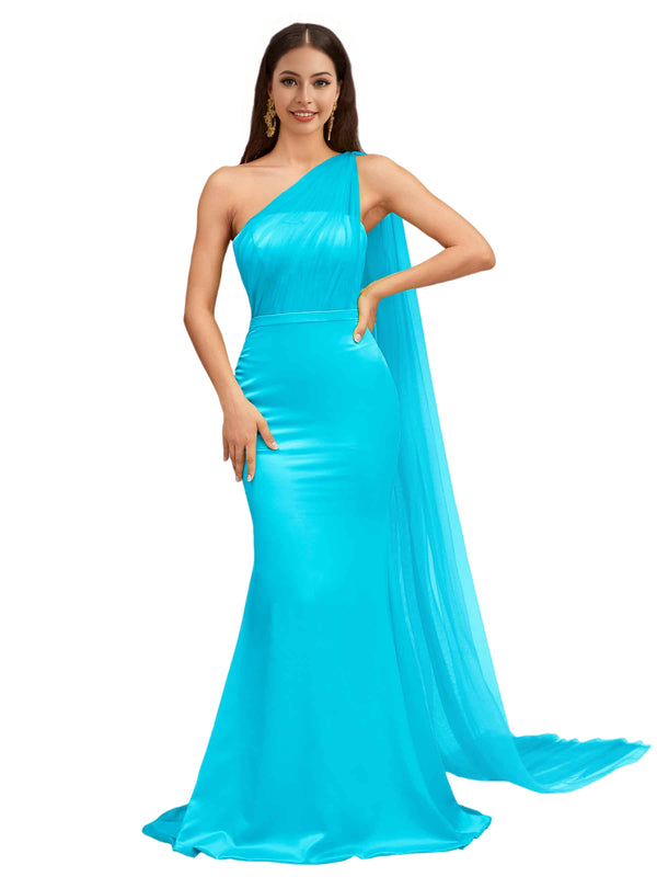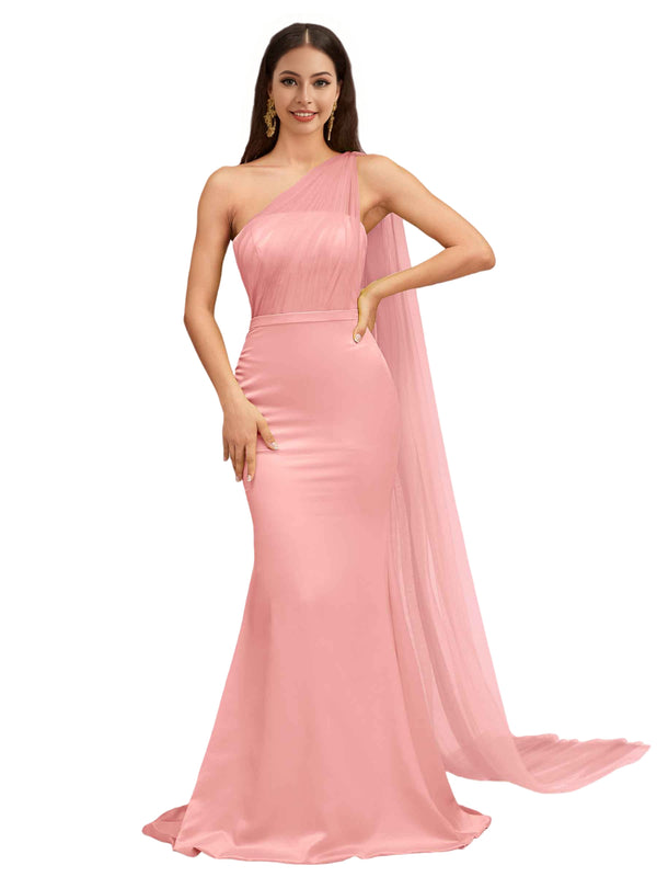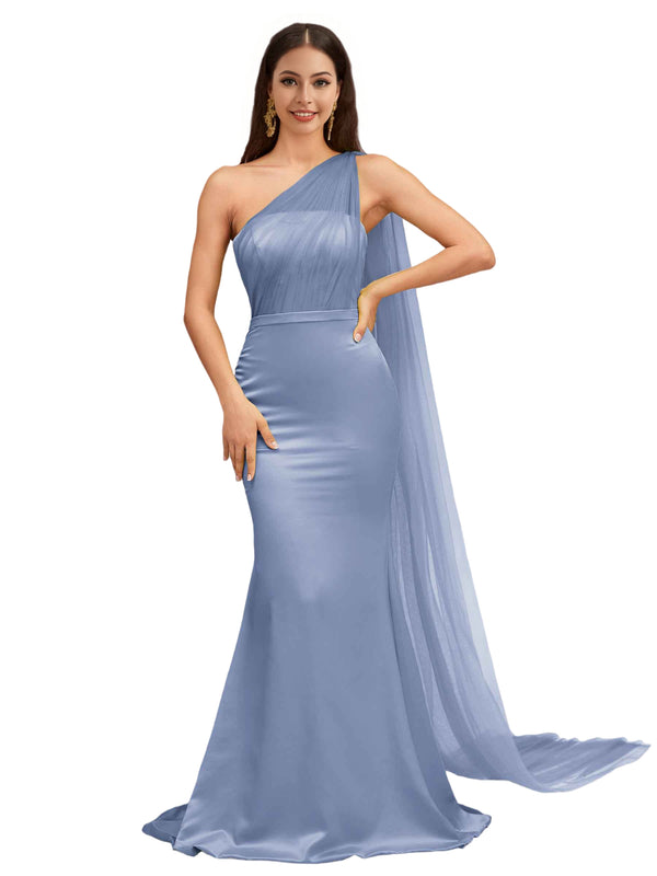 Elegant Mermaid One Shoulder Zipper Back Soft Satin Long Bridesmaid Dresses