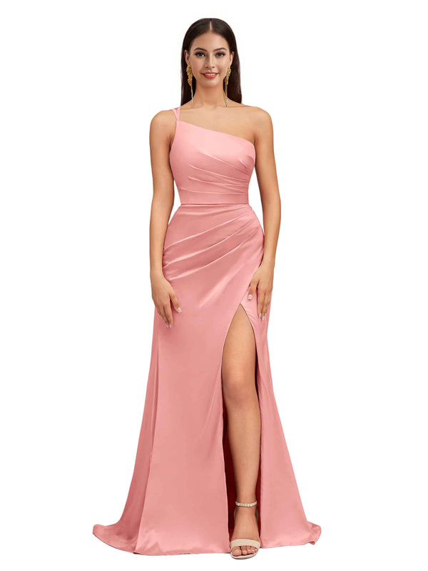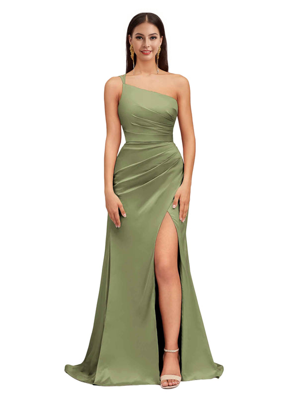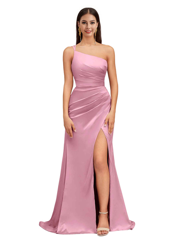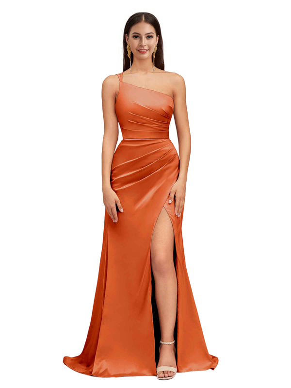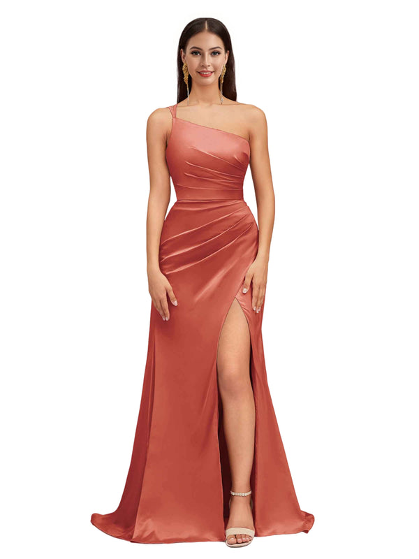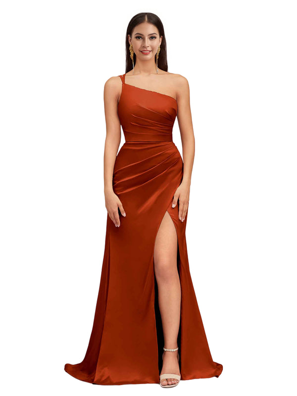 Elegant Mermaid One Shoulder Stretch Satin Side Slit Formal Long Bridesmaid Dresses