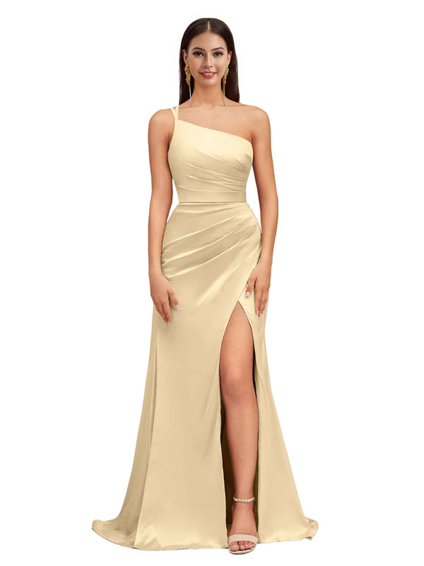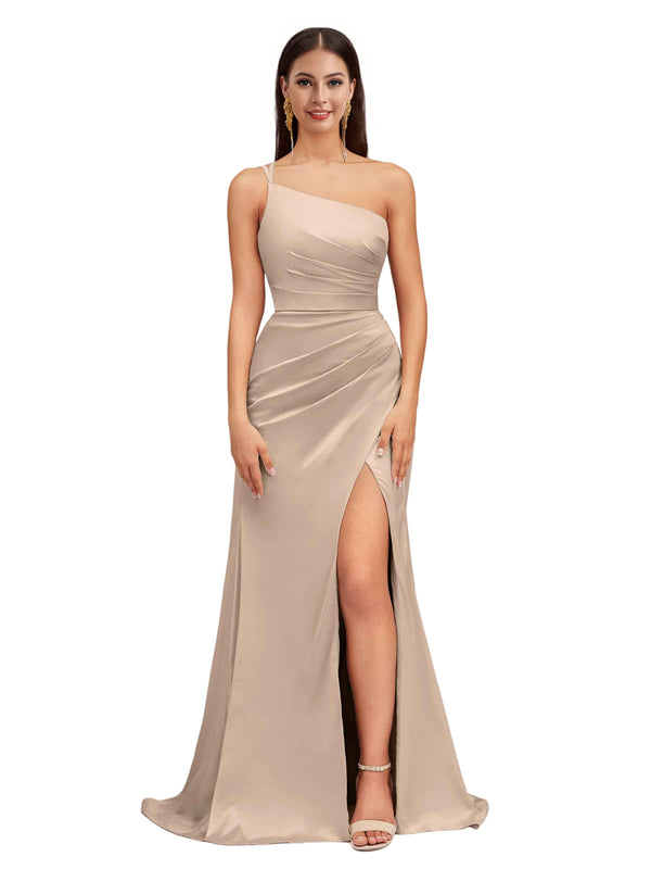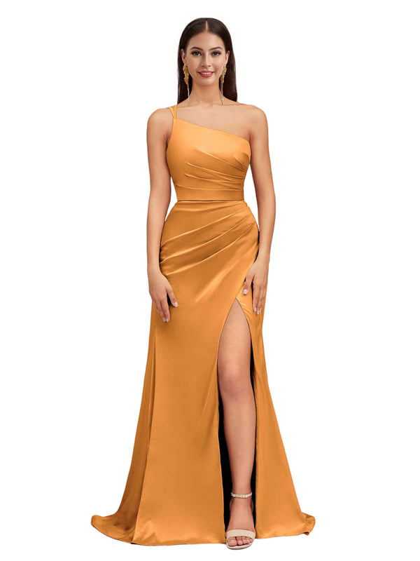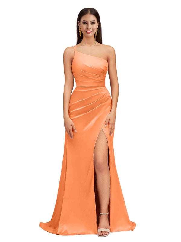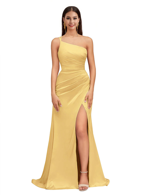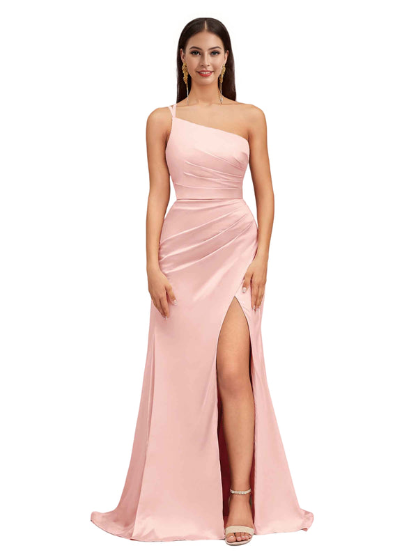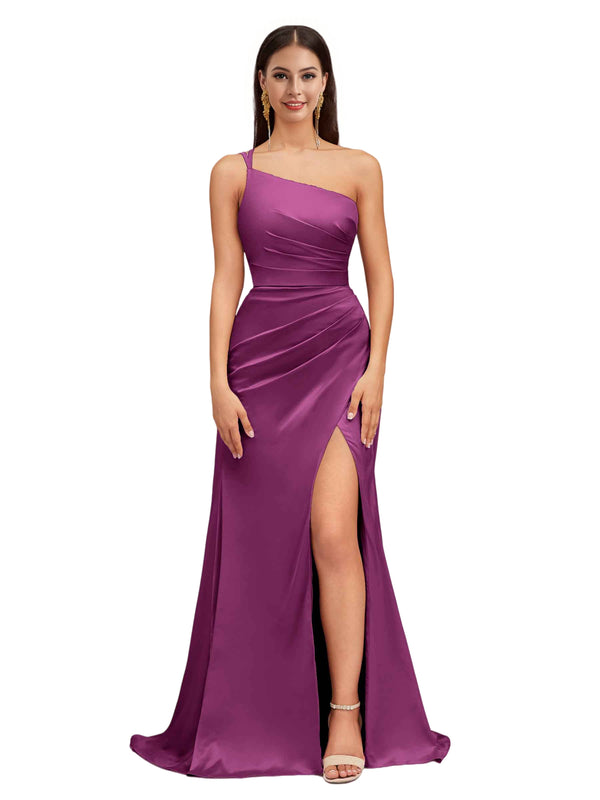 Elegant Mermaid One Shoulder Stretch Satin Side Slit Formal Long Bridesmaid Dresses