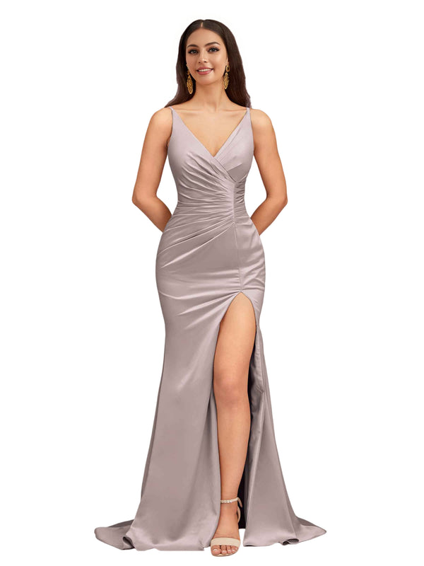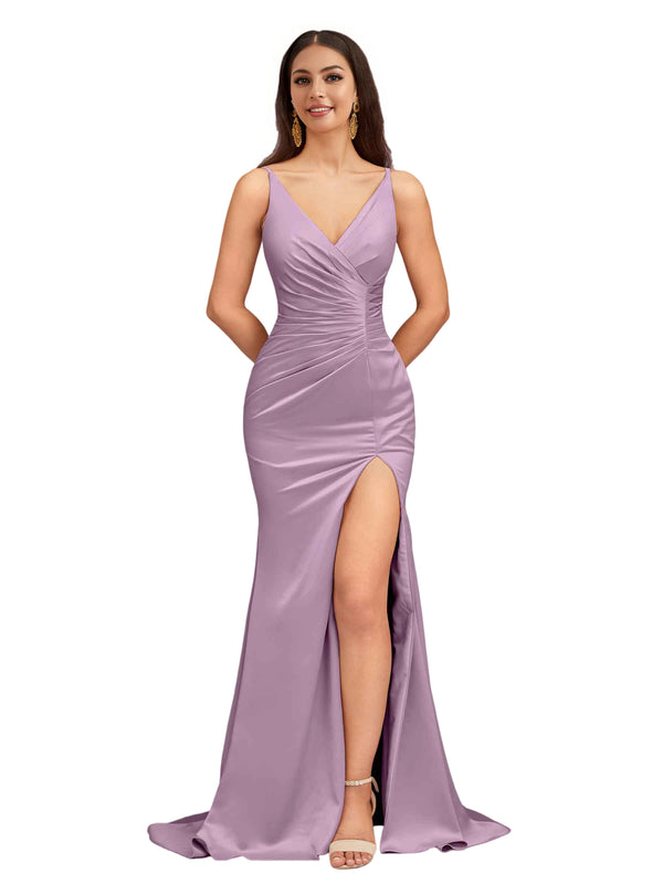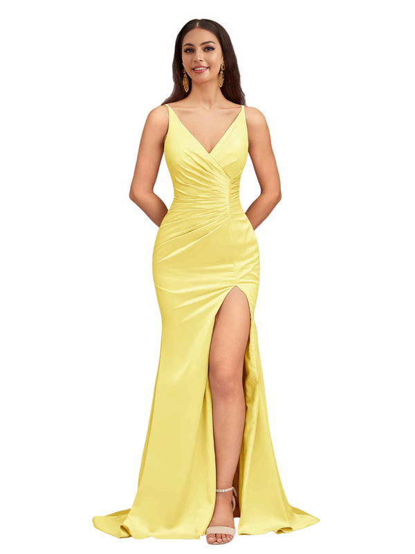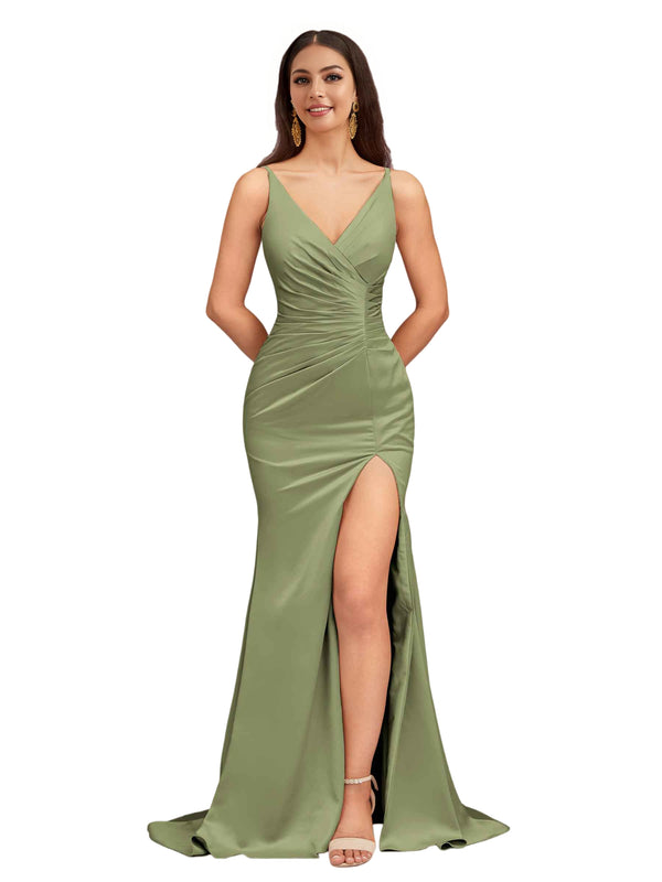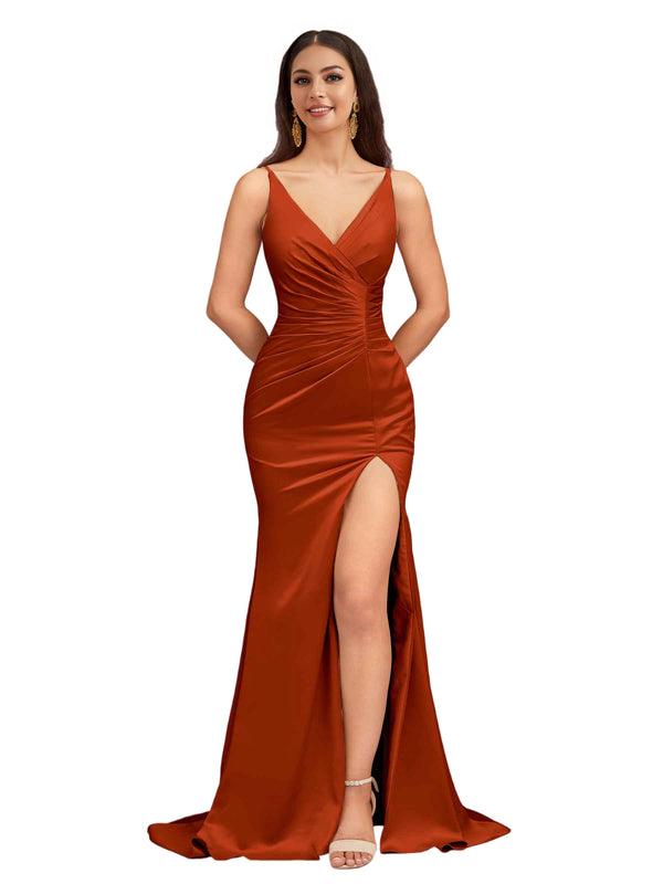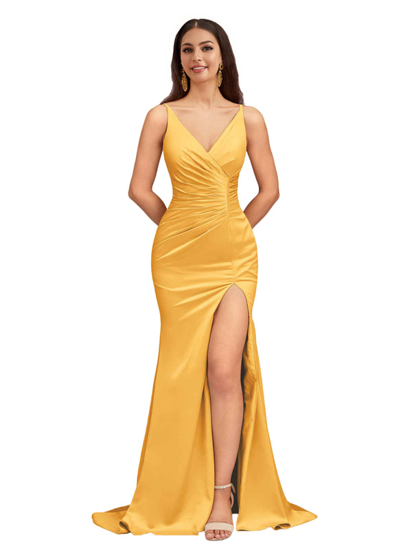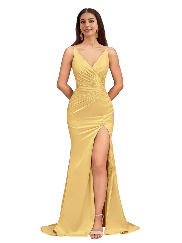 Elegant Spaghetti Straps V-Neck Side Slit Mermaid Stretch Satin Long Bridesmaid Dresses