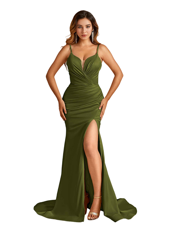Women's Ruched Mermaid Satin Long Wedding Bridesmaid Dresses Slit
