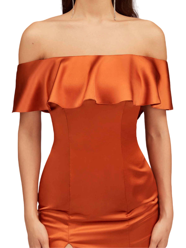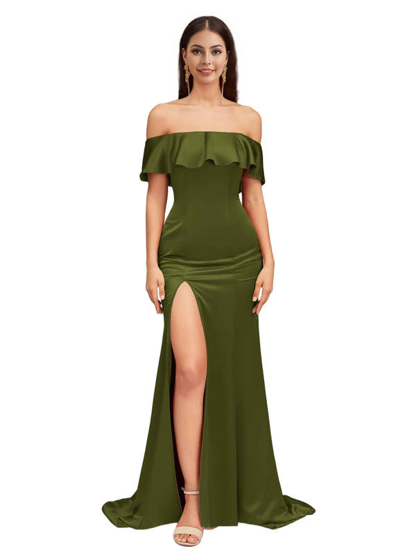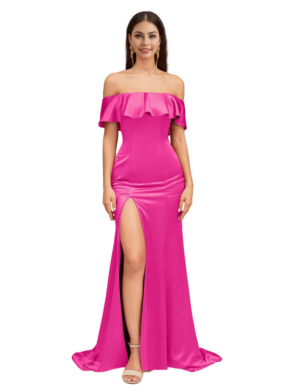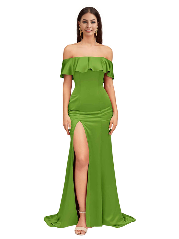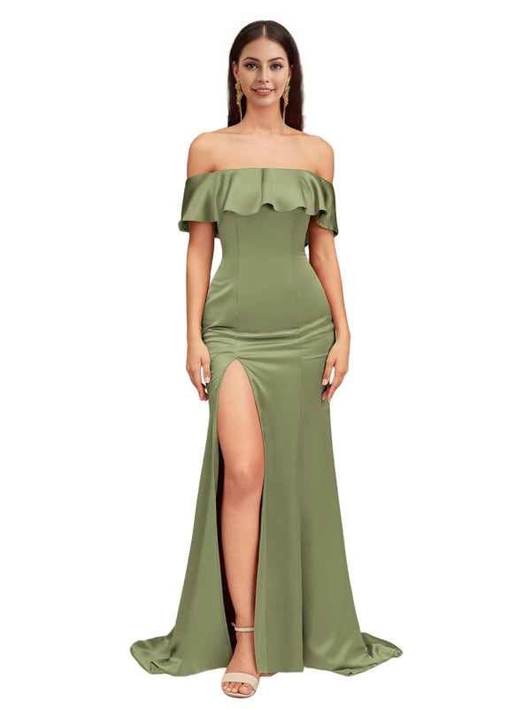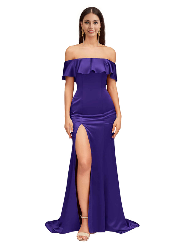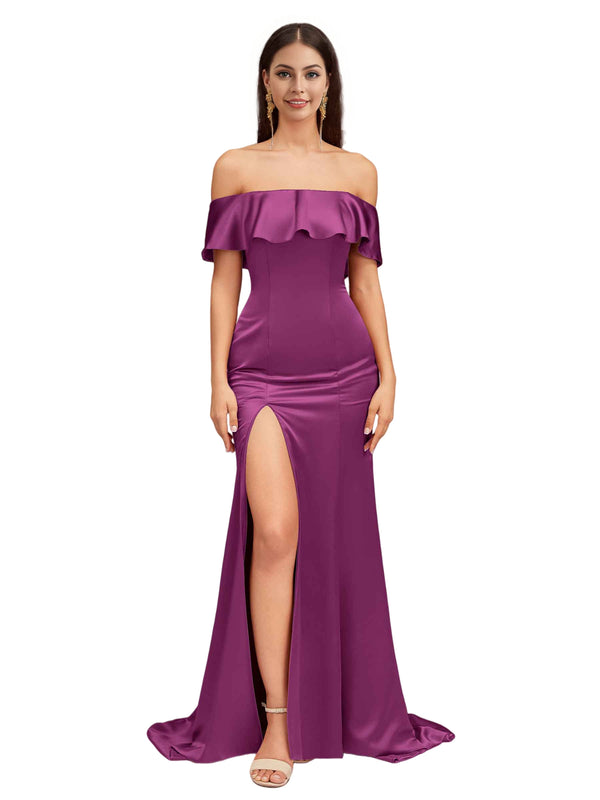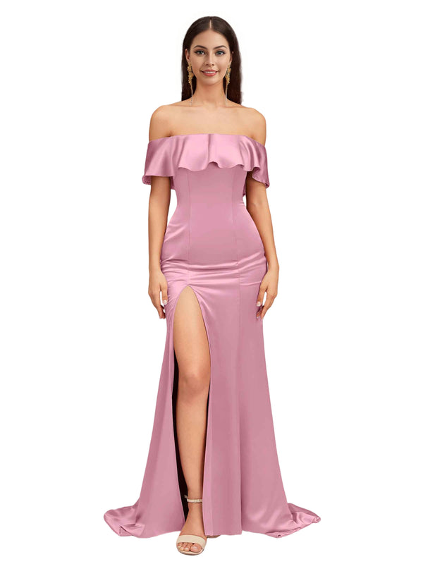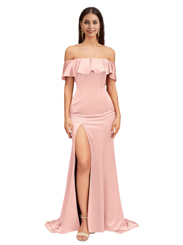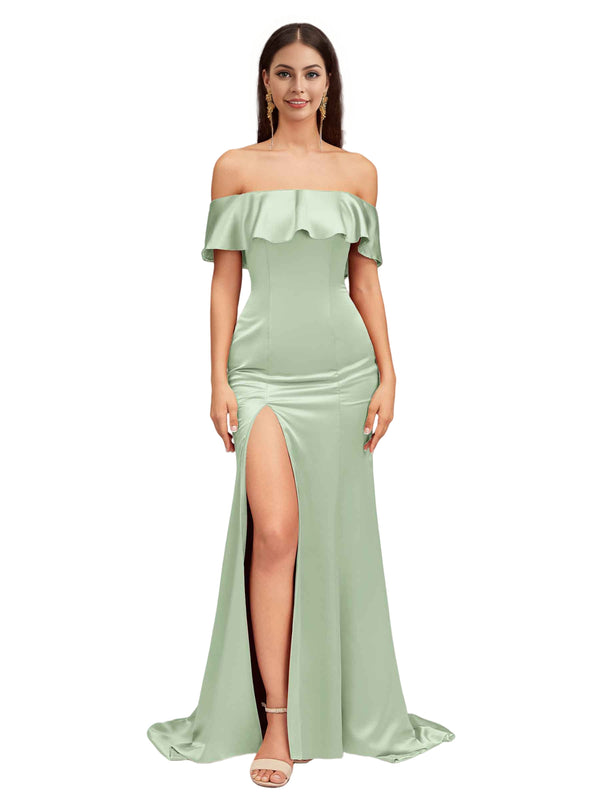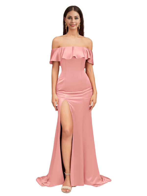 Sexy Mermaid Off The Shoulder Side Slit Soft Satin Pretty Long Bridesmaid Dresses