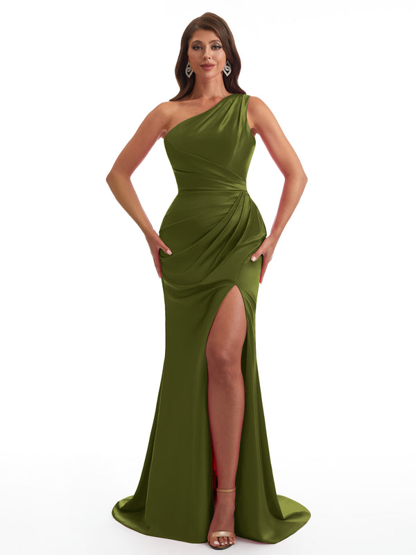 Sexy Mermaid One Shoulder Side Slit Soft Satin Ruched Long Bridesmaid Dresses Online