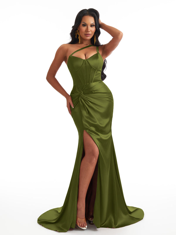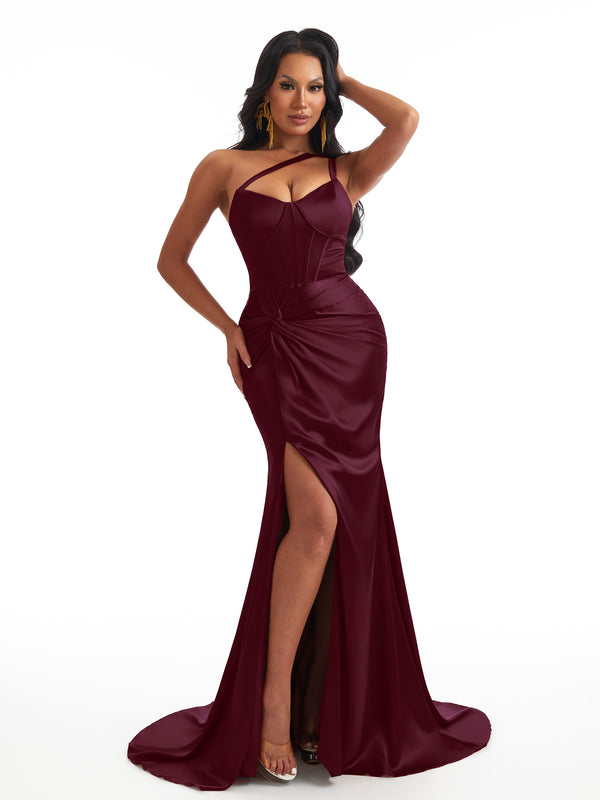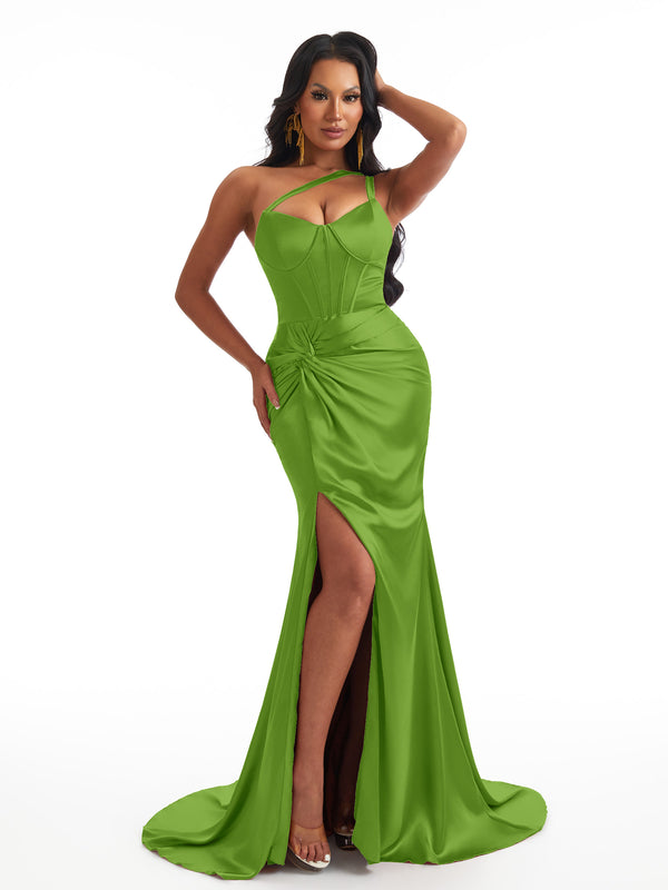 Sexy One Shoulder Mermaid Soft Satin Boning Side Slit Unique Long Bridesmaid Dresses $139.99