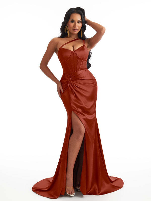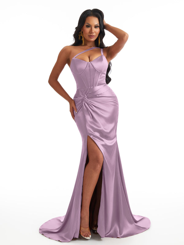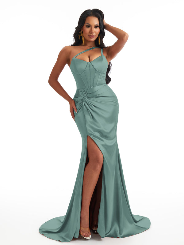 Sexy One Shoulder Mermaid Soft Satin Boning Side Slit Unique Long Bridesmaid Dresses