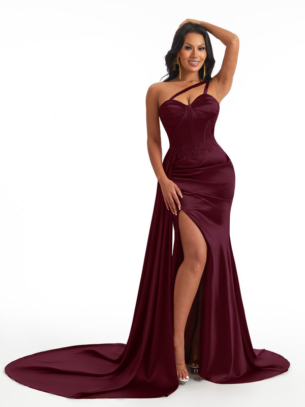 Sexy One Shoulder Side Slit Boning Mermaid Soft Satin Long Bridesmaid Dresses Online