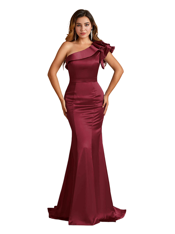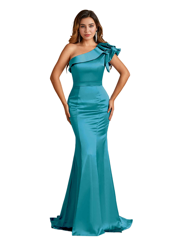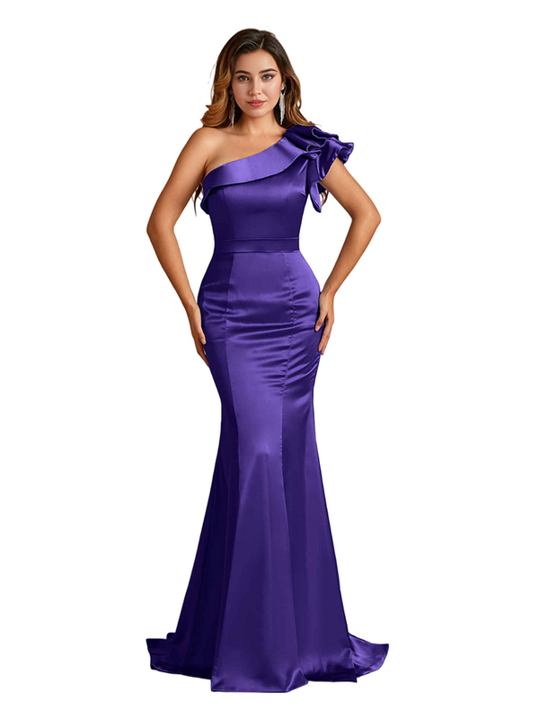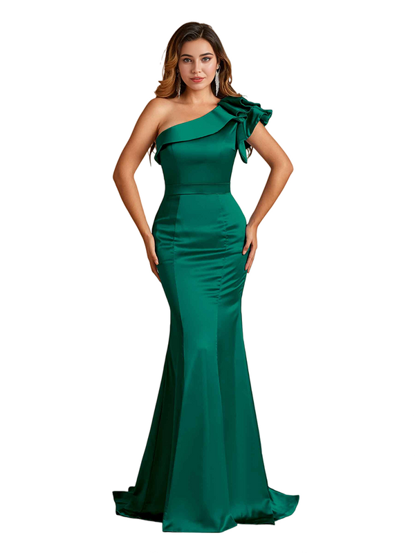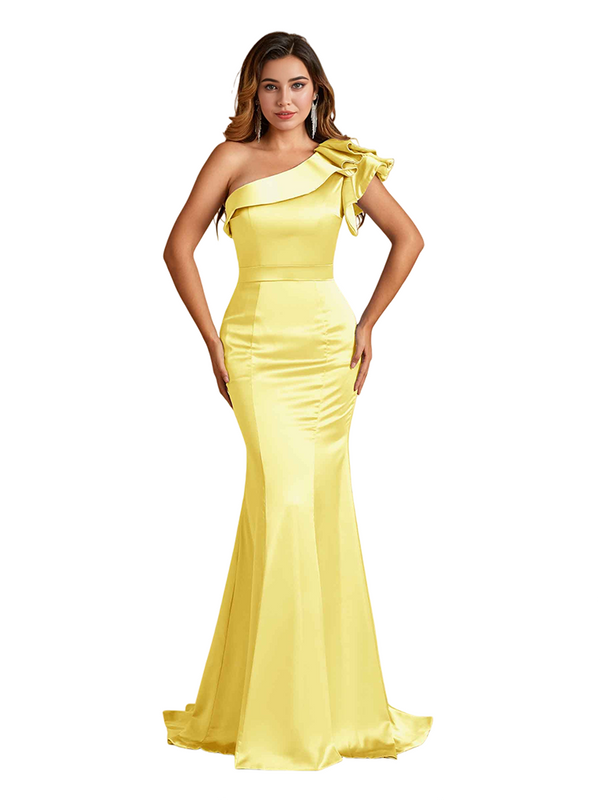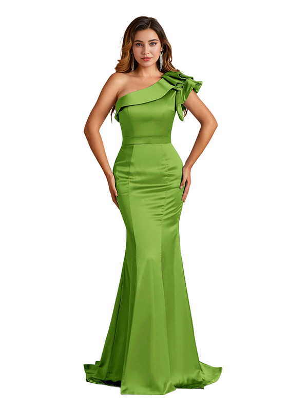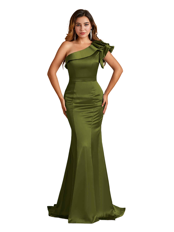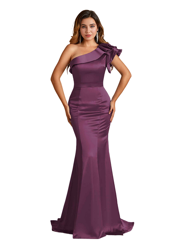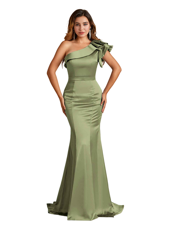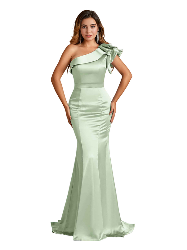 Sexy Ruffle One Shoulder Mermaid Soft Satin Beauty Long Bridesmaid Dresses