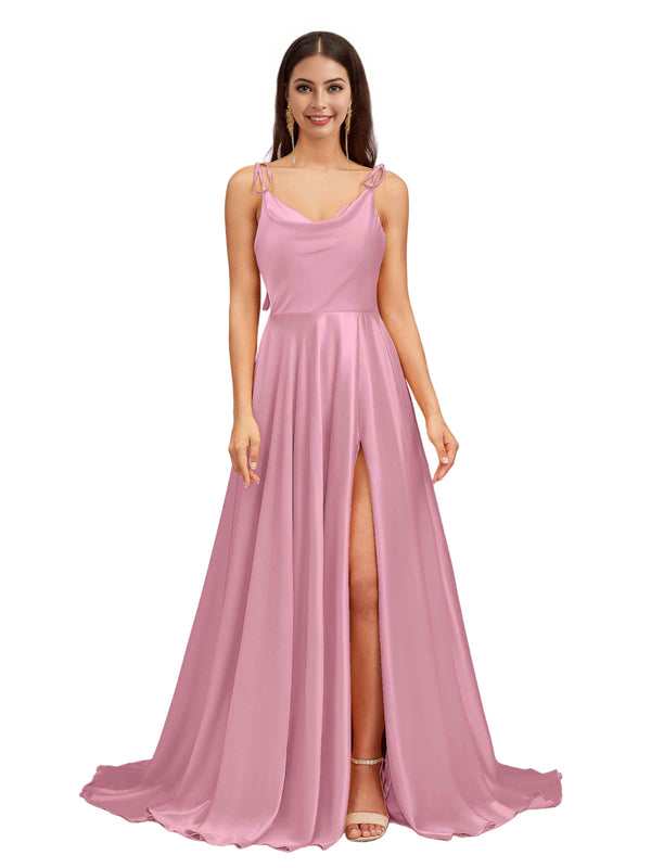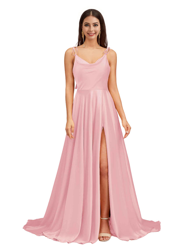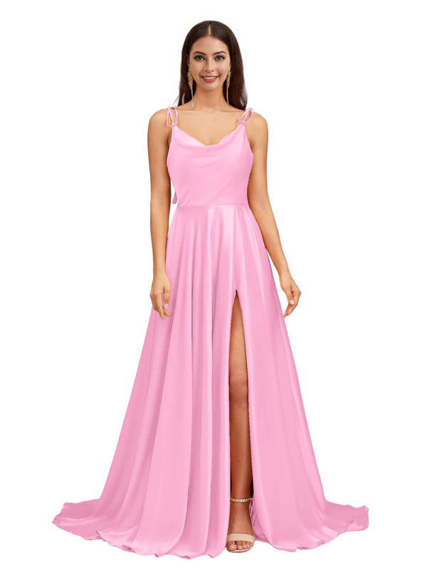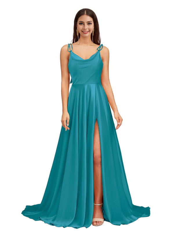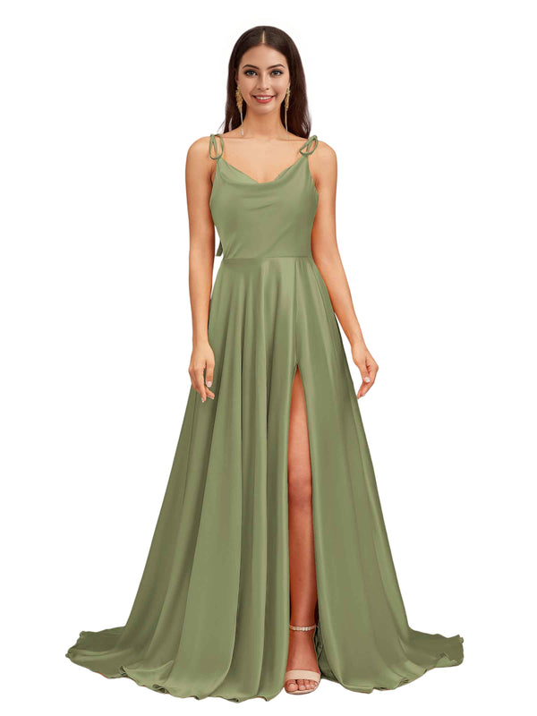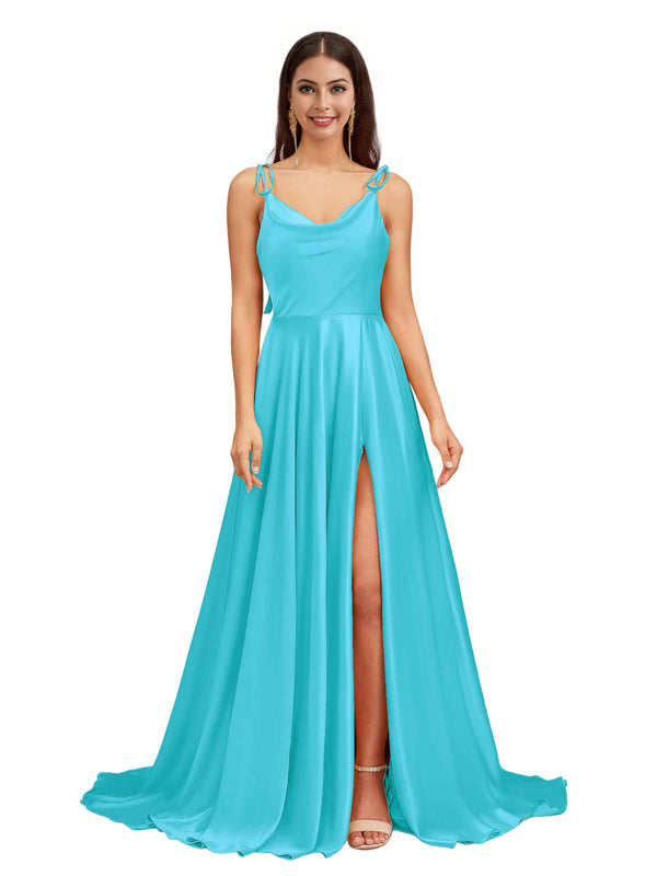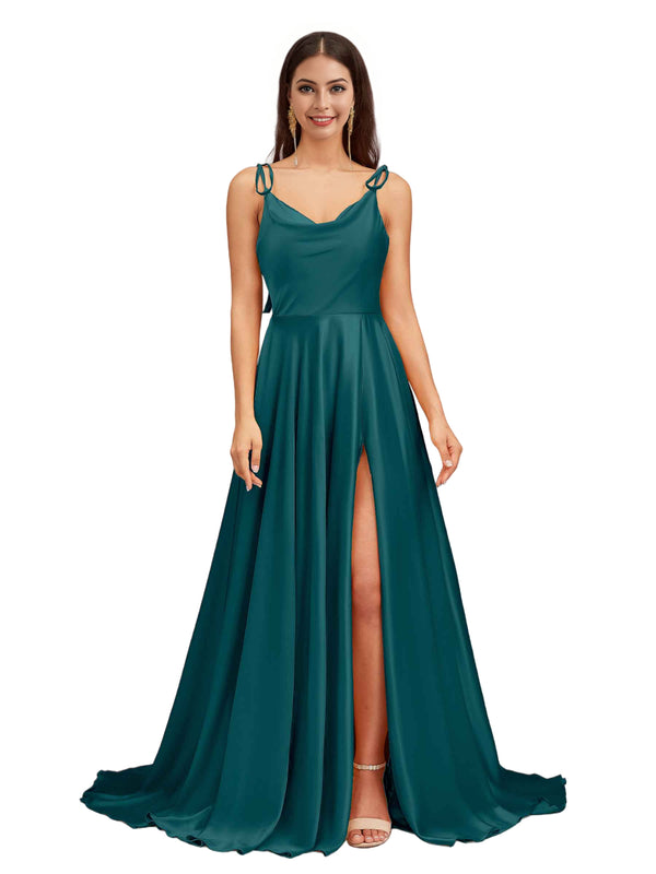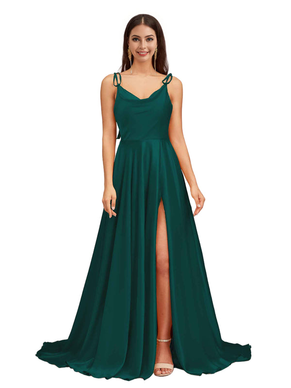 Sexy Side Slit Spaghetti Straps A-Line Soft Satin Pretty Long Bridesmaid Dresses $139.99