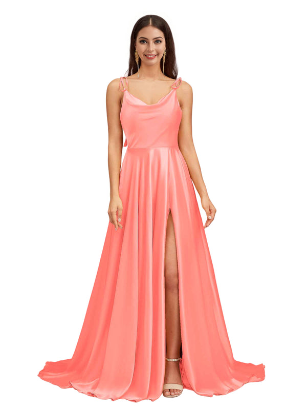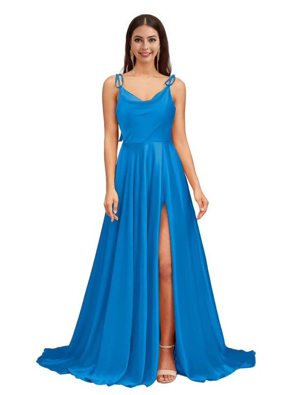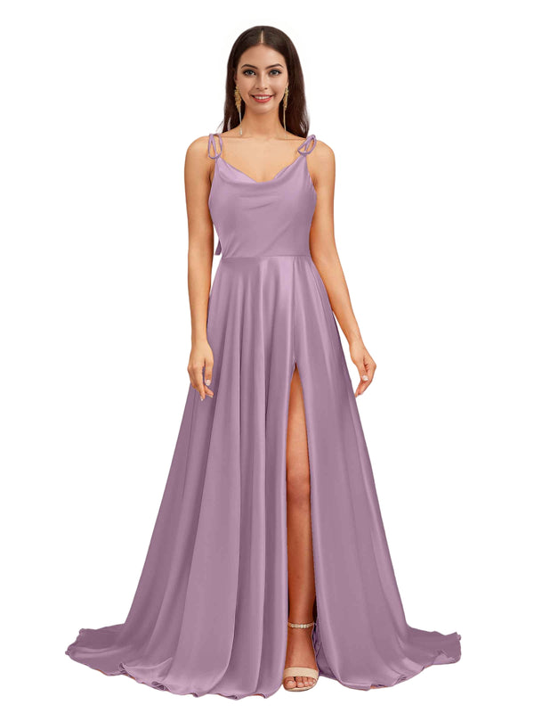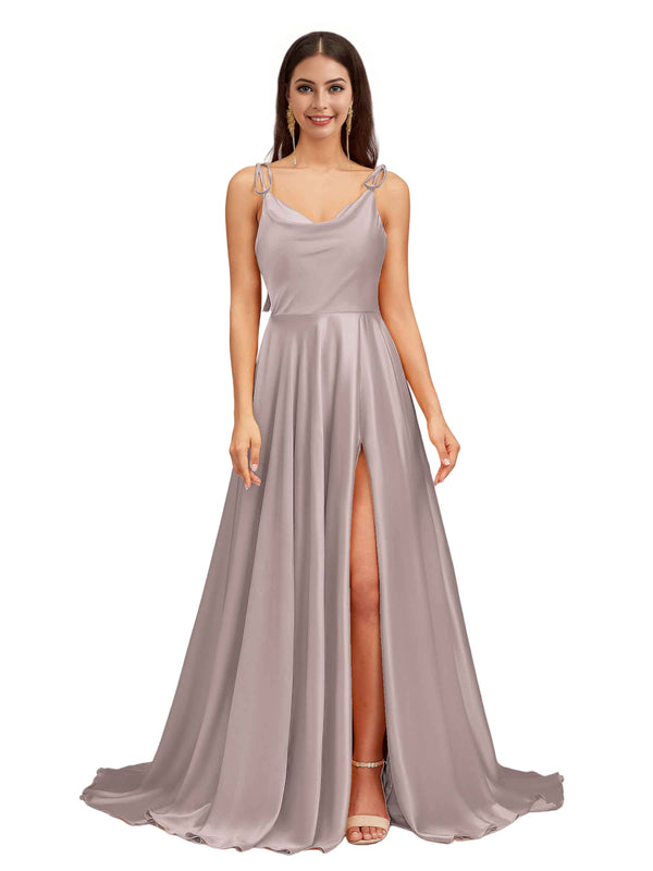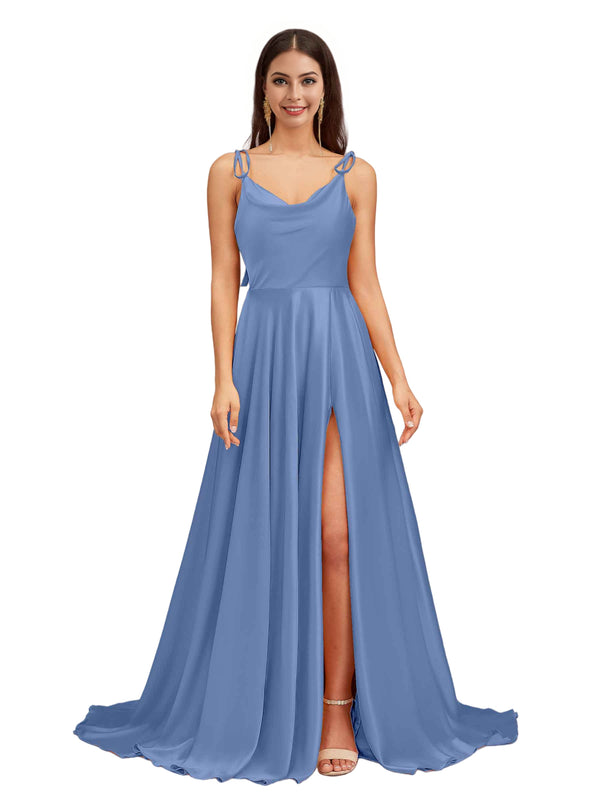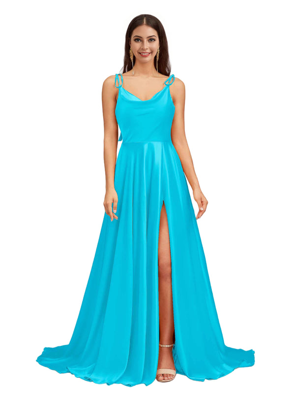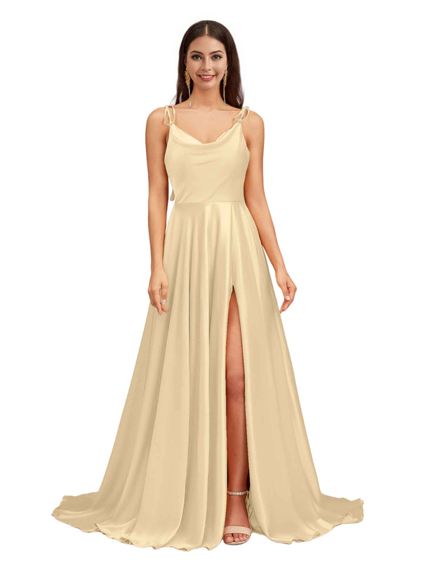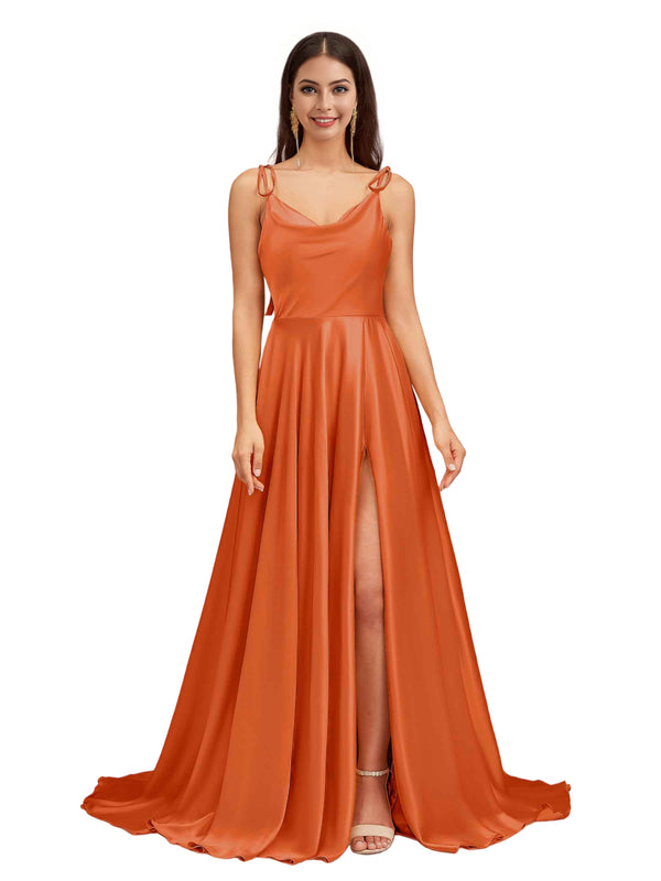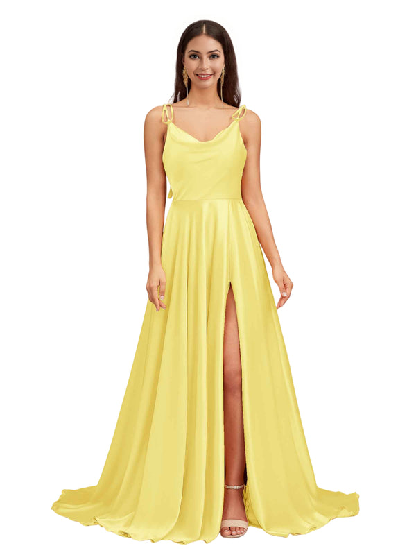 Sexy Side Slit Spaghetti Straps A-Line Soft Satin Pretty Long Bridesmaid Dresses $139.99