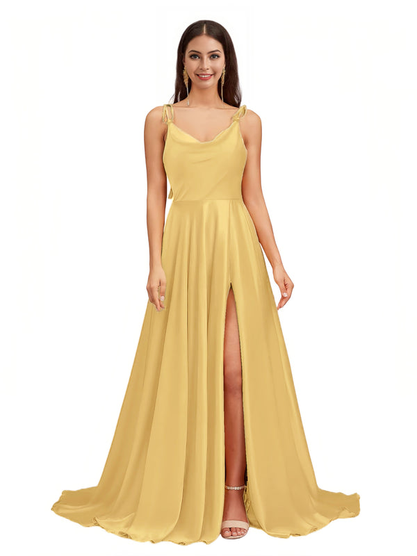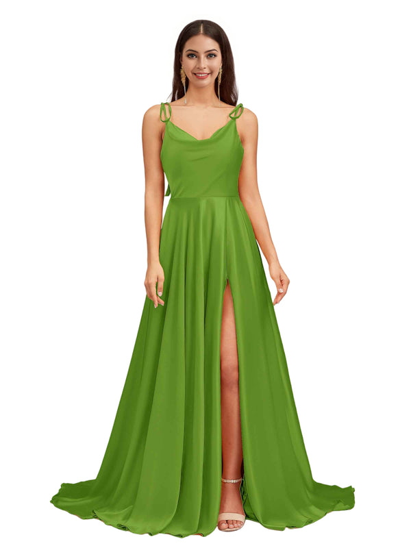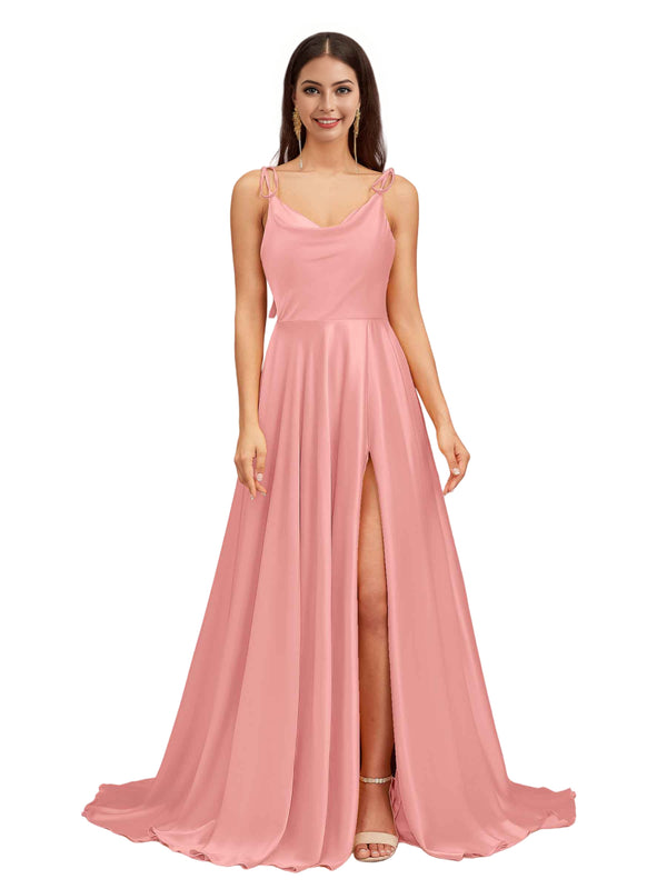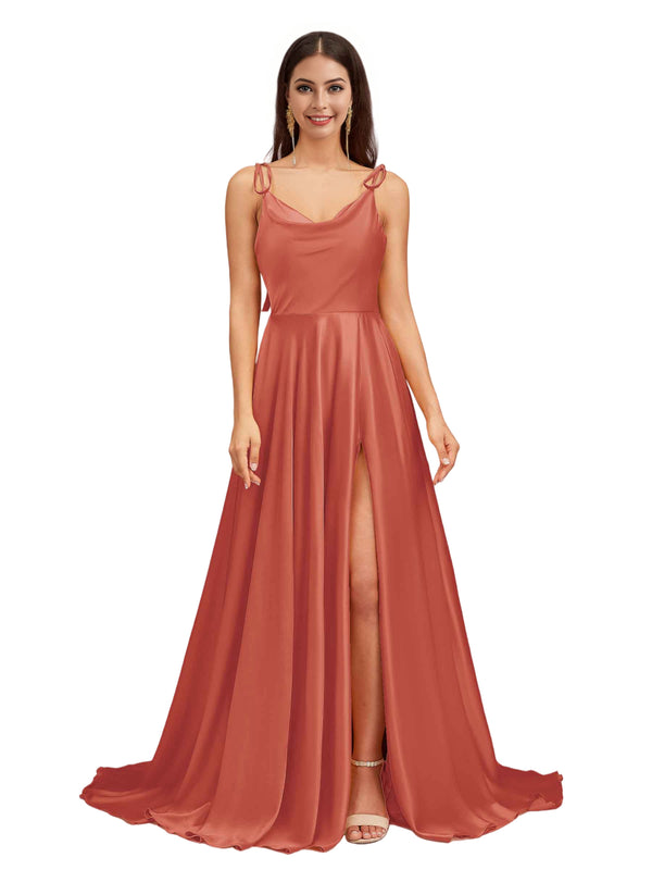 Sexy Side Slit Spaghetti Straps A-Line Soft Satin Pretty Long Bridesmaid Dresses