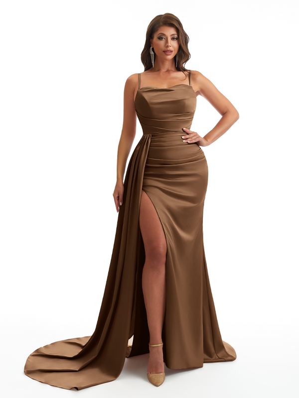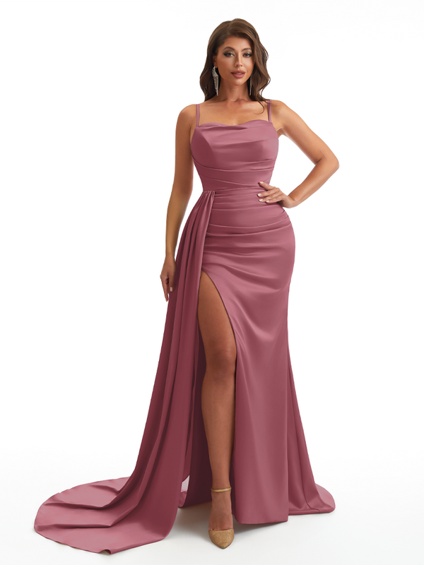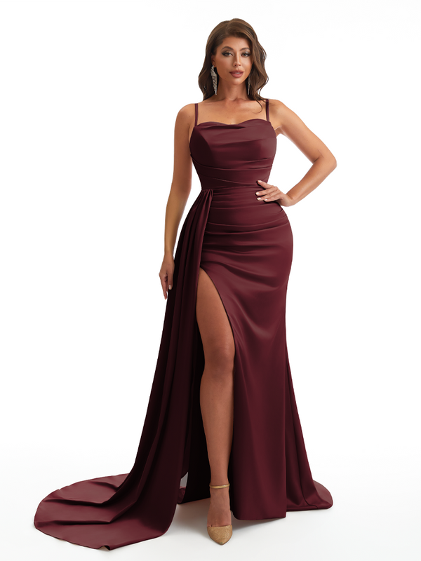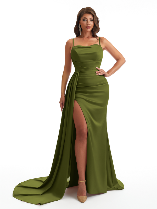 Mermaid Satin Maxi Formal Dresses For Women Online Sexy Spaghetti Straps Side Slit