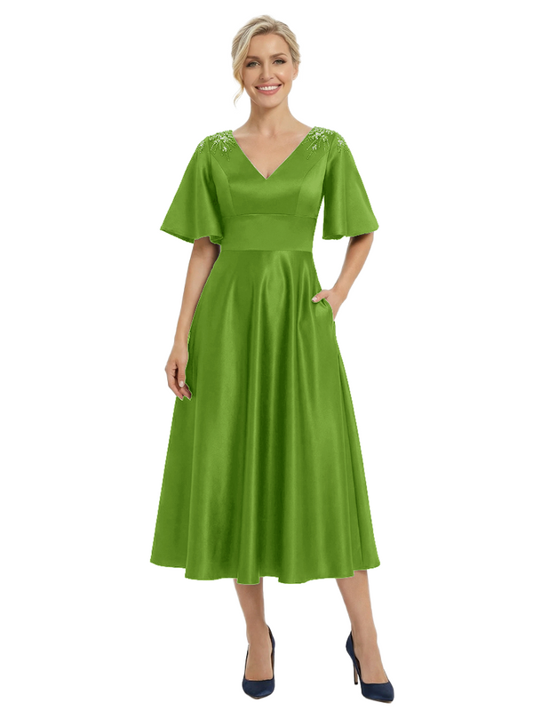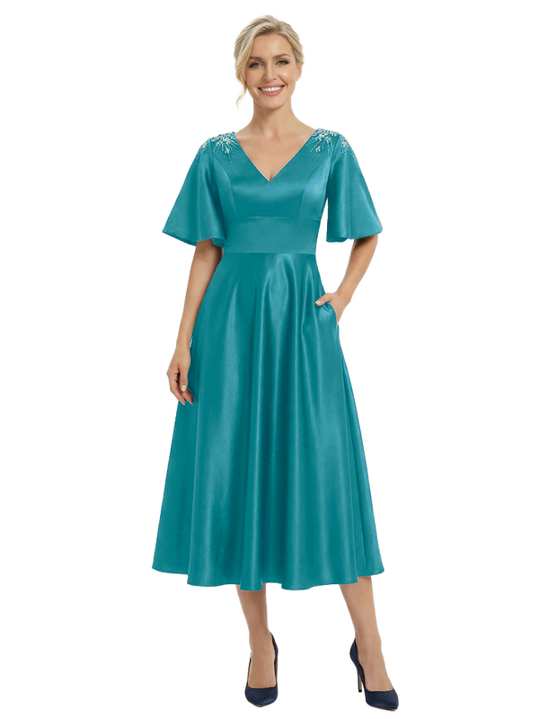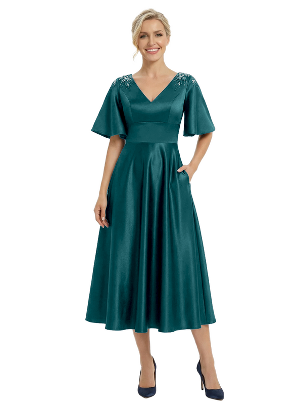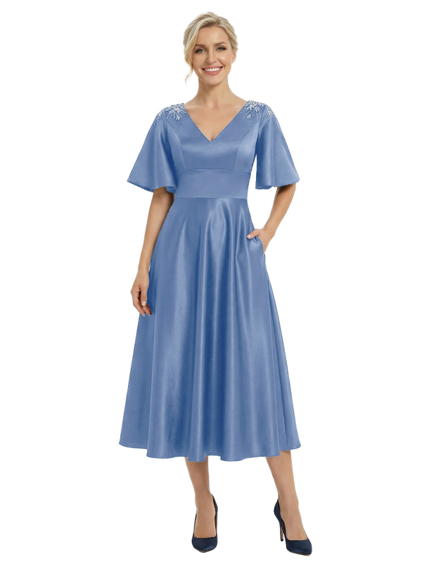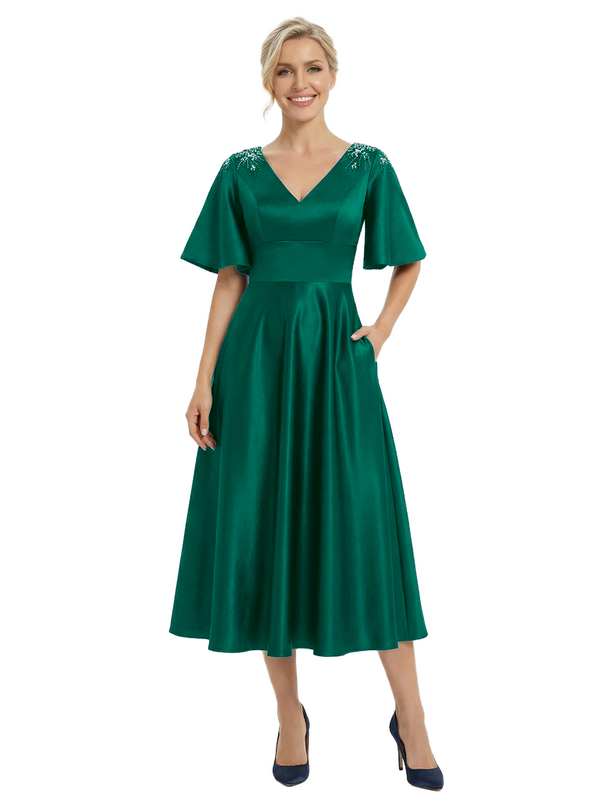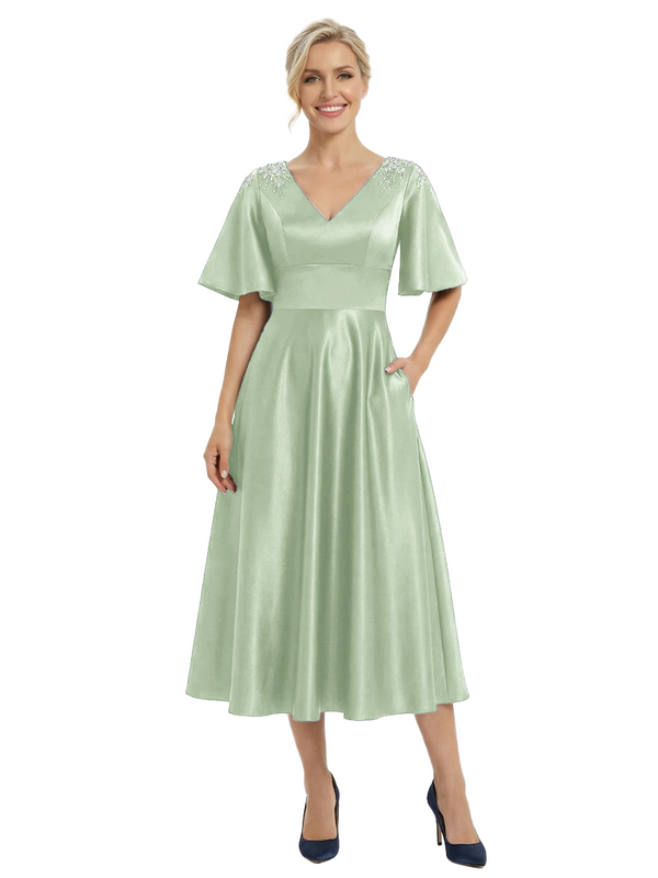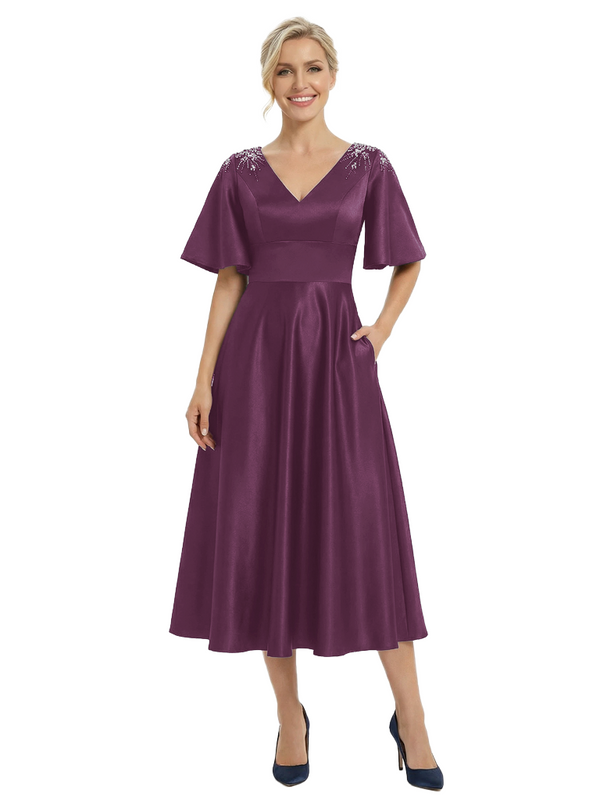 Chicsew Elegant Mother Of The Bride Dress V-Neck Short Sleeves Satin A-Line Tea-Length Gown