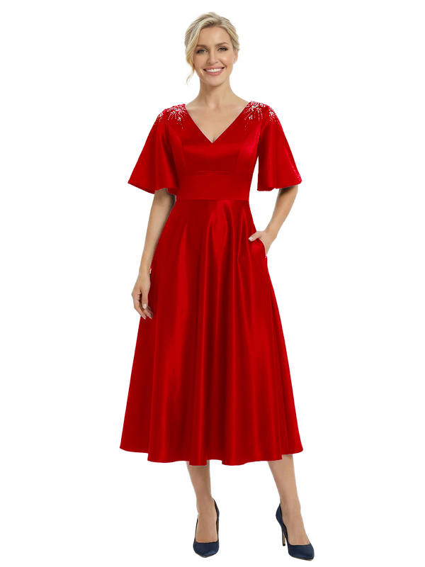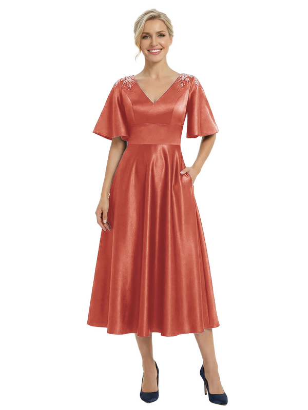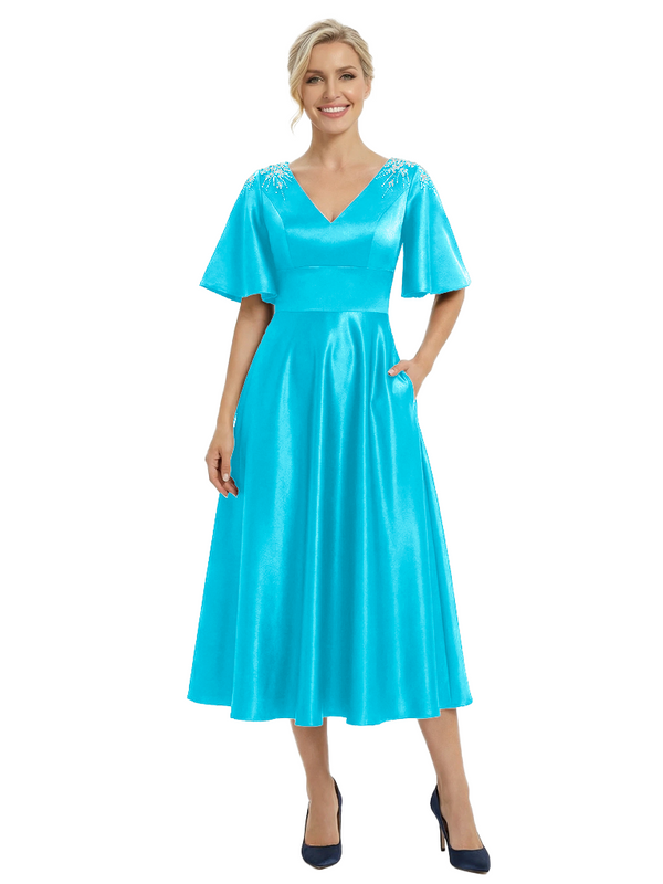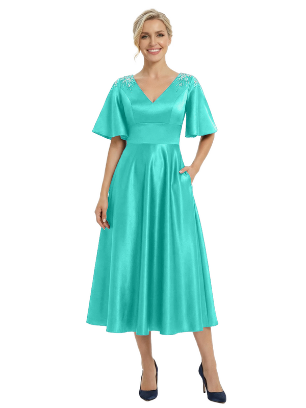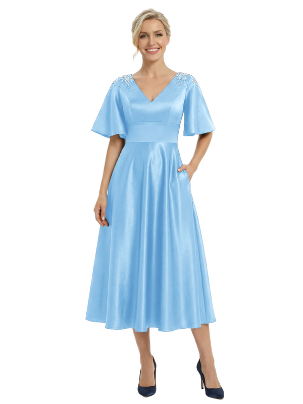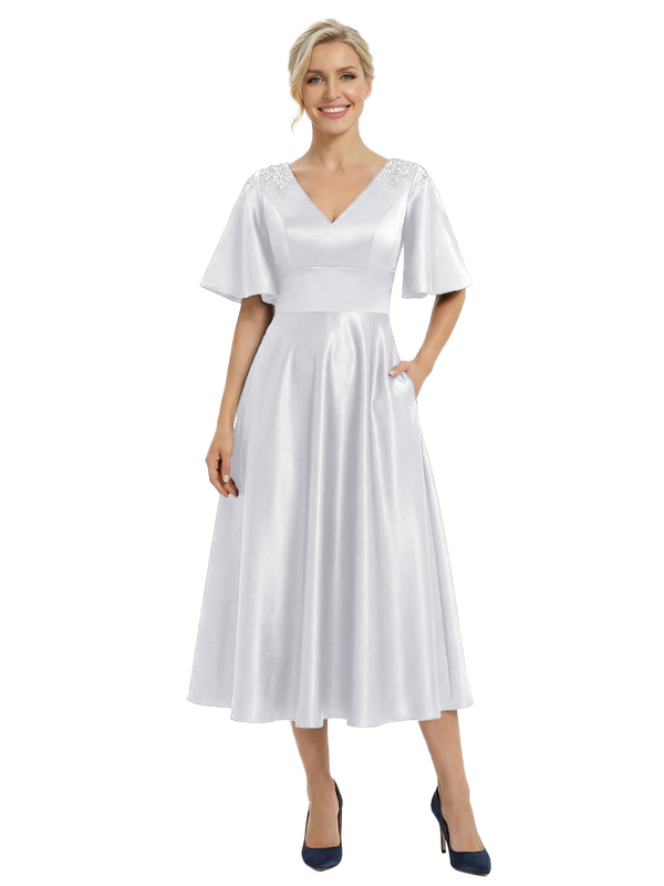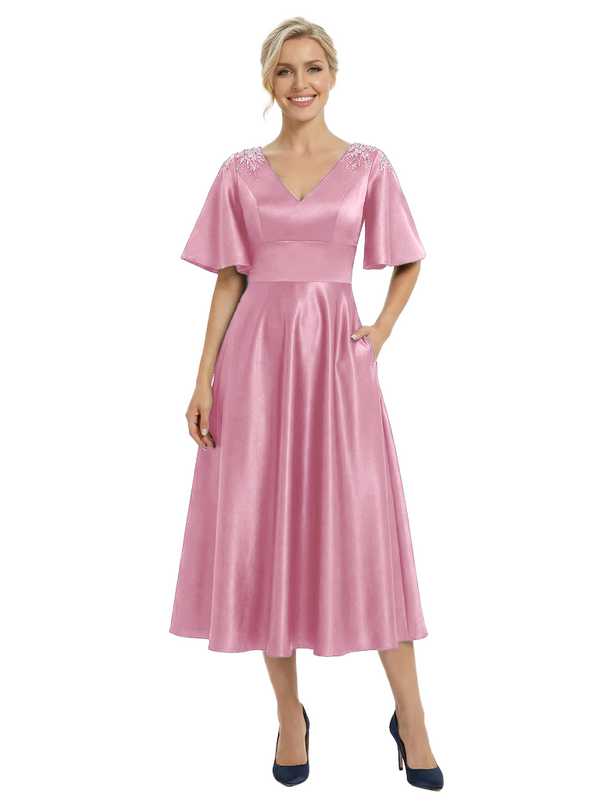 Chicsew Elegant Mother Of The Bride Dress V-Neck Short Sleeves Satin A-Line Tea-Length Gown