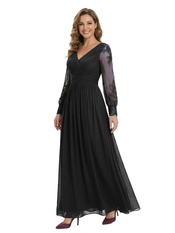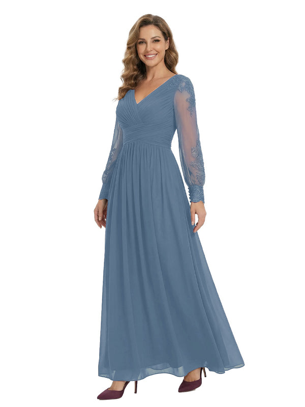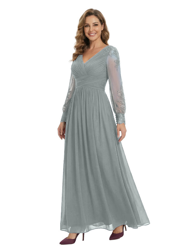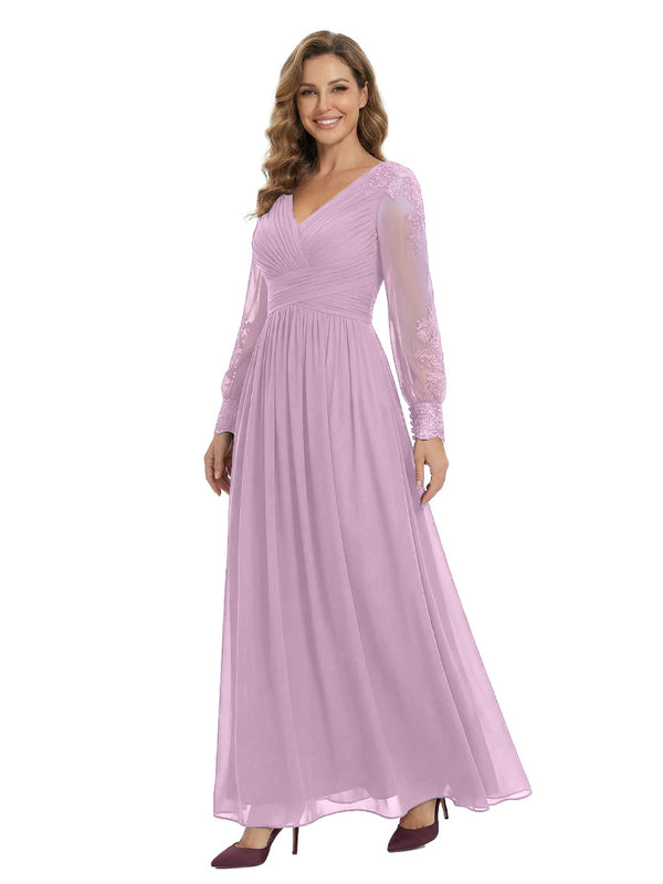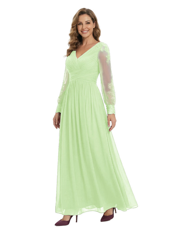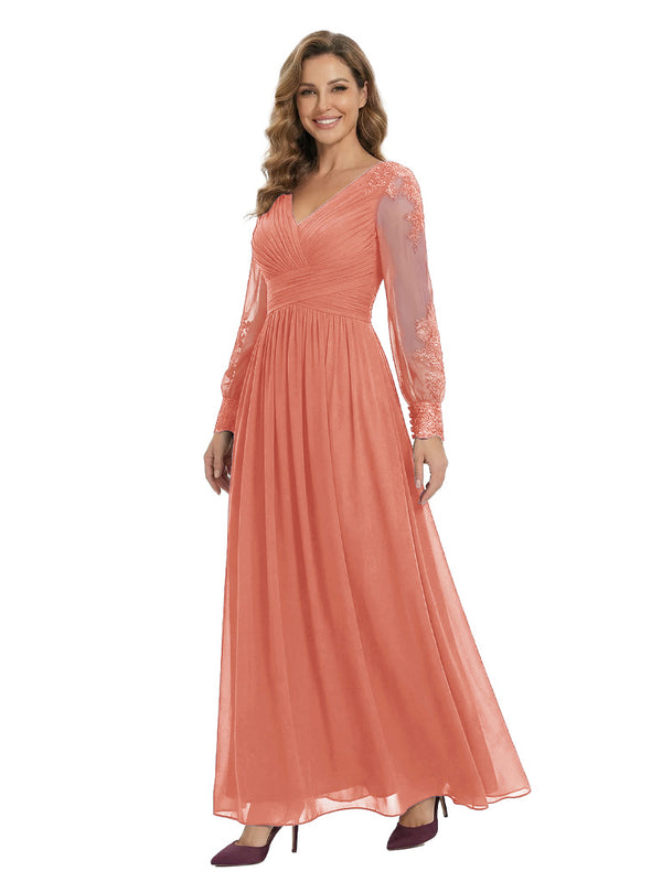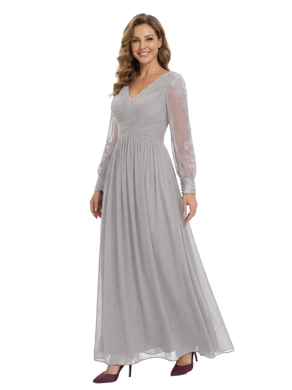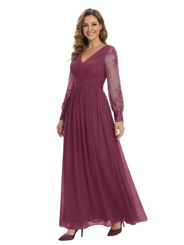 Classy V-Neck Long Sleeves A-Line Lace Appliques Chiffon Mother Of The Bride Dress