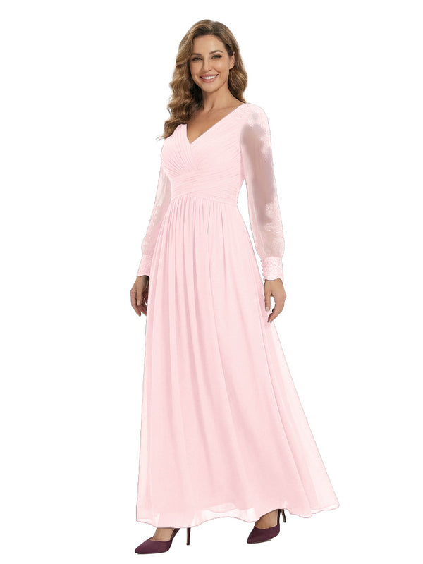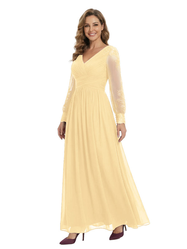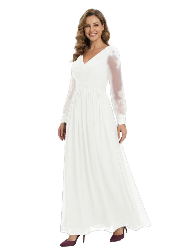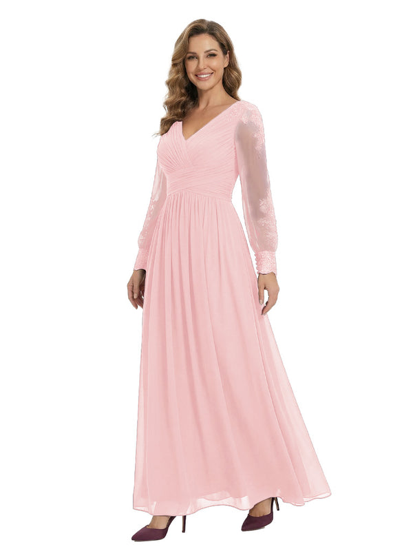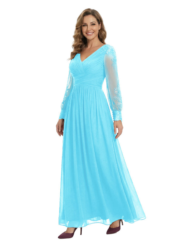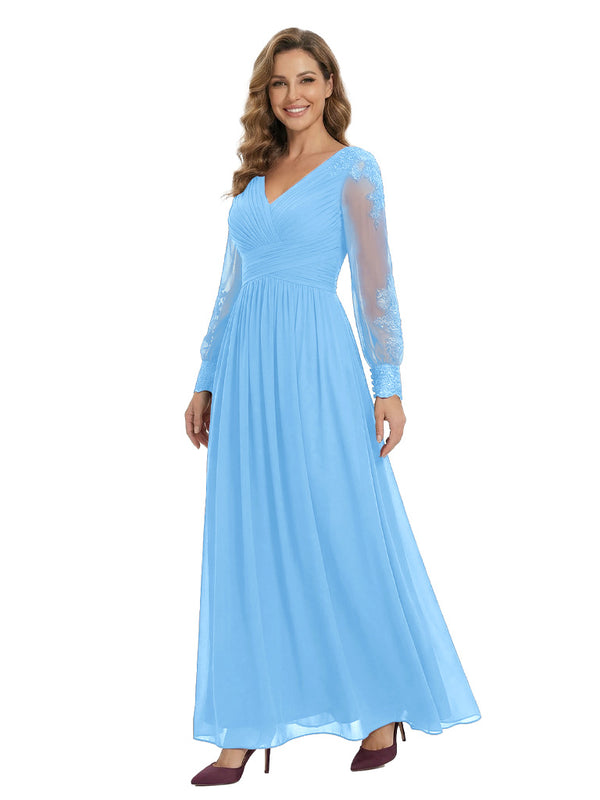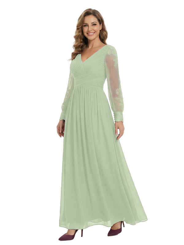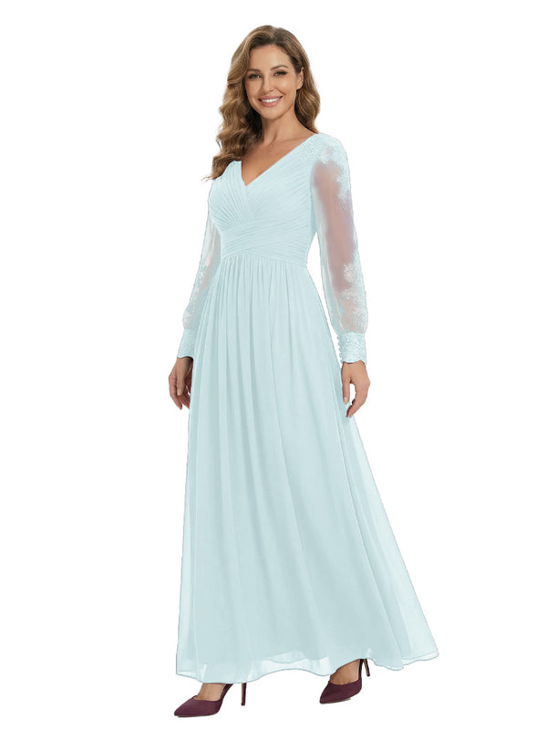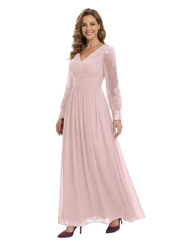 Classy V-Neck Long Sleeves A-Line Lace Appliques Chiffon Mother Of The Bride Dress