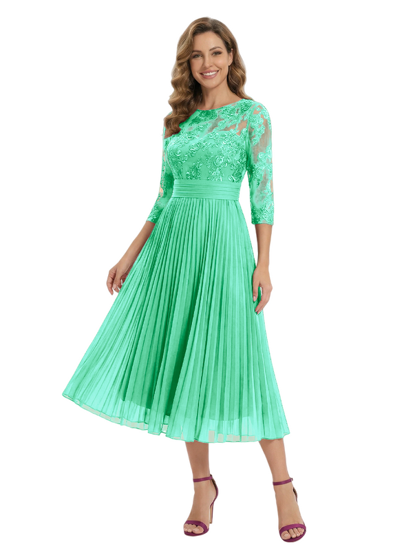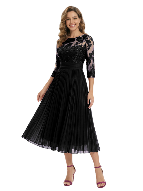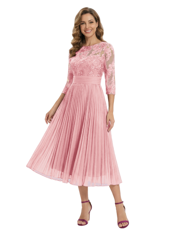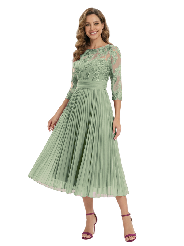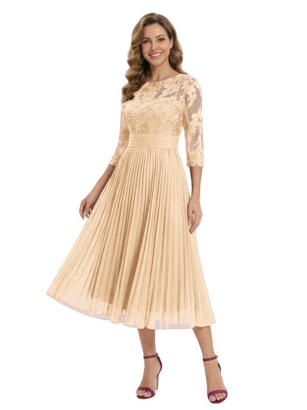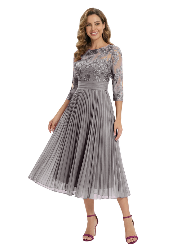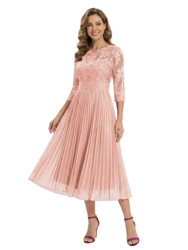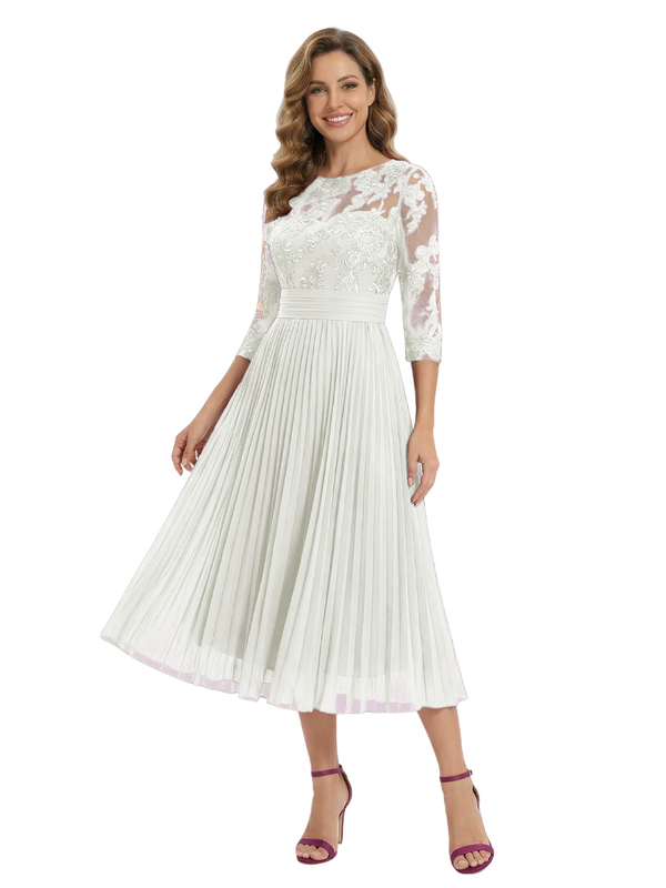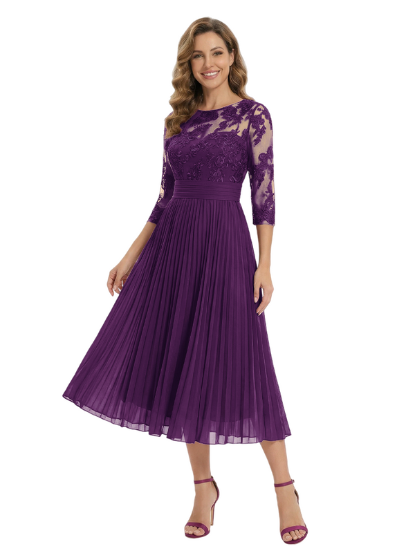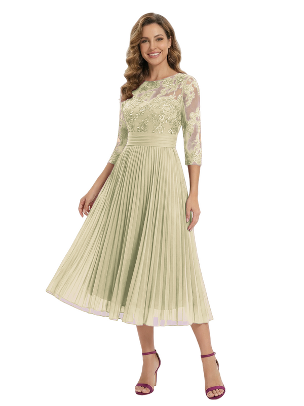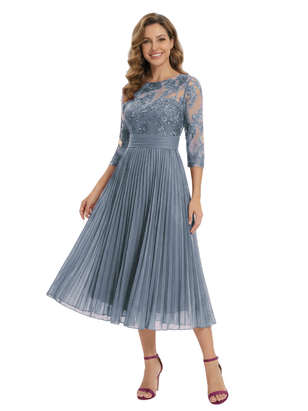 Elegant Summer Pleated Long Sleeve Chiffon Mother of The Bride Dress Tea-Length