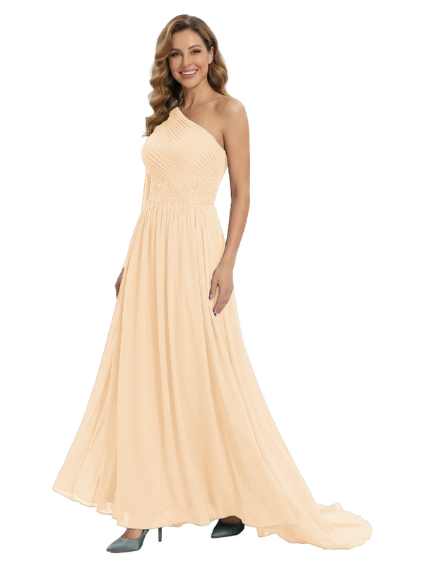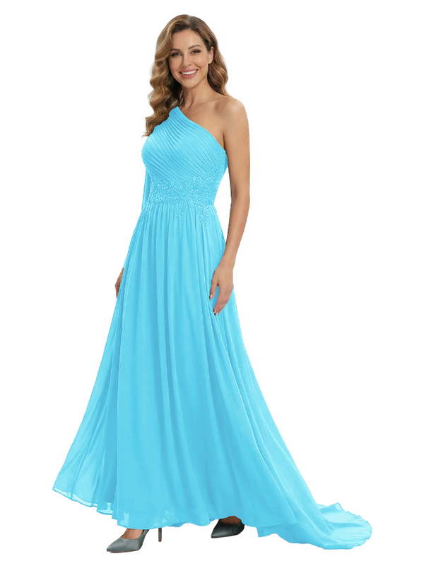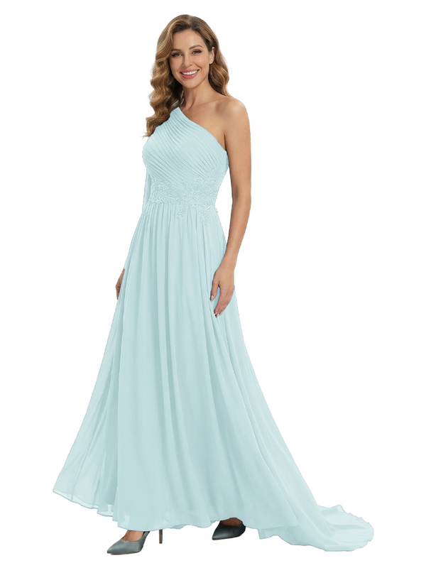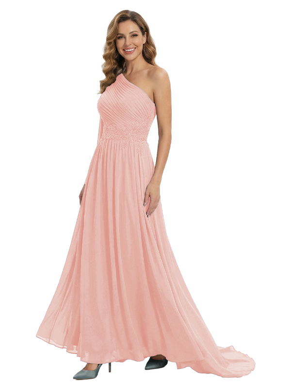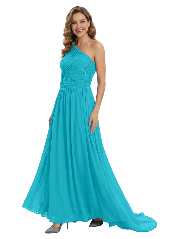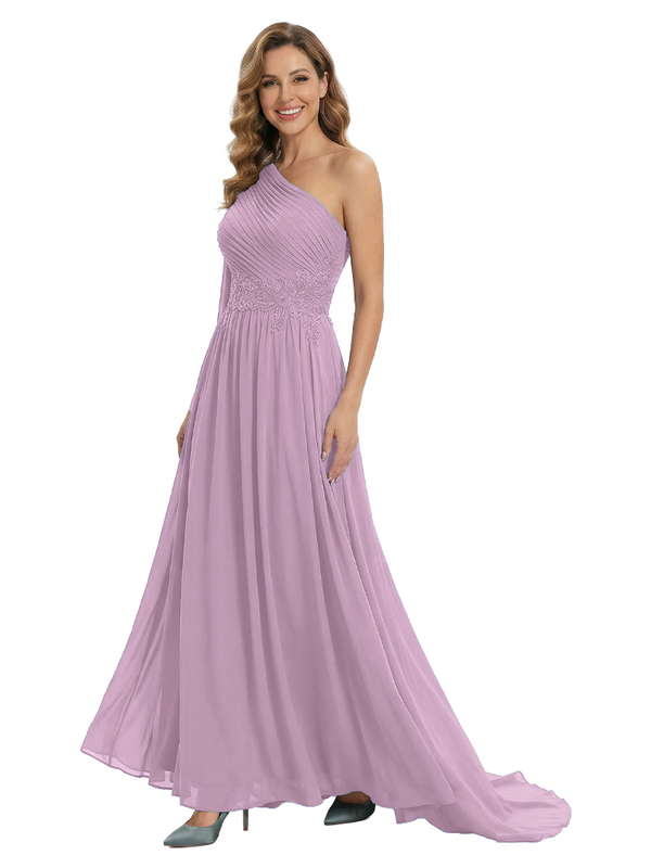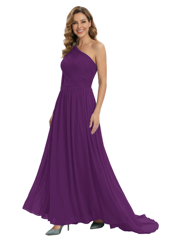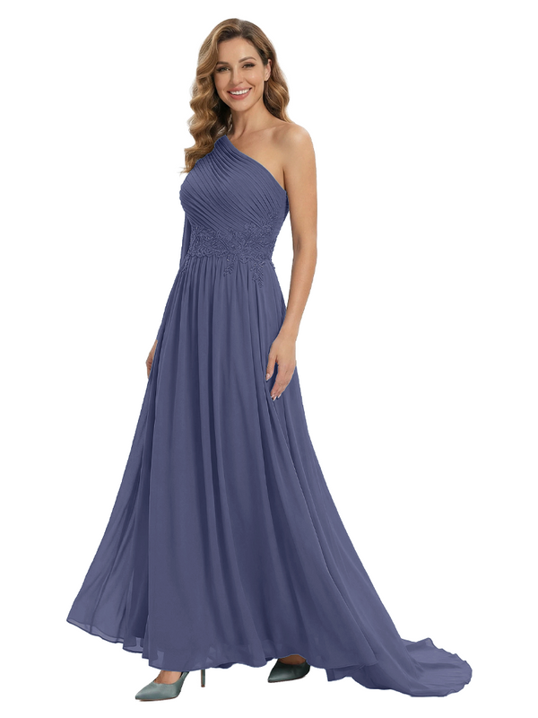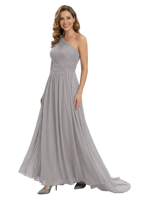 Fancy One Shoulder Lace Appliques Mother Of The Bride Dress Ruched Floor Length Chiffon Formal Gown