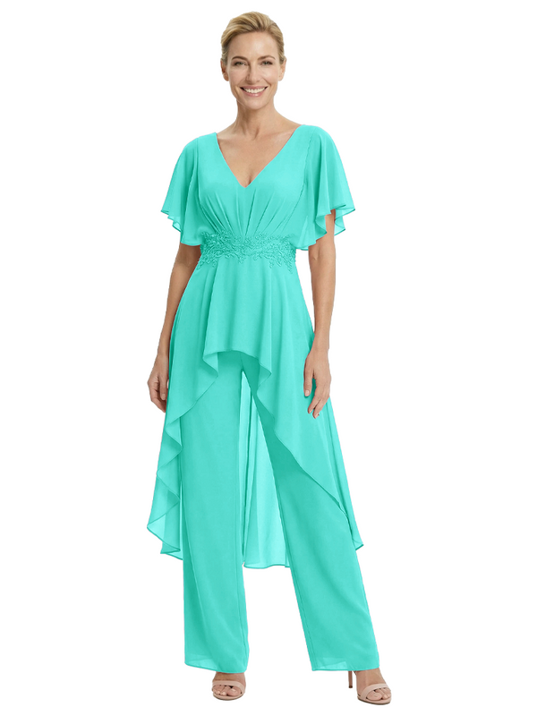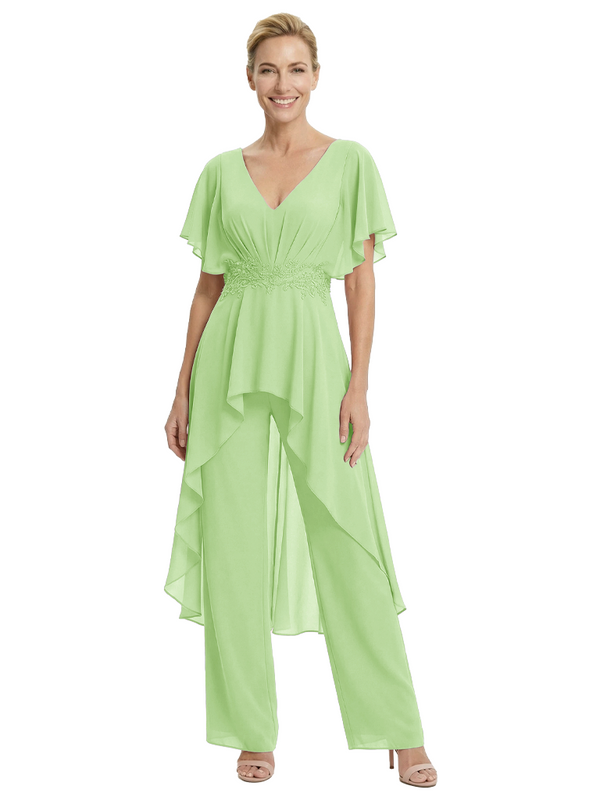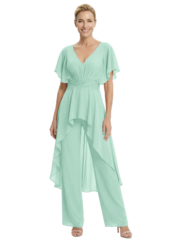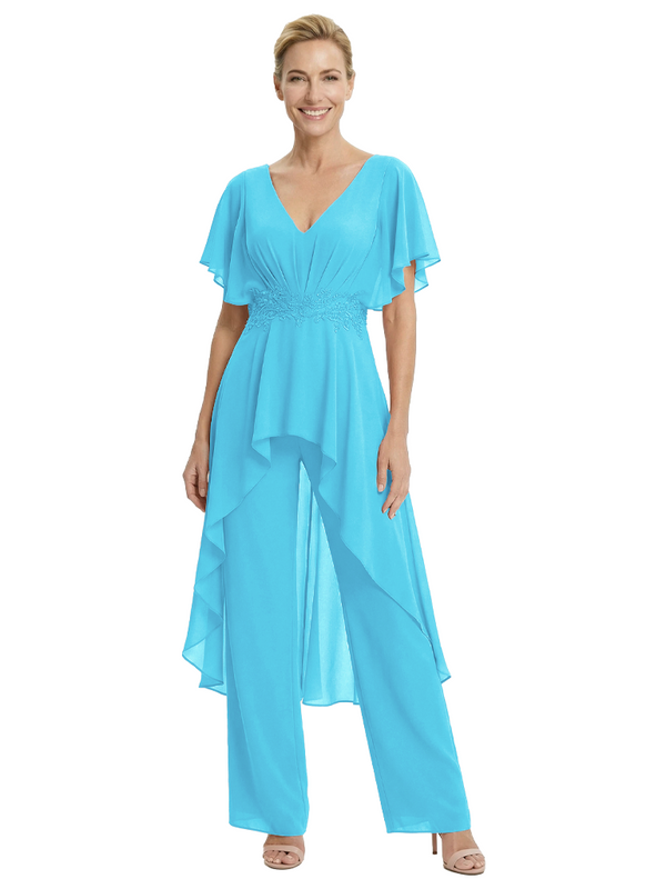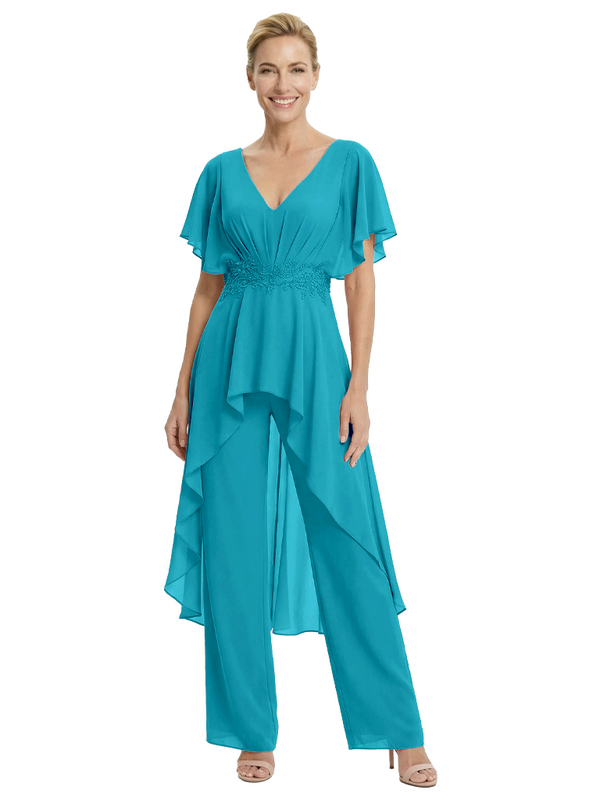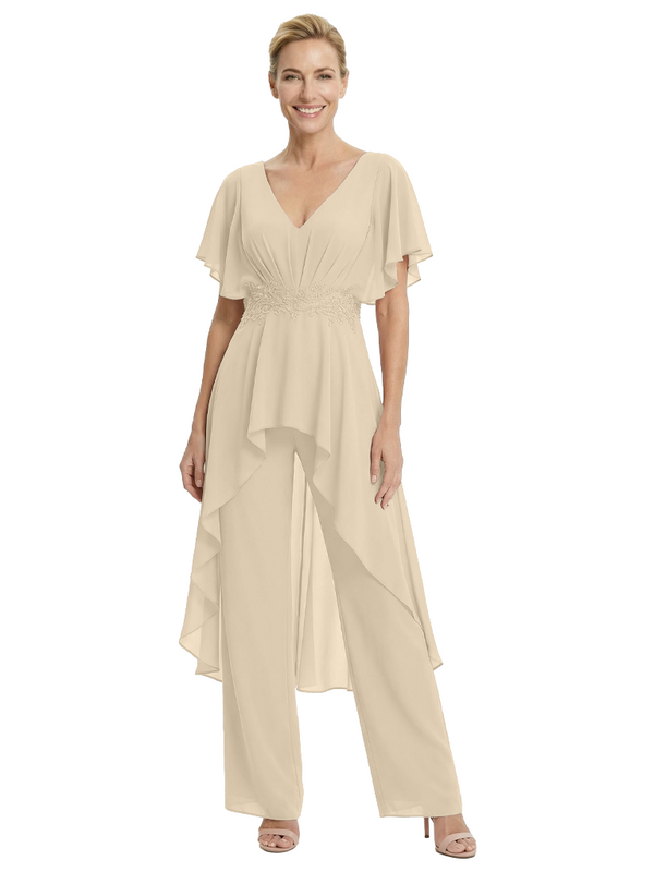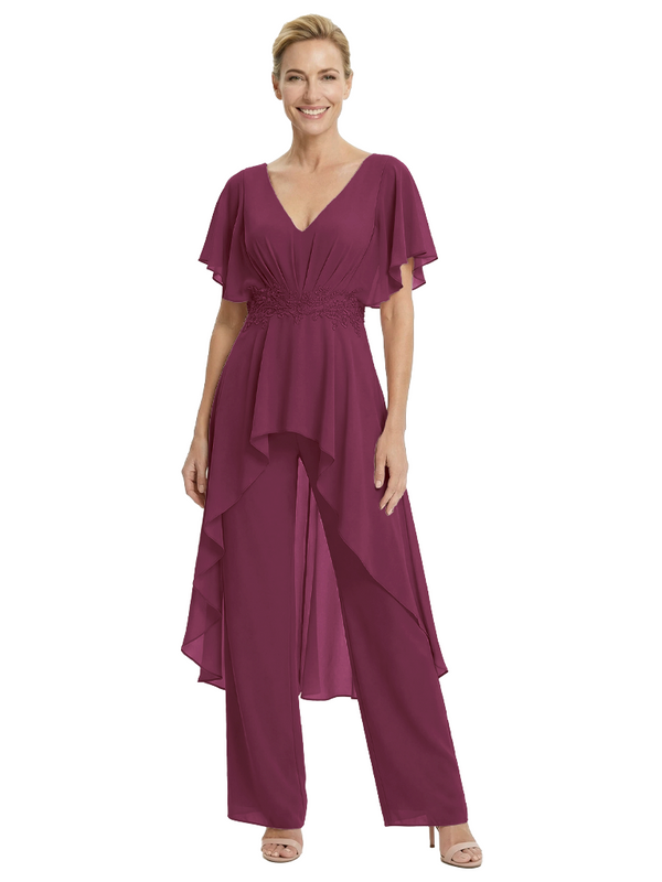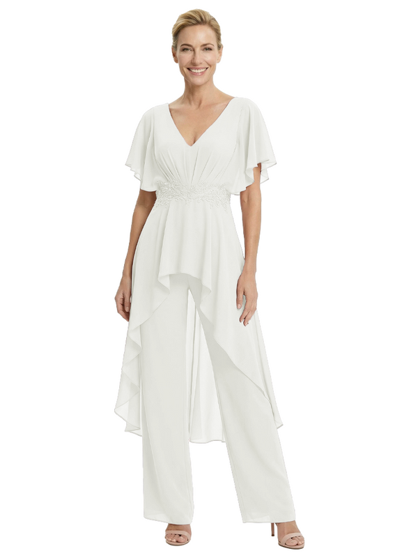 Stylish Mother Of The Bride Pantsuit V-Neck Flutter Sleeves Chiffon Overlay Jumpsuit