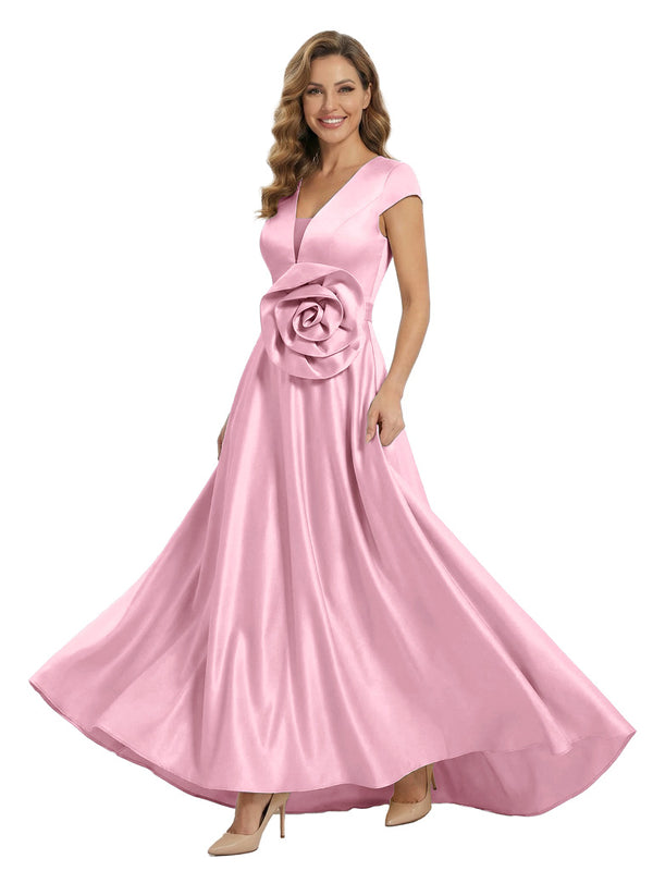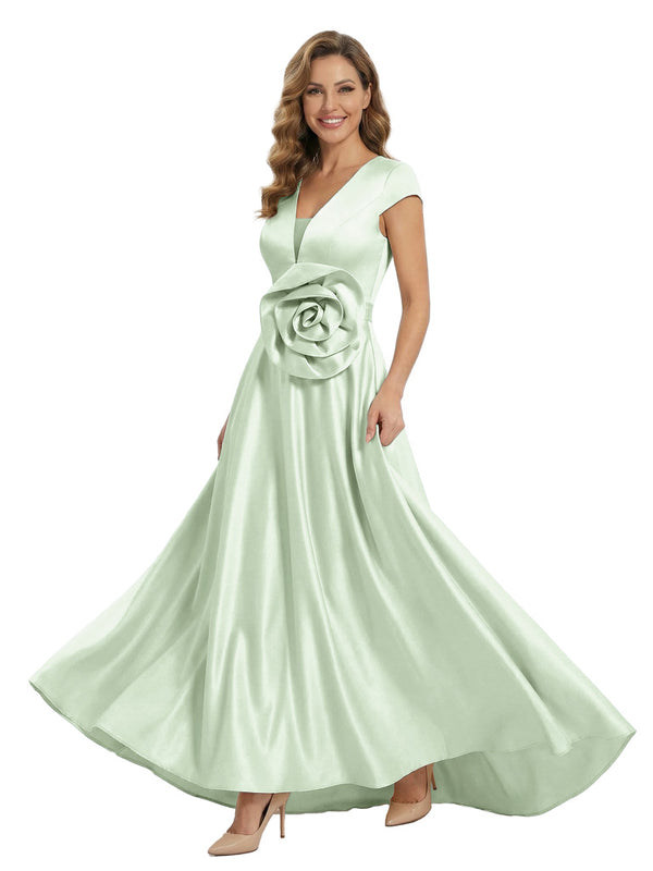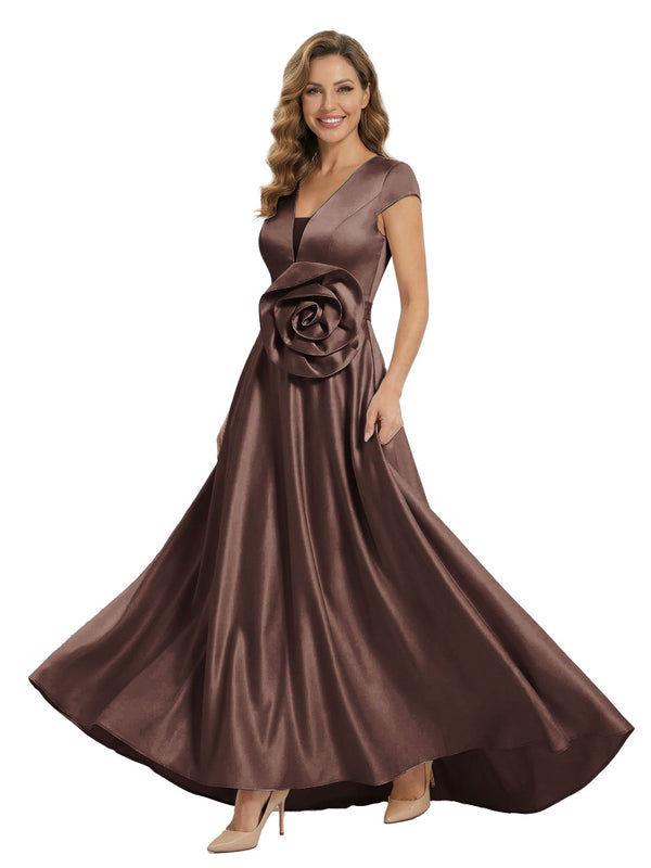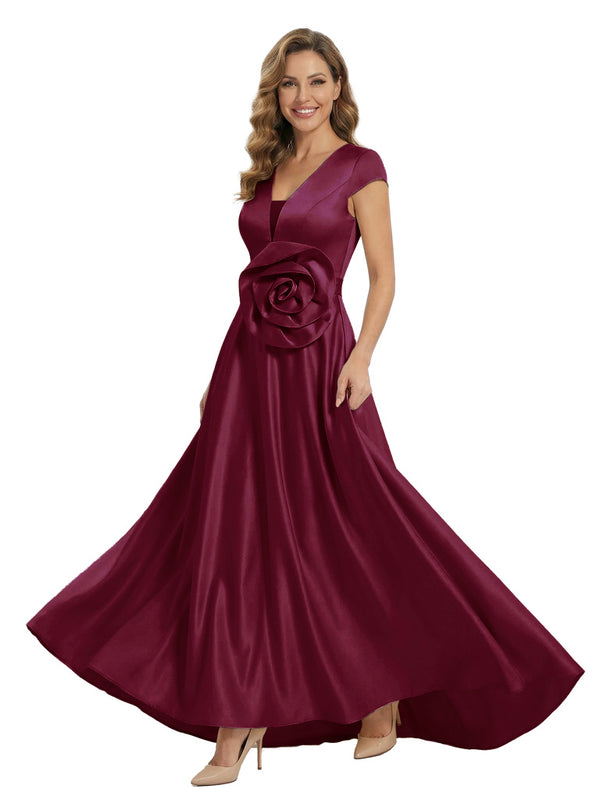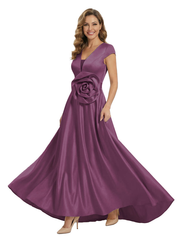 V-Neck Satin Mother Of The Groom Dress Cap Sleeves A-Line Maxi Gown With Handmade Flower $149.99