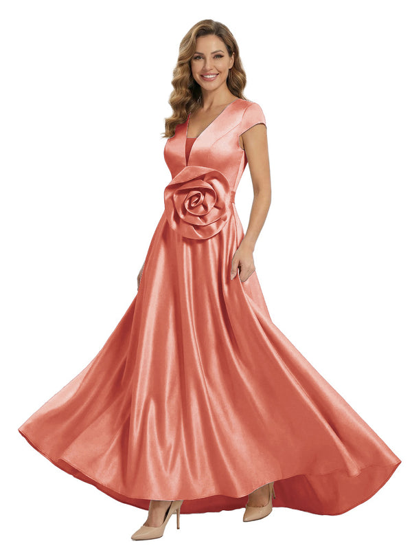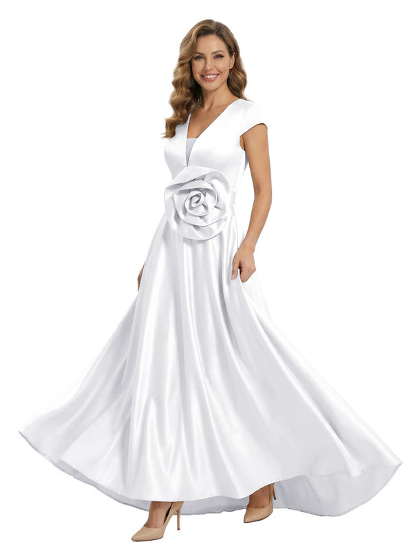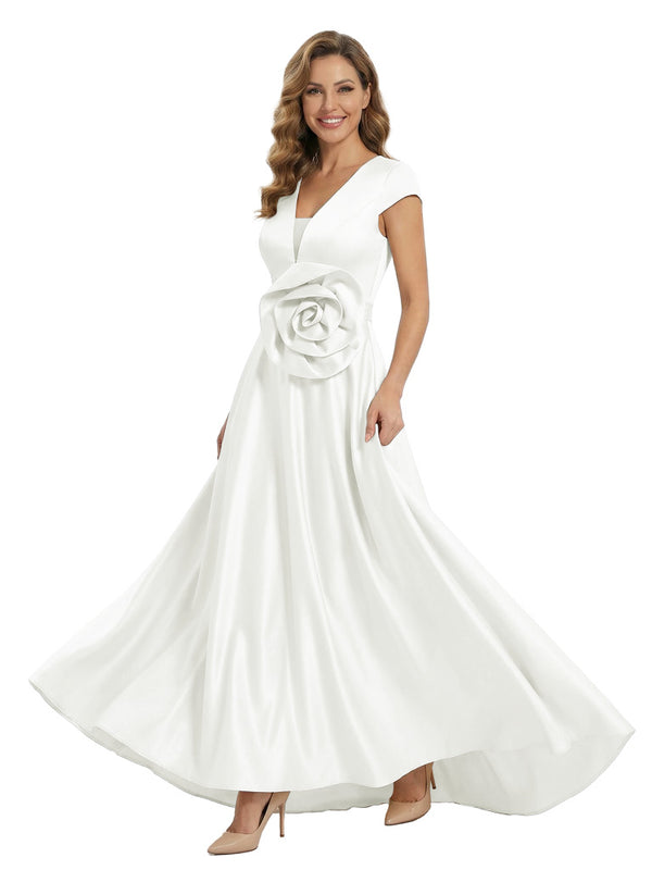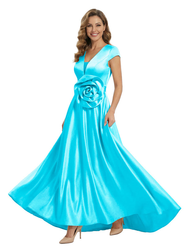 V-Neck Satin Mother Of The Groom Dress Cap Sleeves A-Line Maxi Gown With Handmade Flower