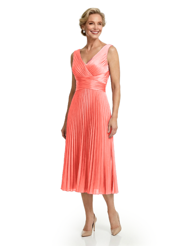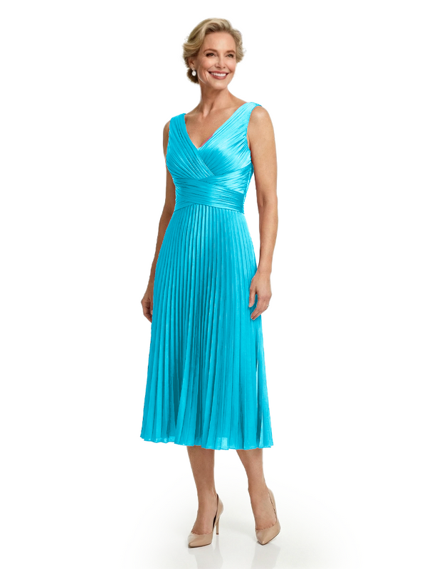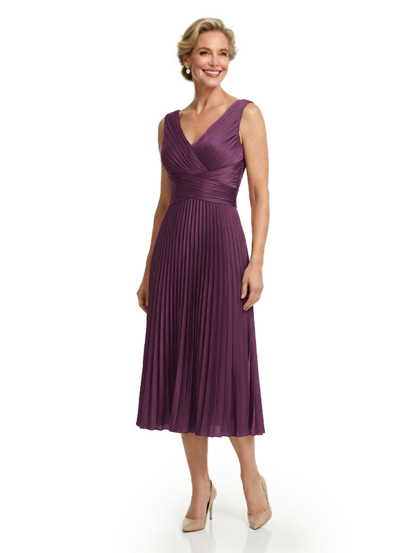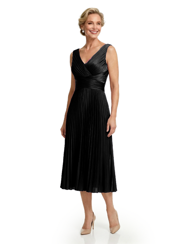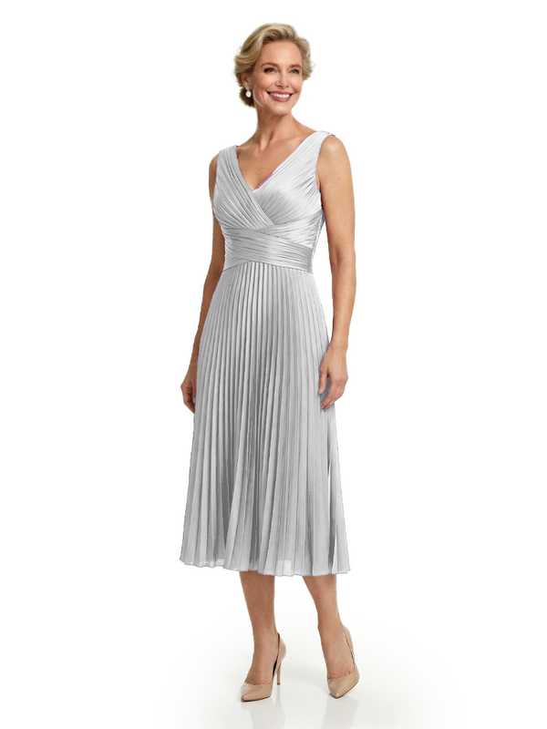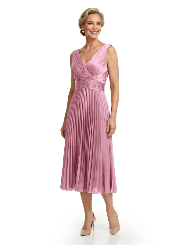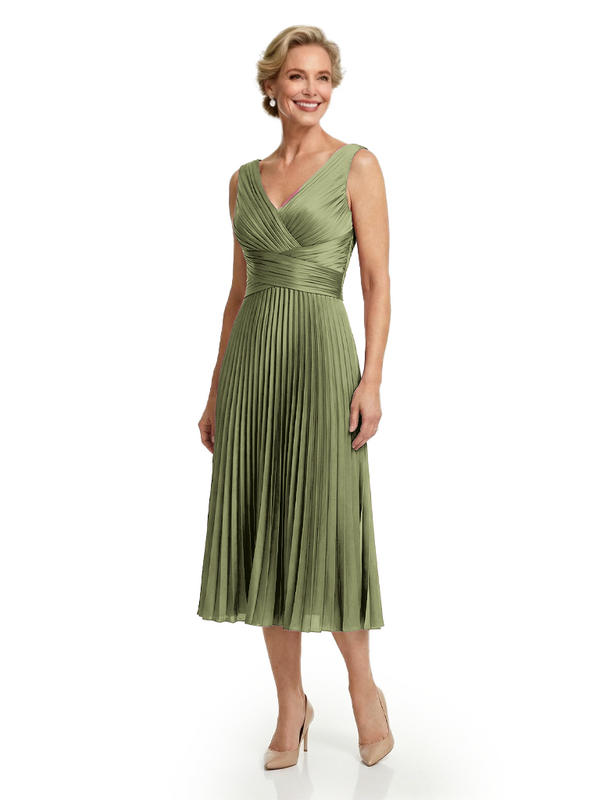 Chicsew Classy Sleeveless V-Neck Pleated Silky Satin Mother Of The Bride Midi Dress