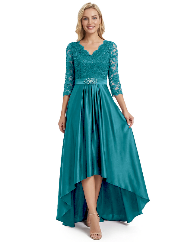 Chicsew Elegant Mother Of The Bride Dress V-Neck 3/4 Sleeve Lace Satin High-Low Gown