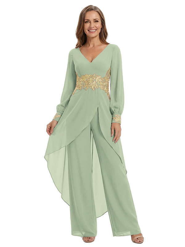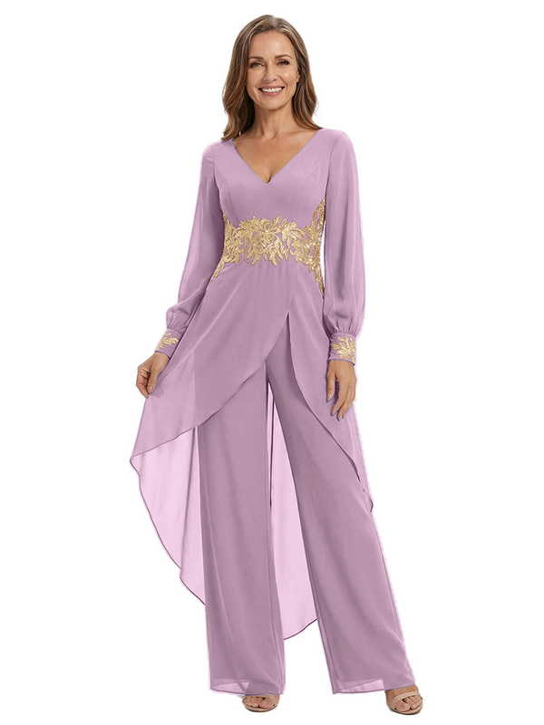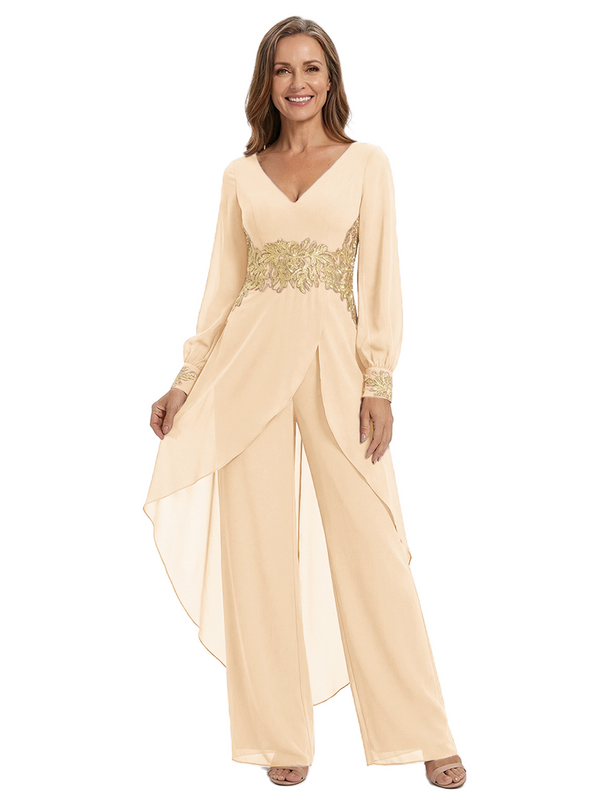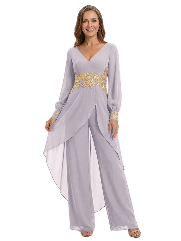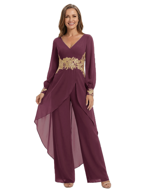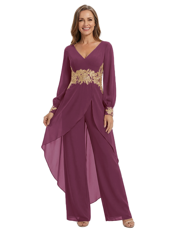 ChicSew Long Sleeves Jumpsuit For Mother Of The Bride V-Neck Lace Chiffon Pant Suit