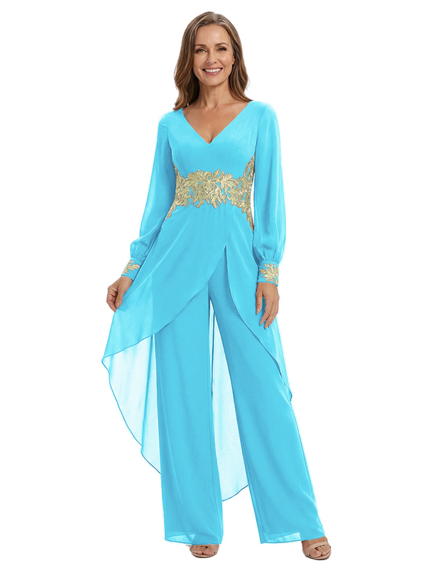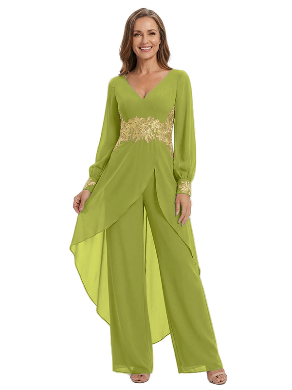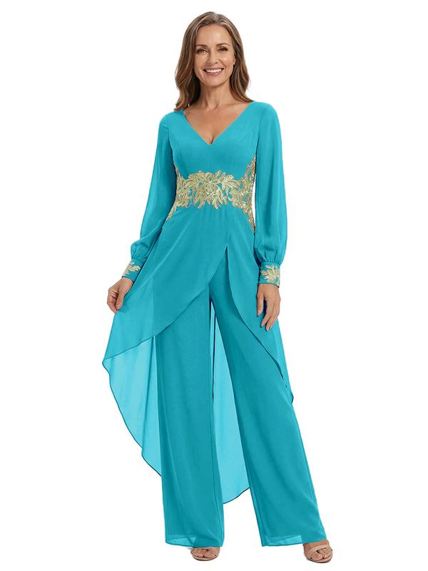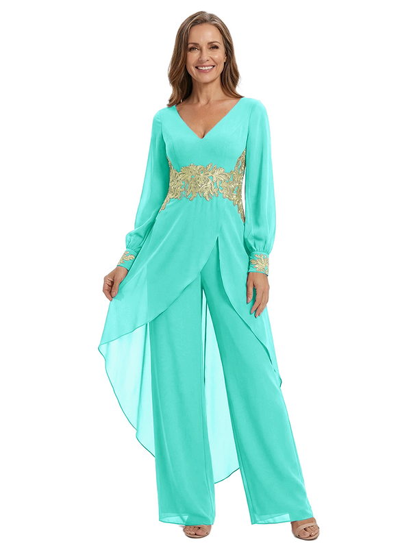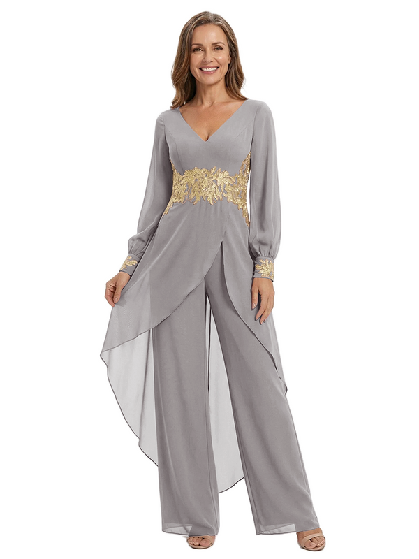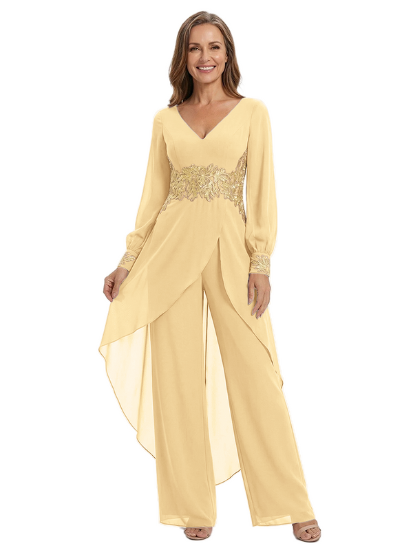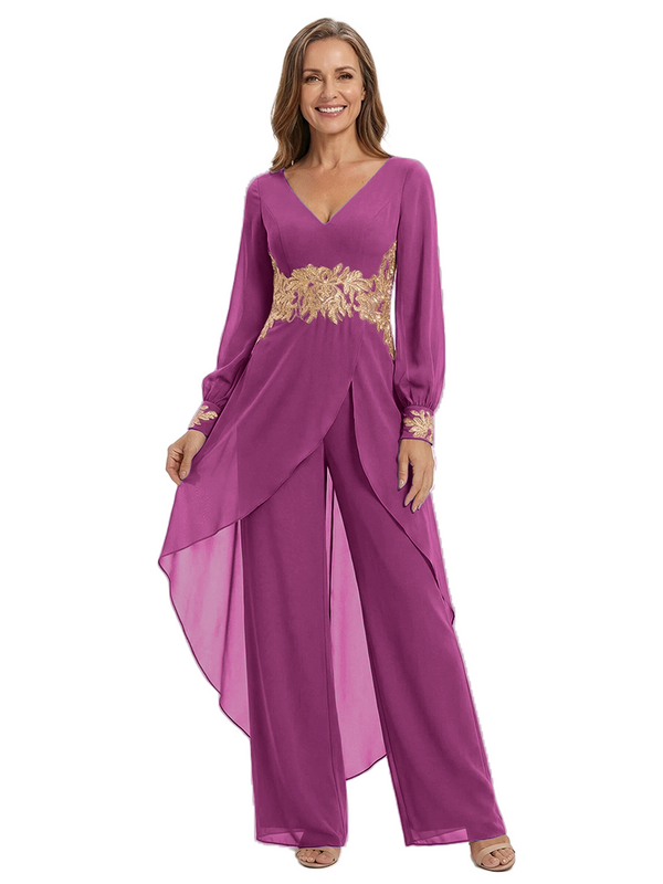 ChicSew Long Sleeves Jumpsuit For Mother Of The Bride V-Neck Lace Chiffon Pant Suit