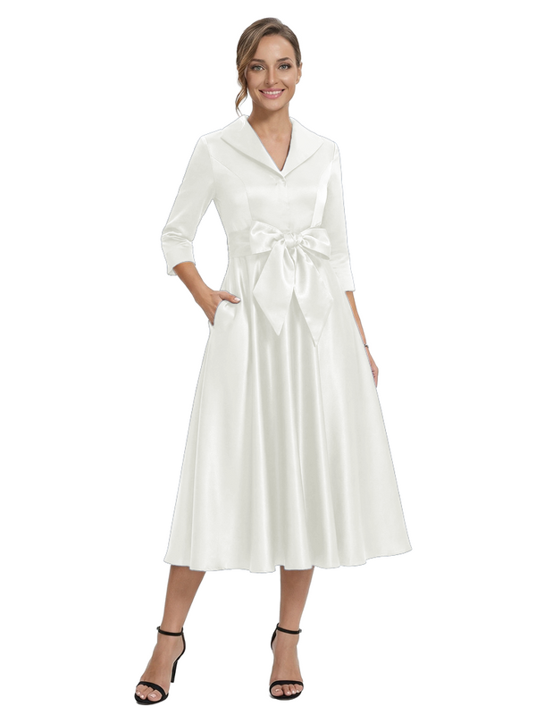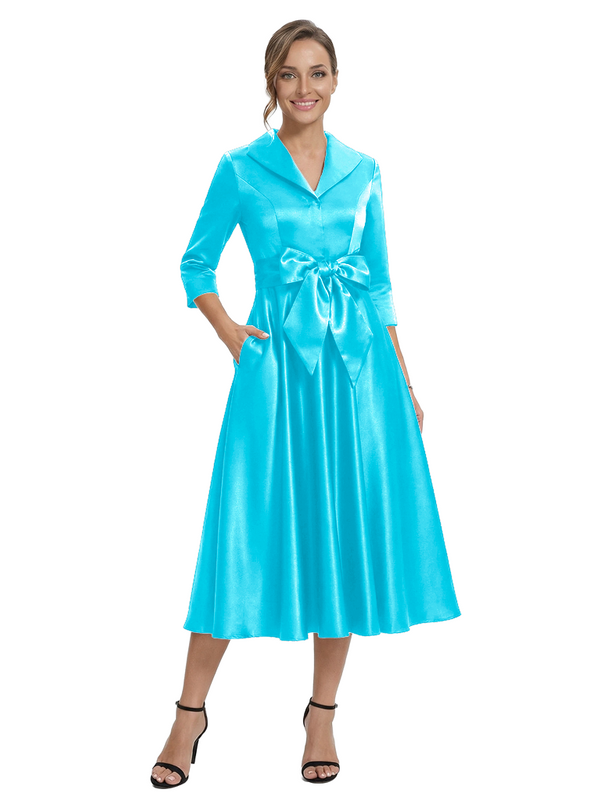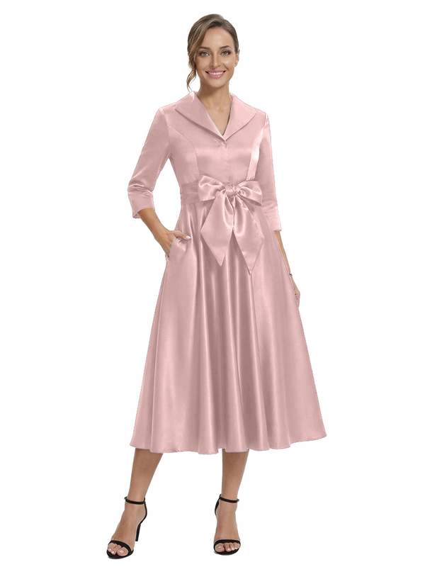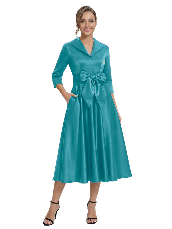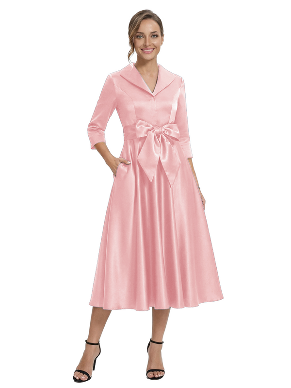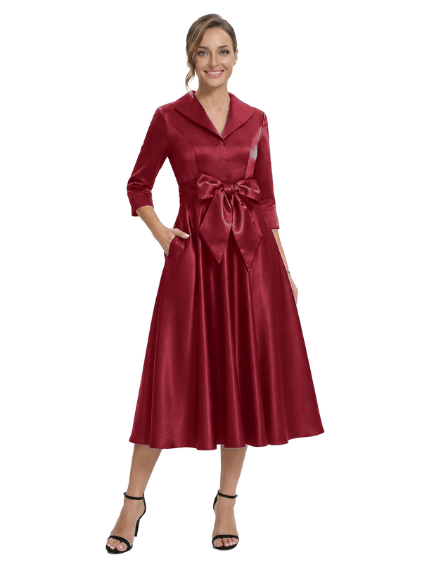 Chicsew Stylish Lapel 3/4 Sleeve Satin Mother of The Groom Dress Midi A-Line Bow Fancy Gown