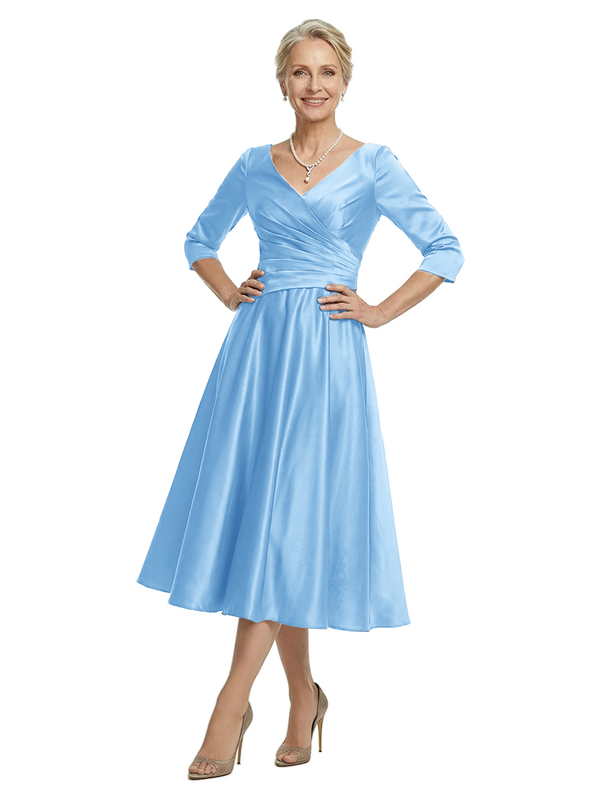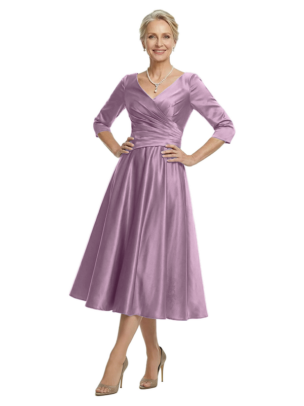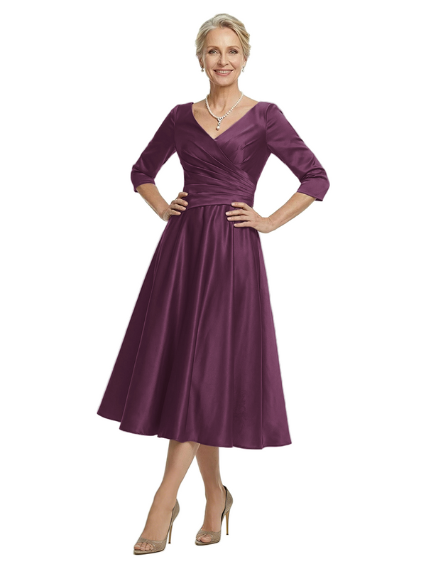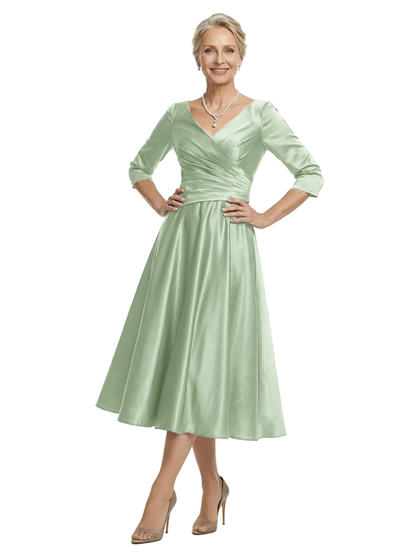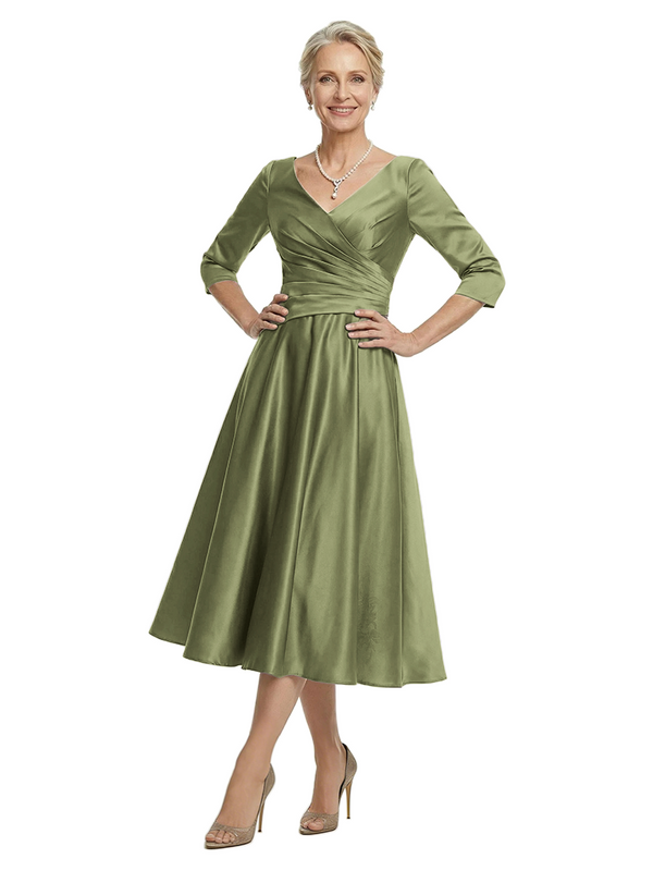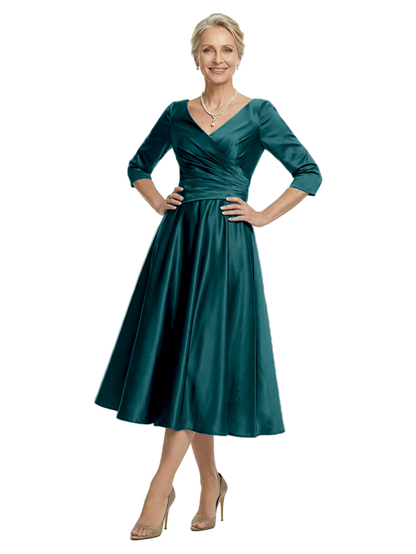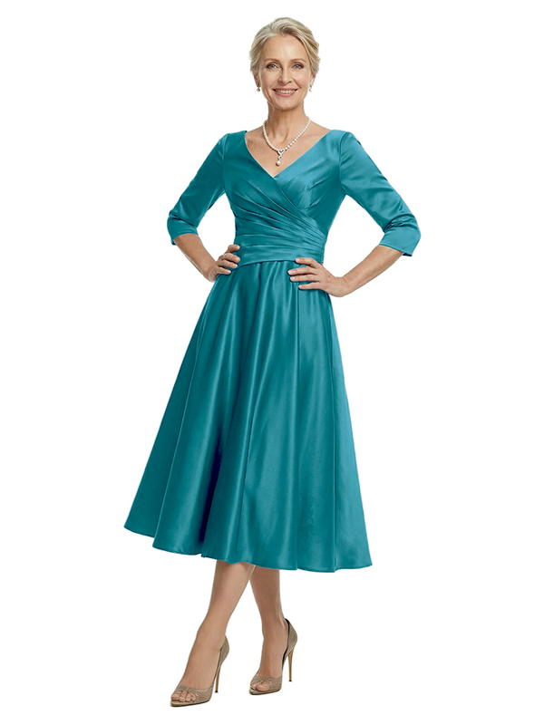 ChicSew V-Neck 3/4 Sleeve Satin Ruched Tea Length Elegant Mother of the Bride Dresses