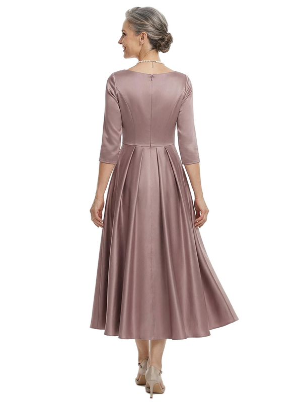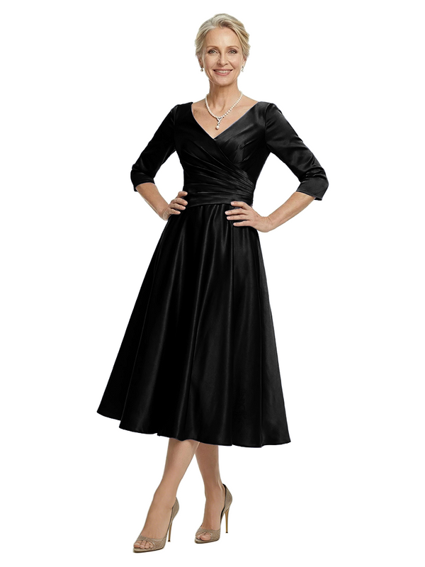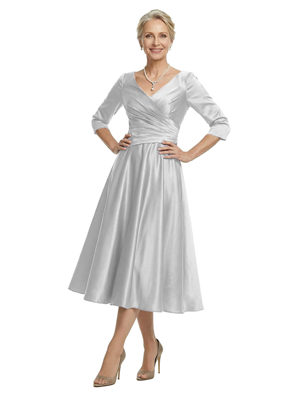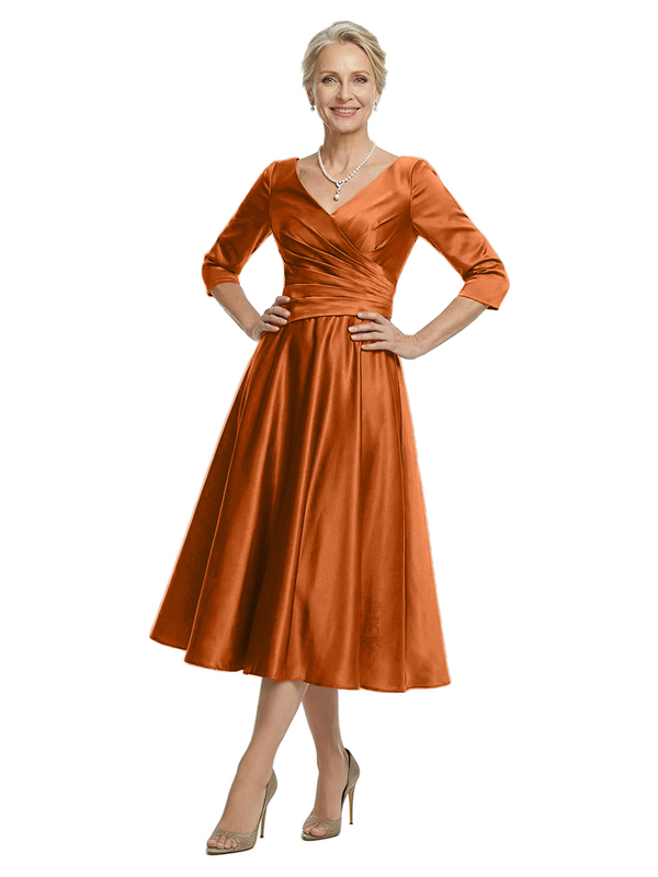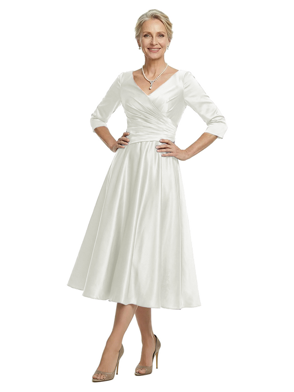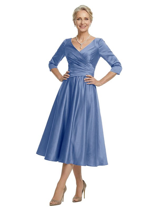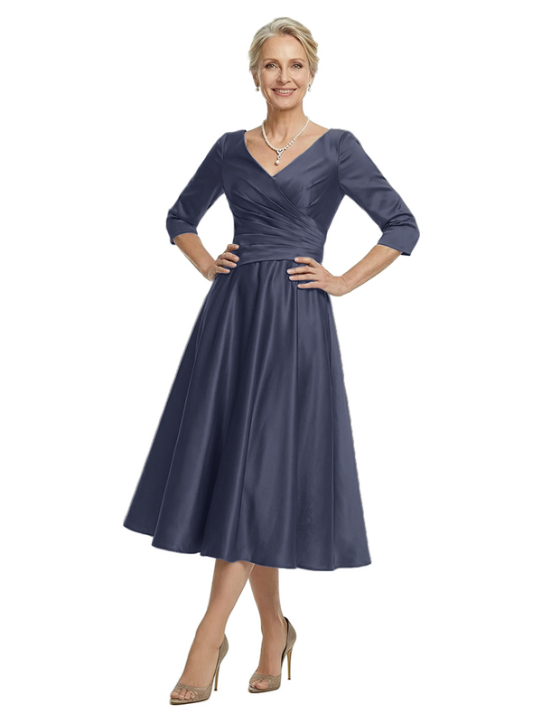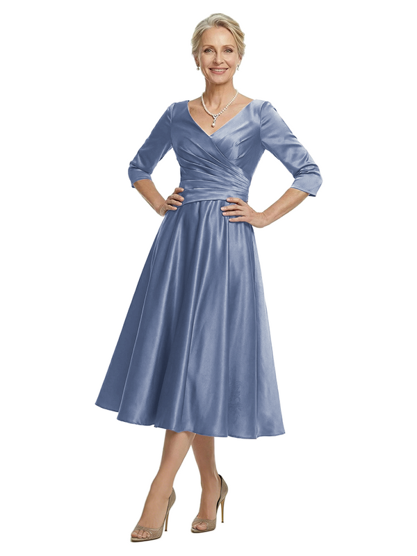 ChicSew V-Neck 3/4 Sleeve Satin Ruched Tea Length Elegant Mother of the Bride Dresses