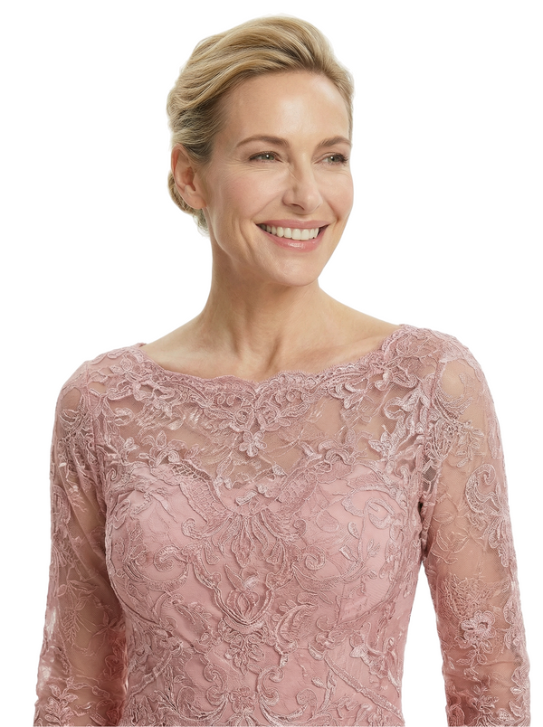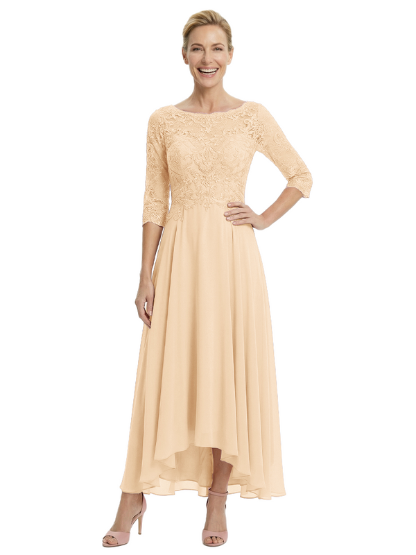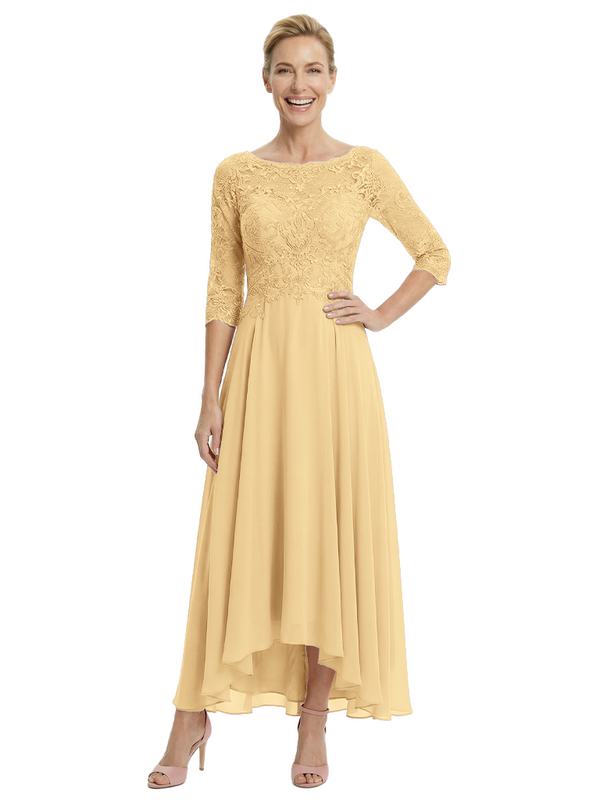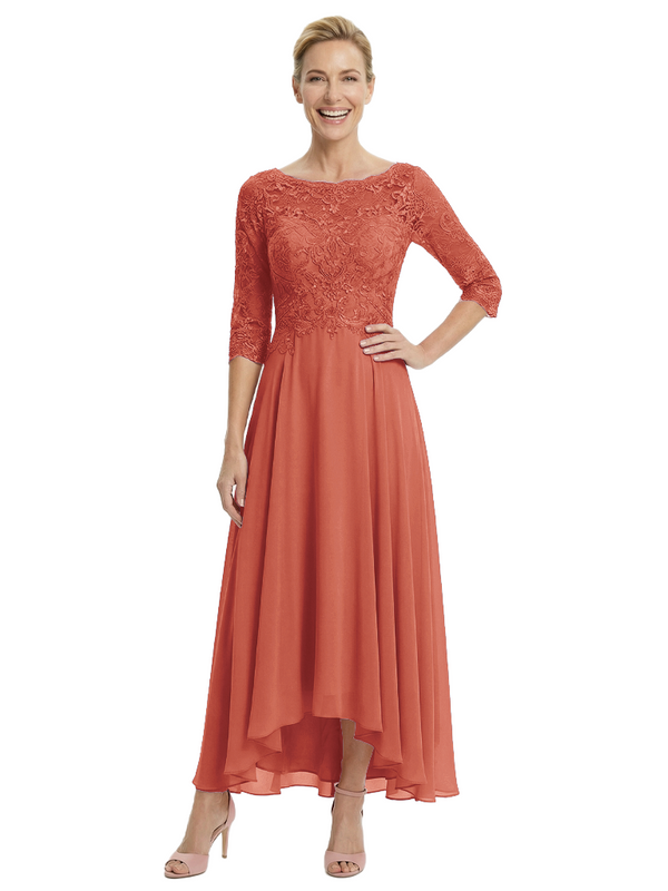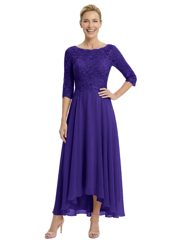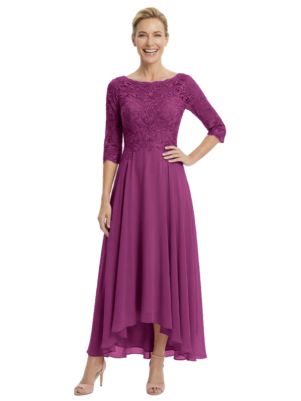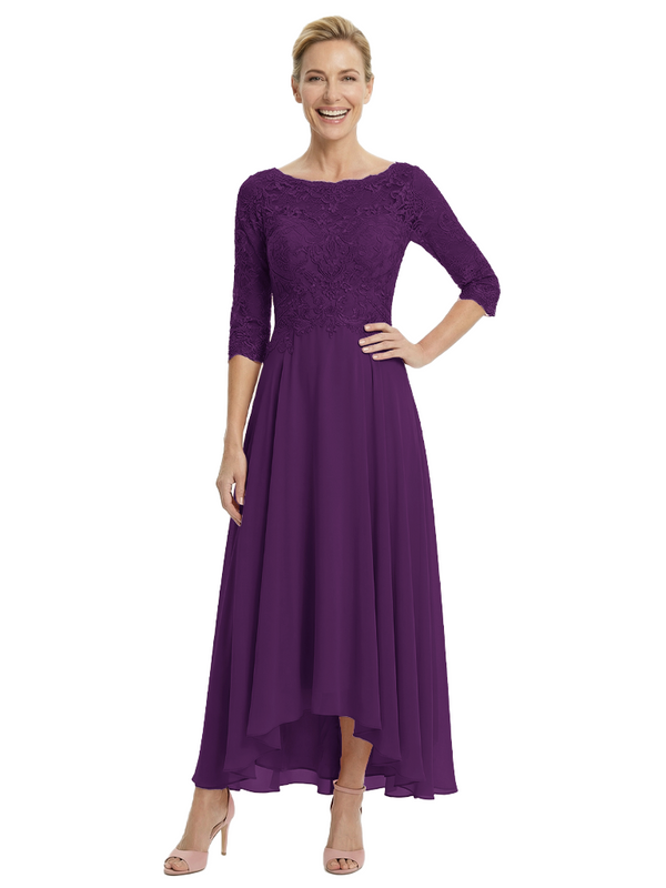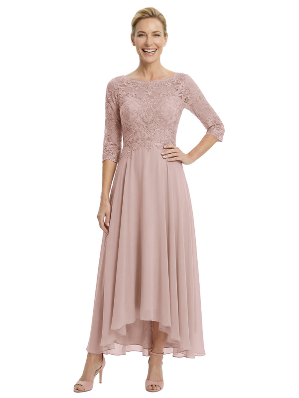 Elegant Lace 3/4 Sleeve Mother of The Groom Dress Pretty High-Low Chiffon Gown with Flowy Silhouette