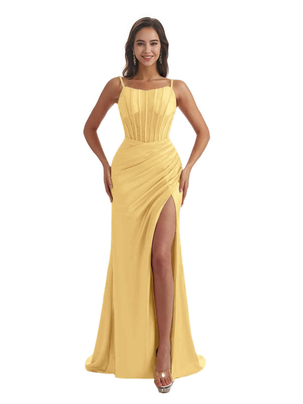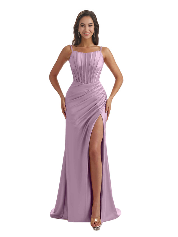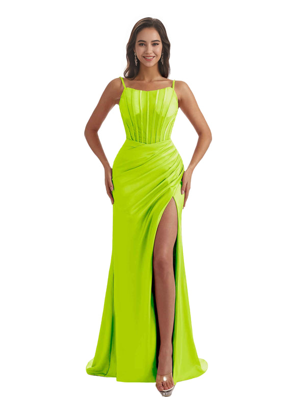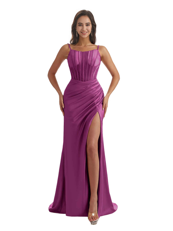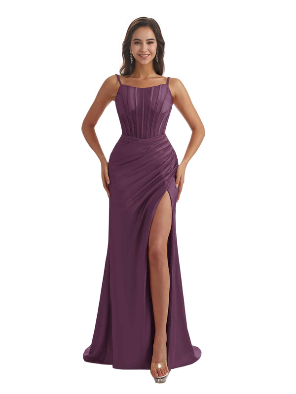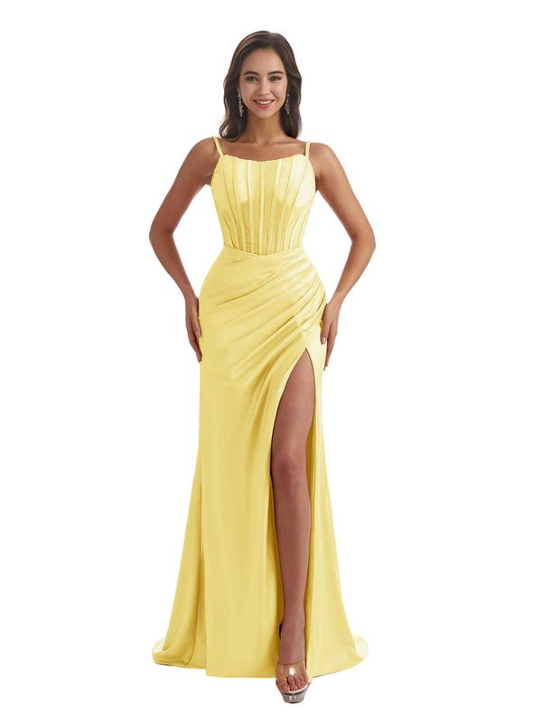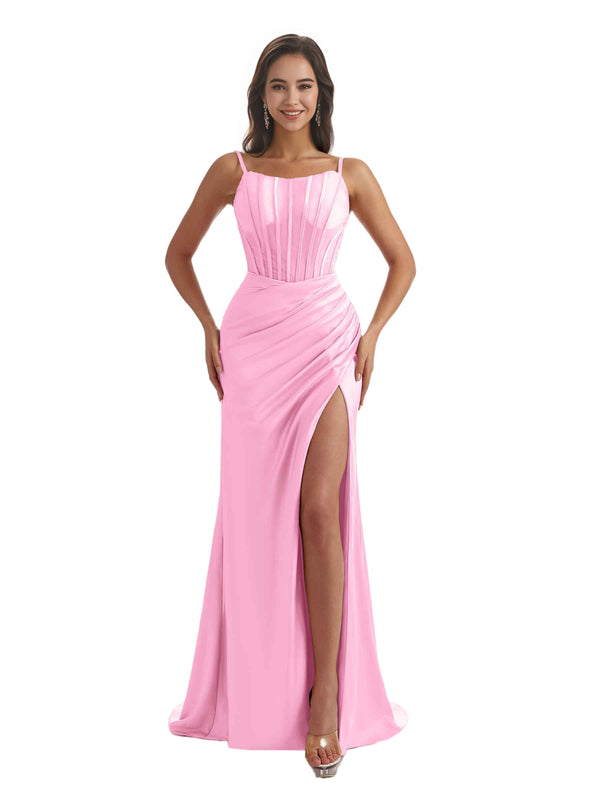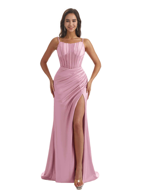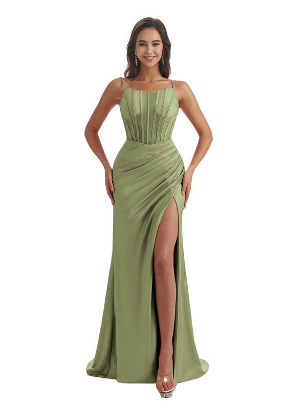 Elegant Mermaid Pleats Side Slit Soft Satin Long Bridesmaid Dress For Wedding Spaghetti Strap