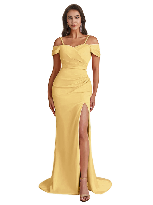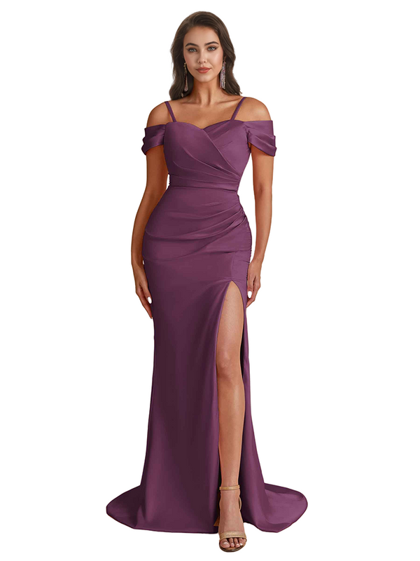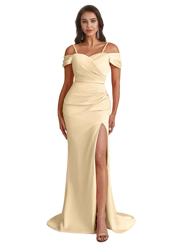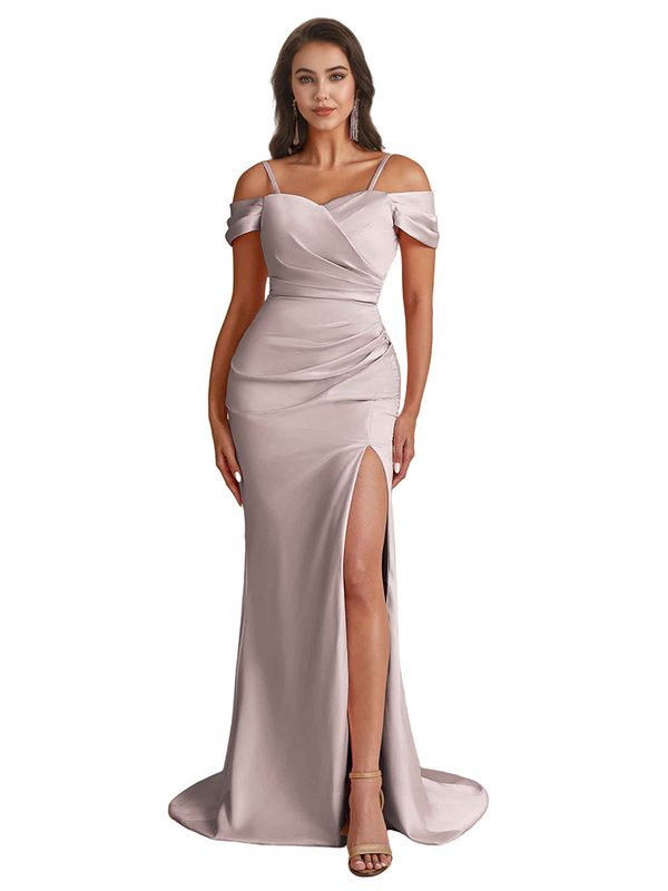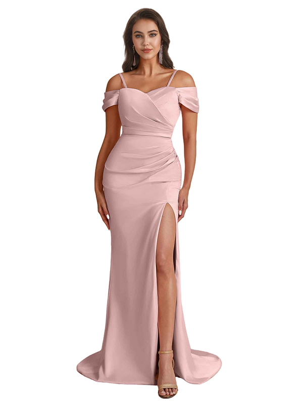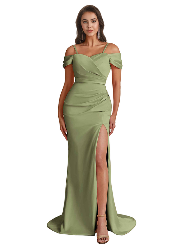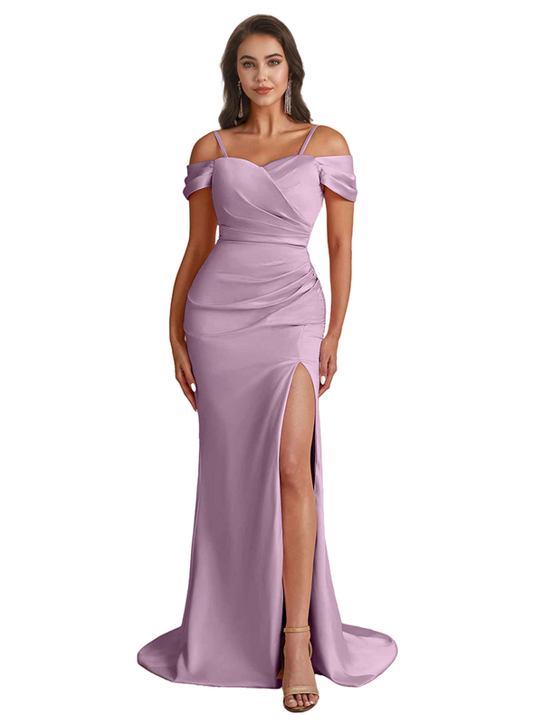 Elegant Cold Shoulder Mermaid Silky Satin Unique Long Bridesmaid Dresses Side Slit