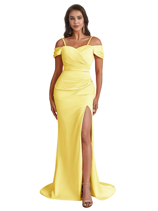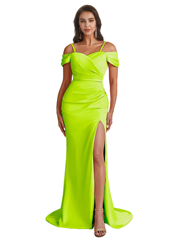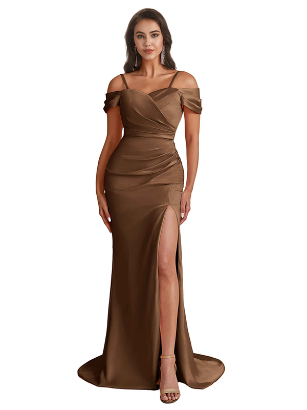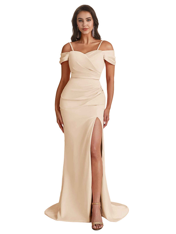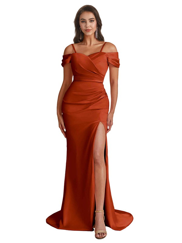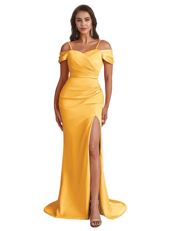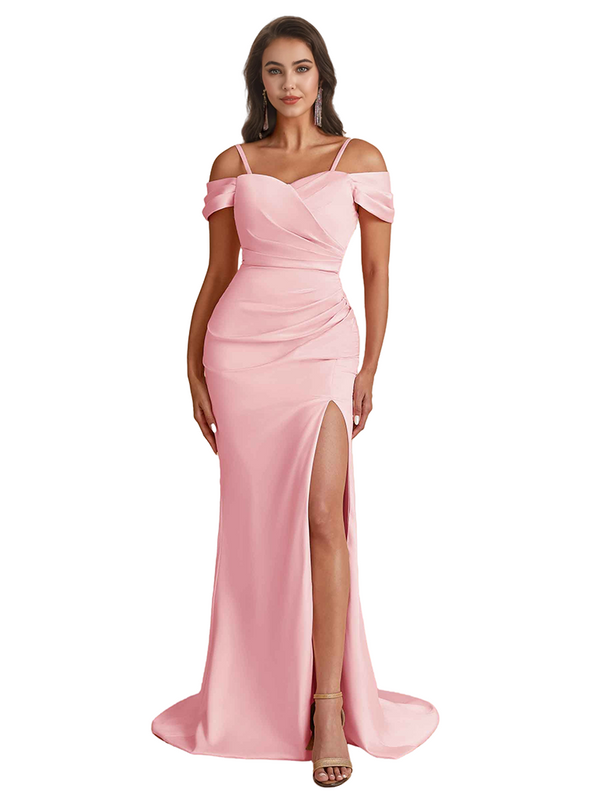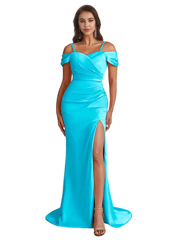Elegant Cold Shoulder Mermaid Silky Satin Unique Long Bridesmaid Dresses Side Slit