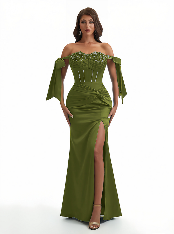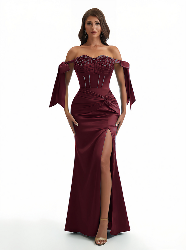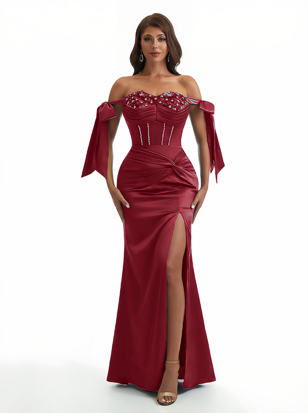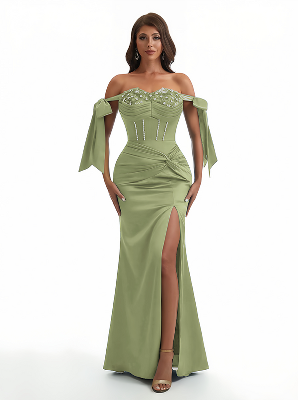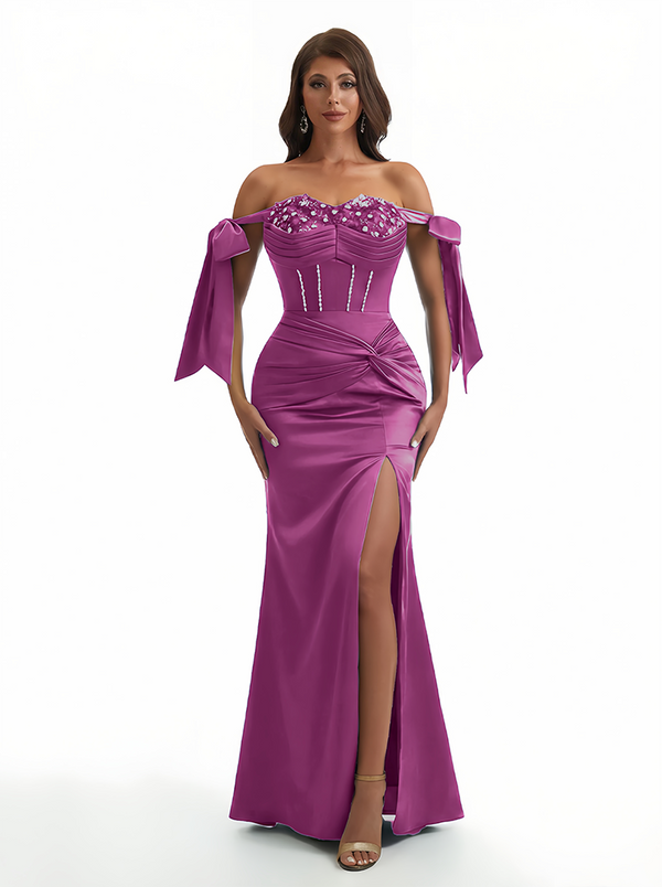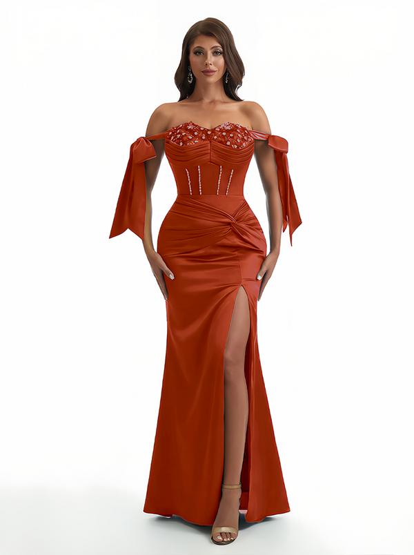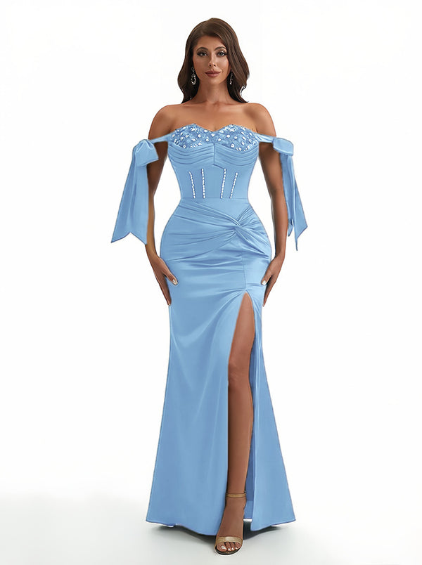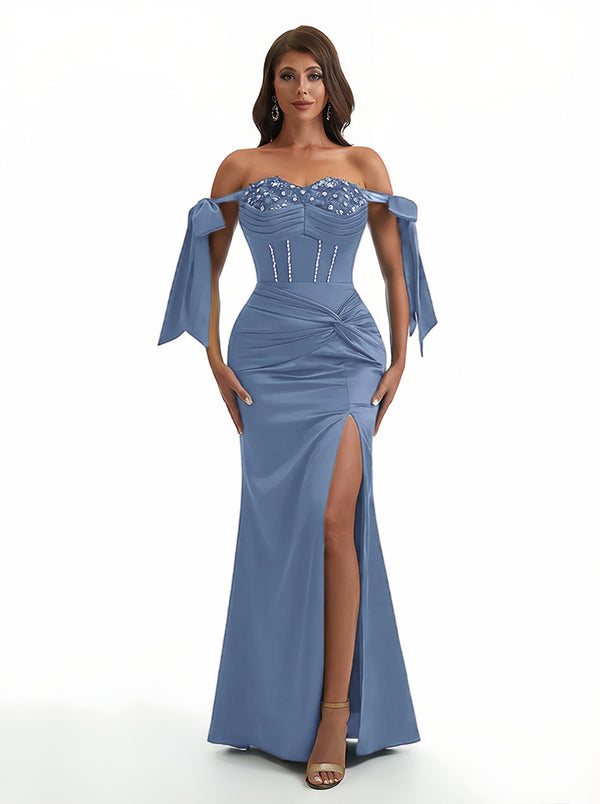 Sexy Off Shoulder Beading Ruched Satin Mermaid Silky Satin Long Formal Dresses Side Slit